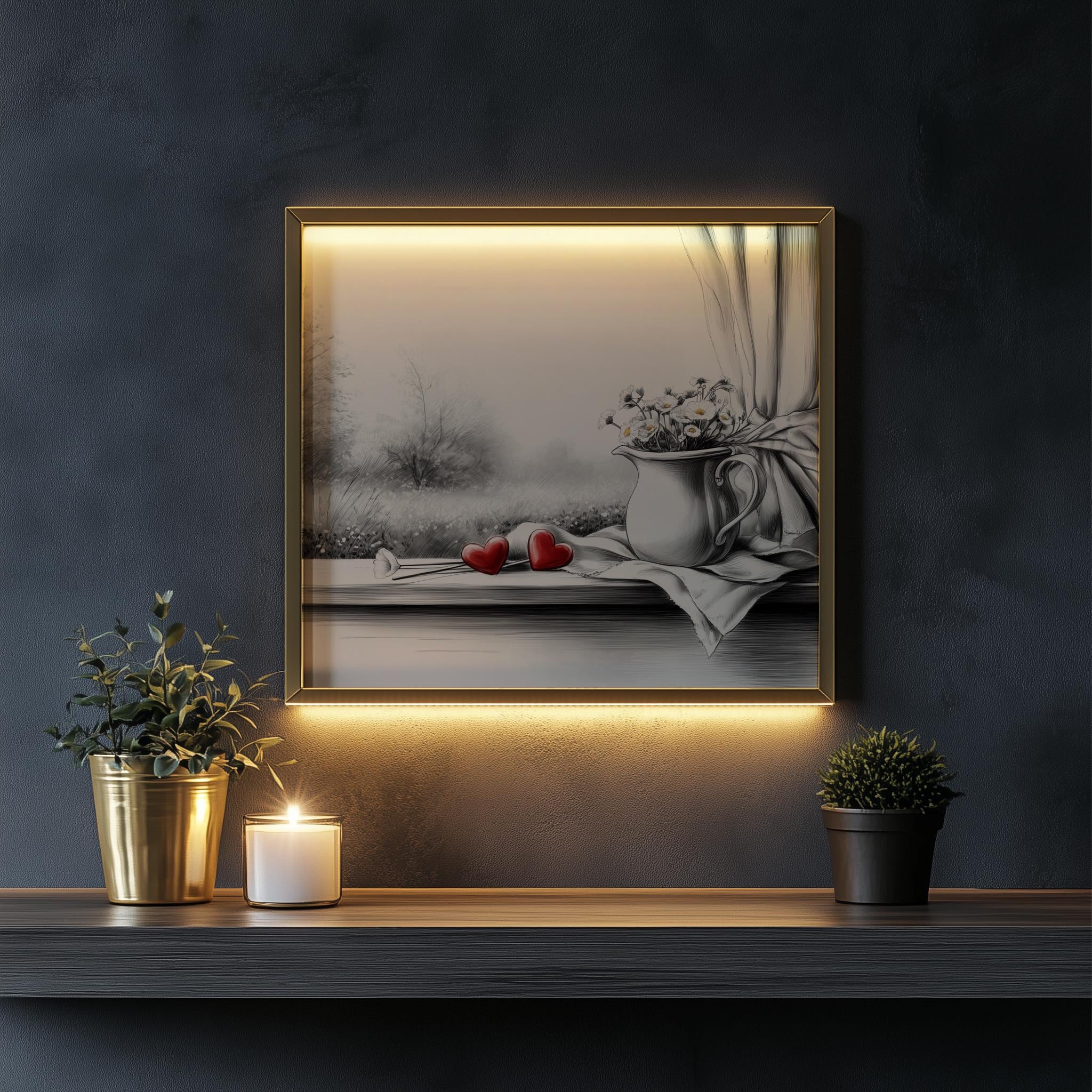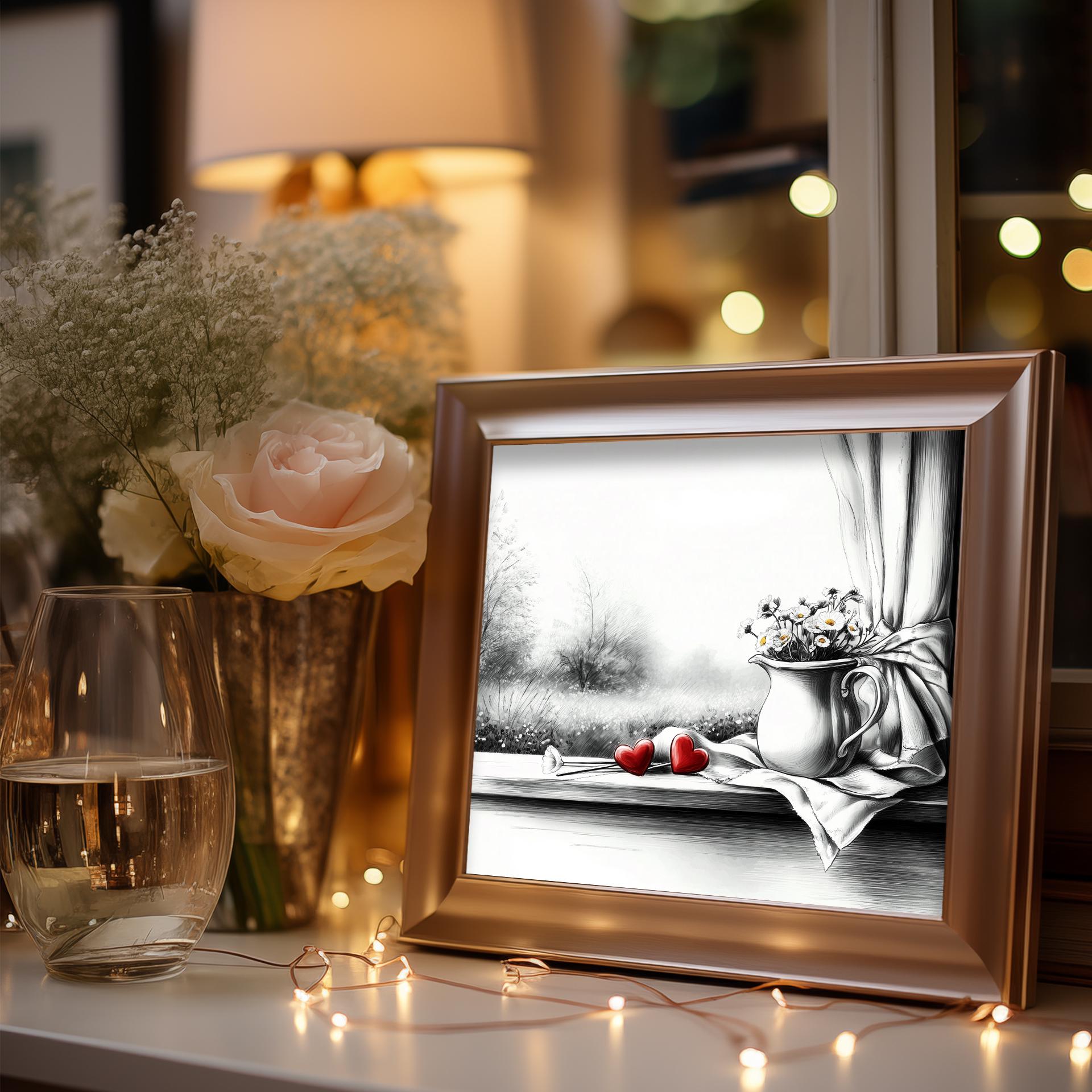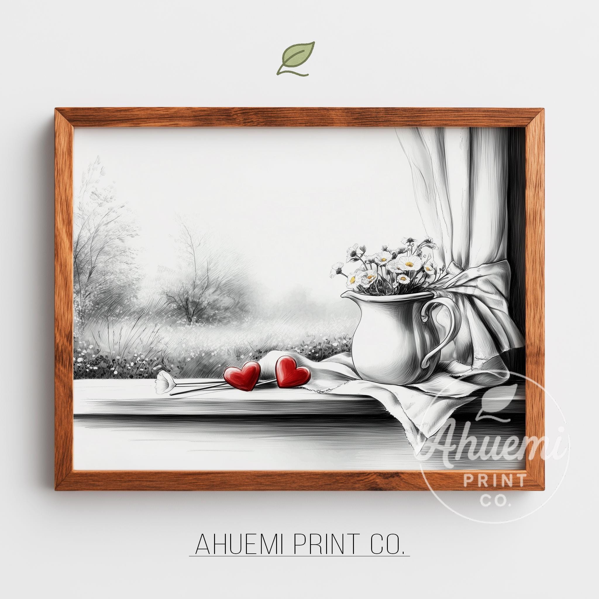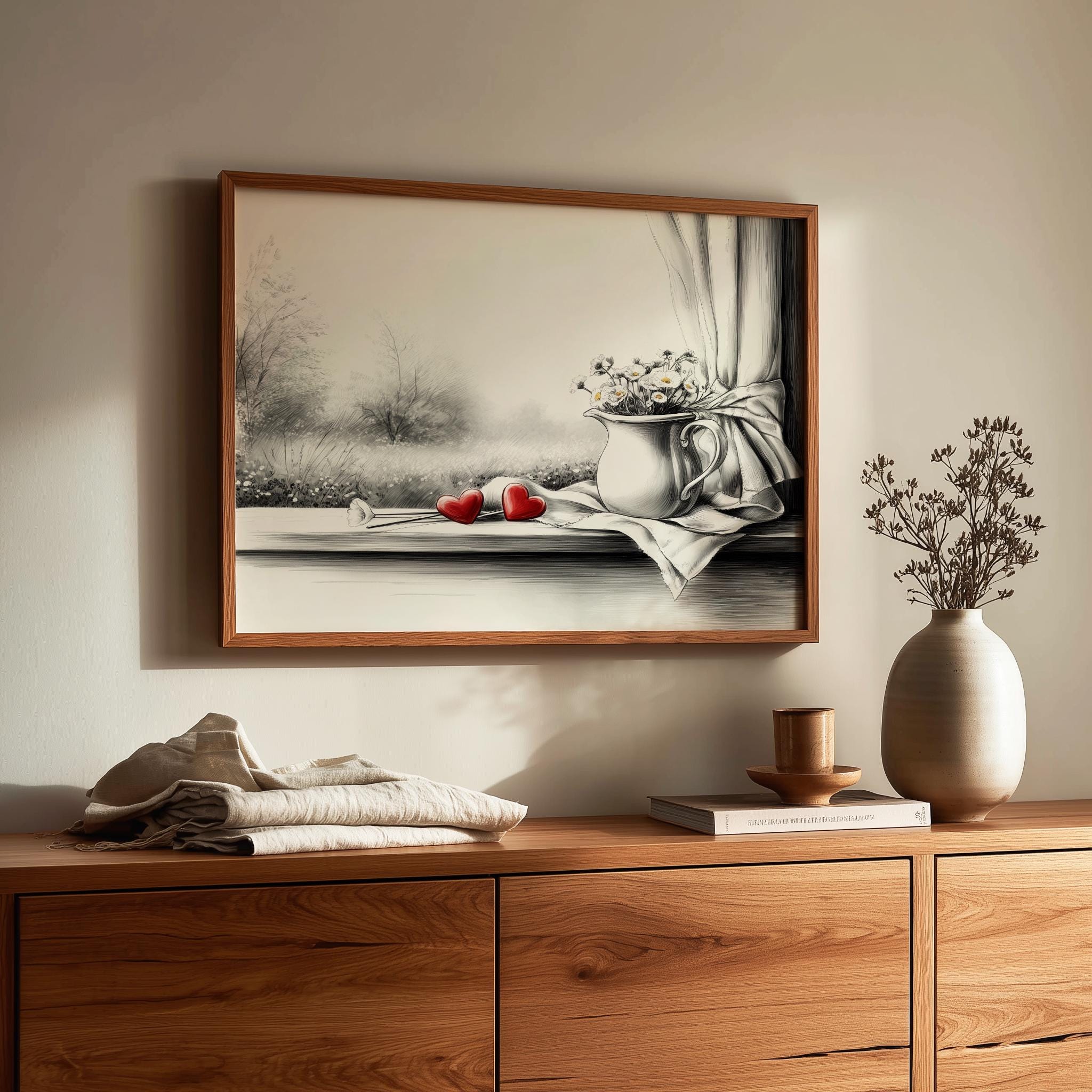 Immerse yourself in the charm with this rustic painting of a cozy white enamel pitcher filled with heart-shaped lollipops. An instantly downloadable print, it's perfect for elevating your decor with budget-friendly charm. This gives you the flexibility to customize the size, frame, and material according to your personal taste and space, ensuring a perfect fit for your walls.