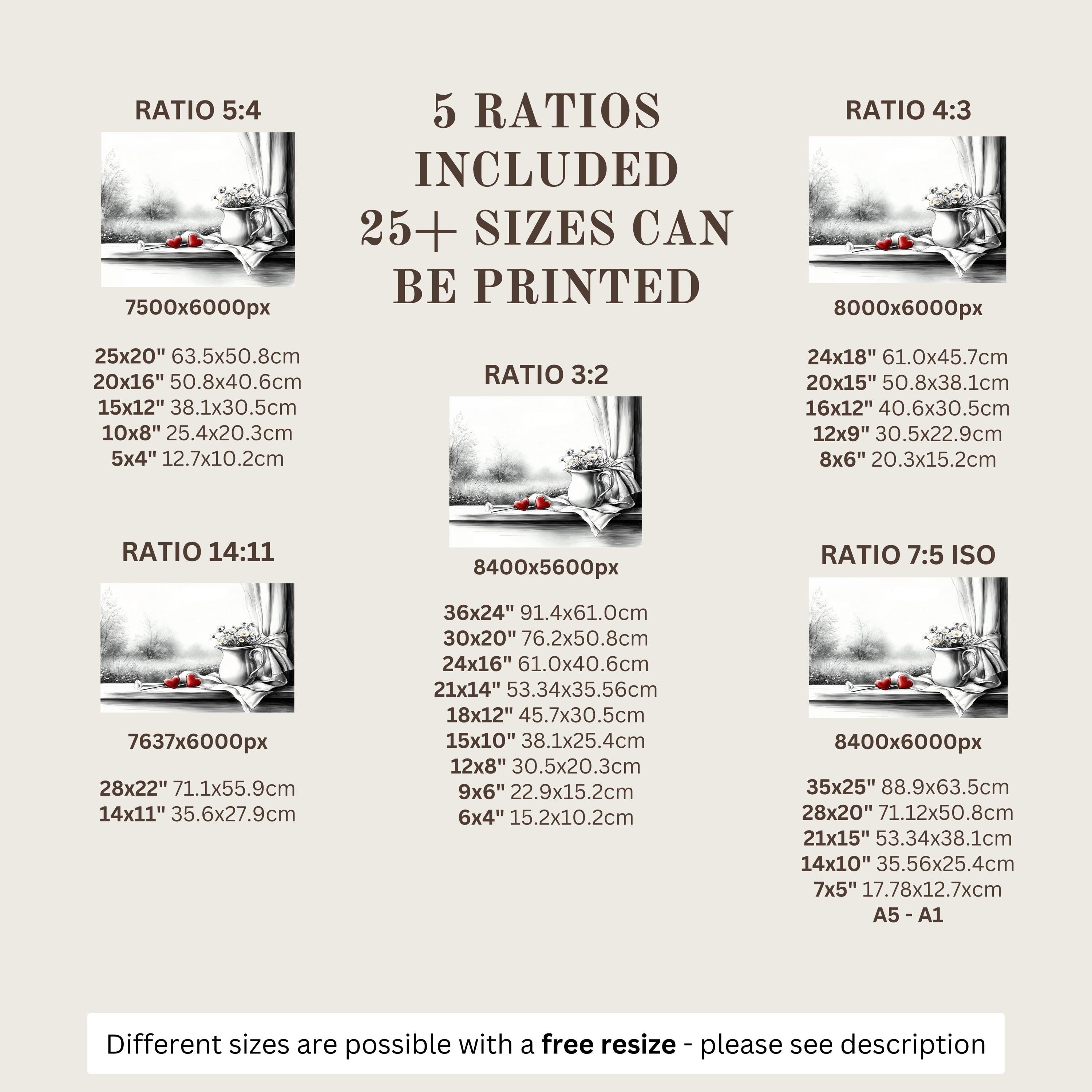 Each artwork includes 5 aspect ratios with 25+ print sizes. Most standard frames are covered. One custom resize per purchase available—message before ordering.