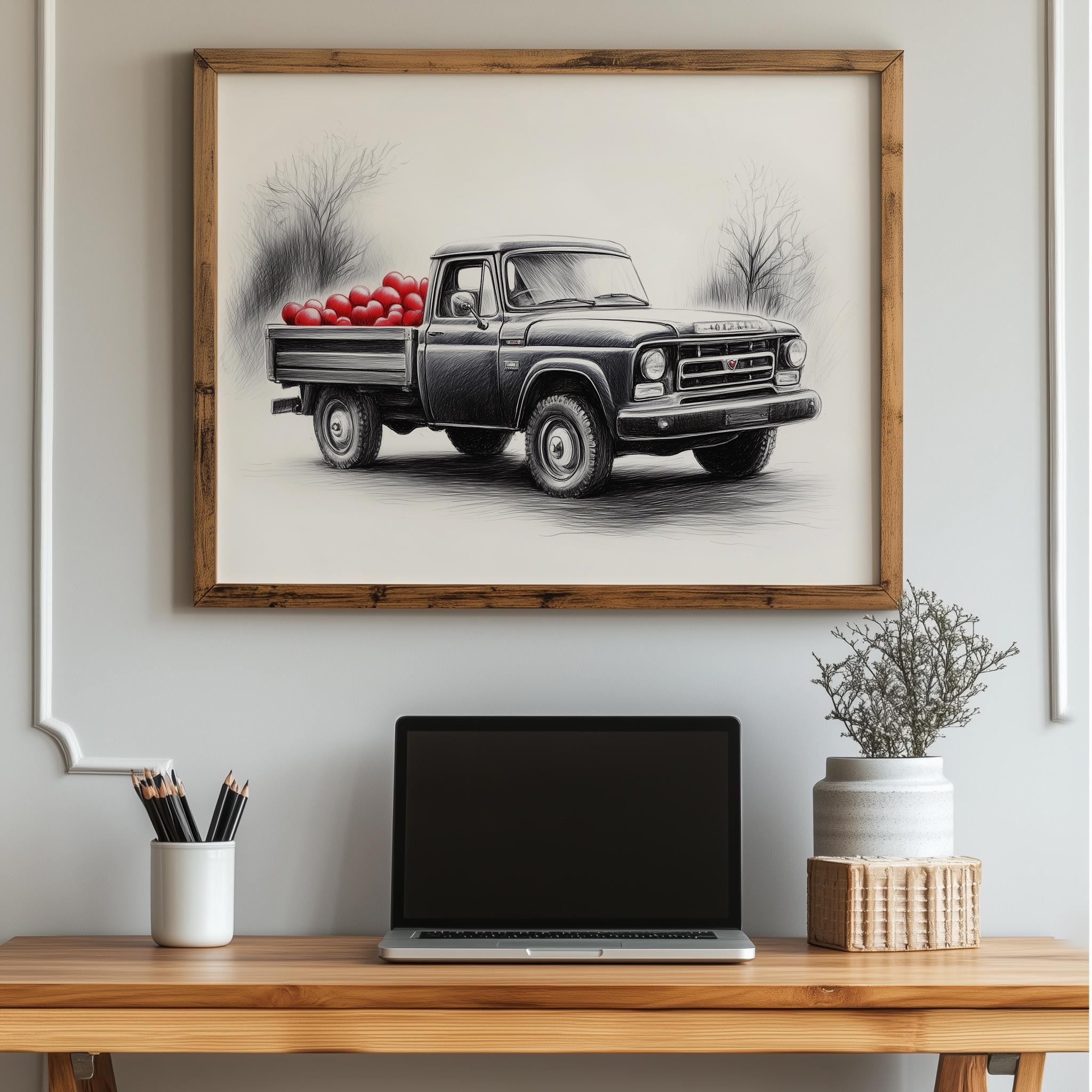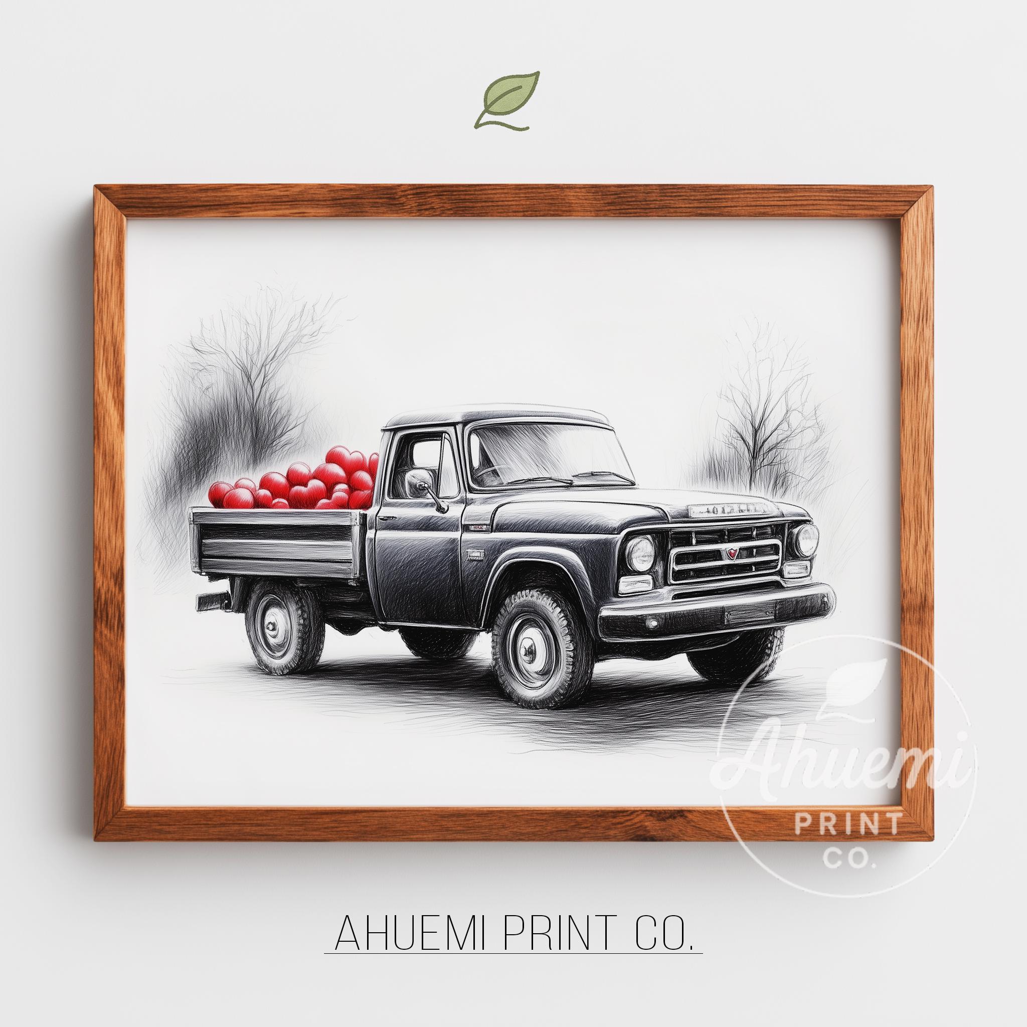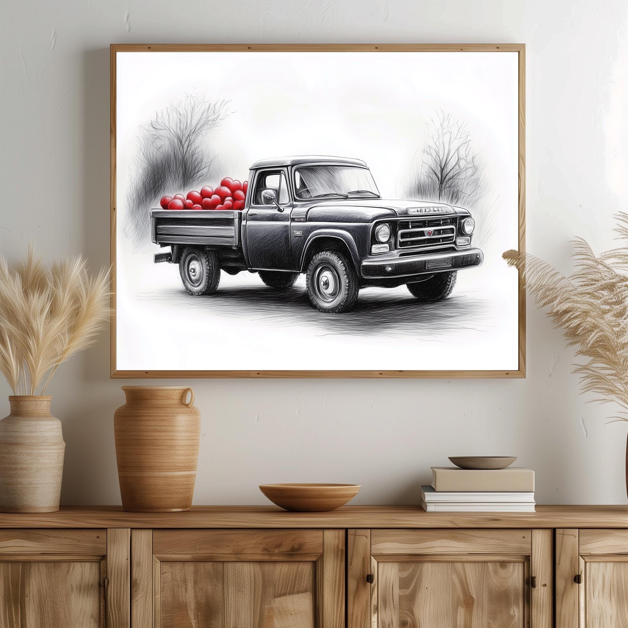 Immerse yourself in the charm with this rustic painting of a vintage pickup truck carrying heart-shaped balloons. An instantly downloadable print, it's perfect for elevating your decor with budget-friendly charm. This gives you the flexibility to customize the size, frame, and material according to your personal taste and space, ensuring a perfect fit for your walls.