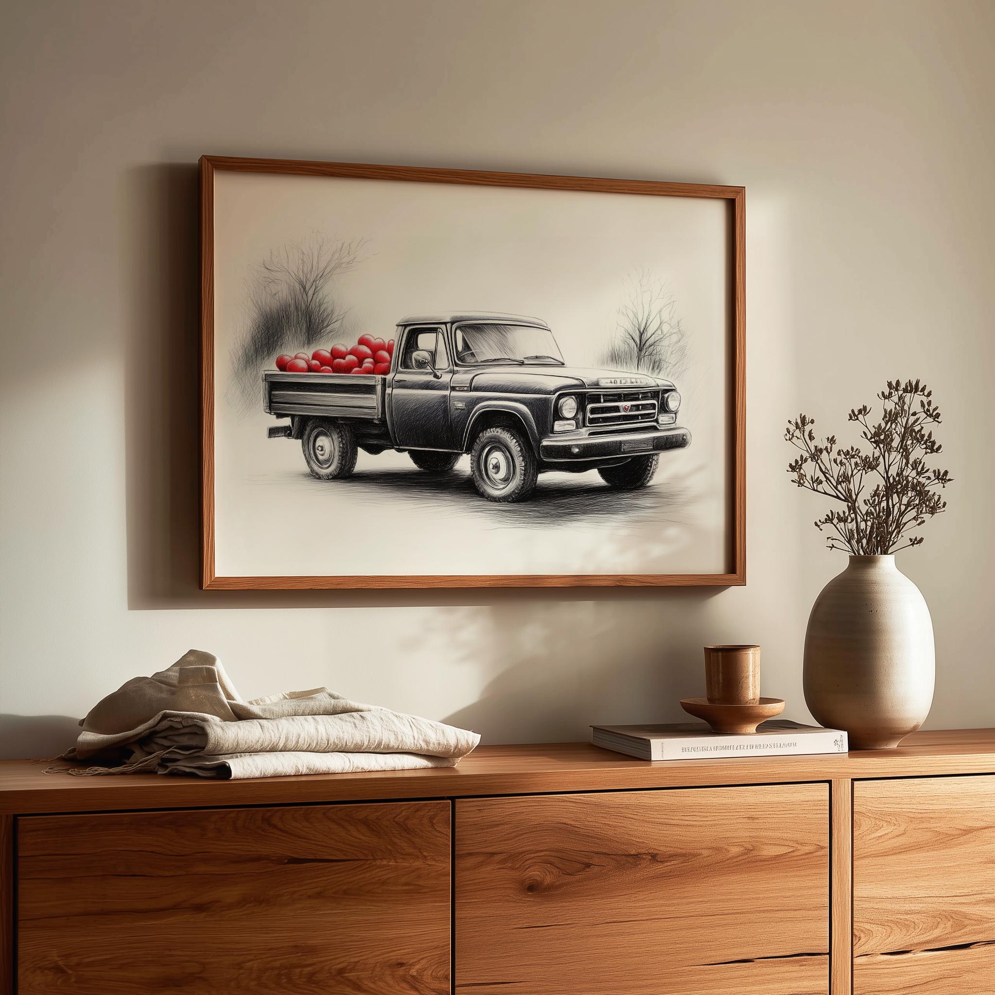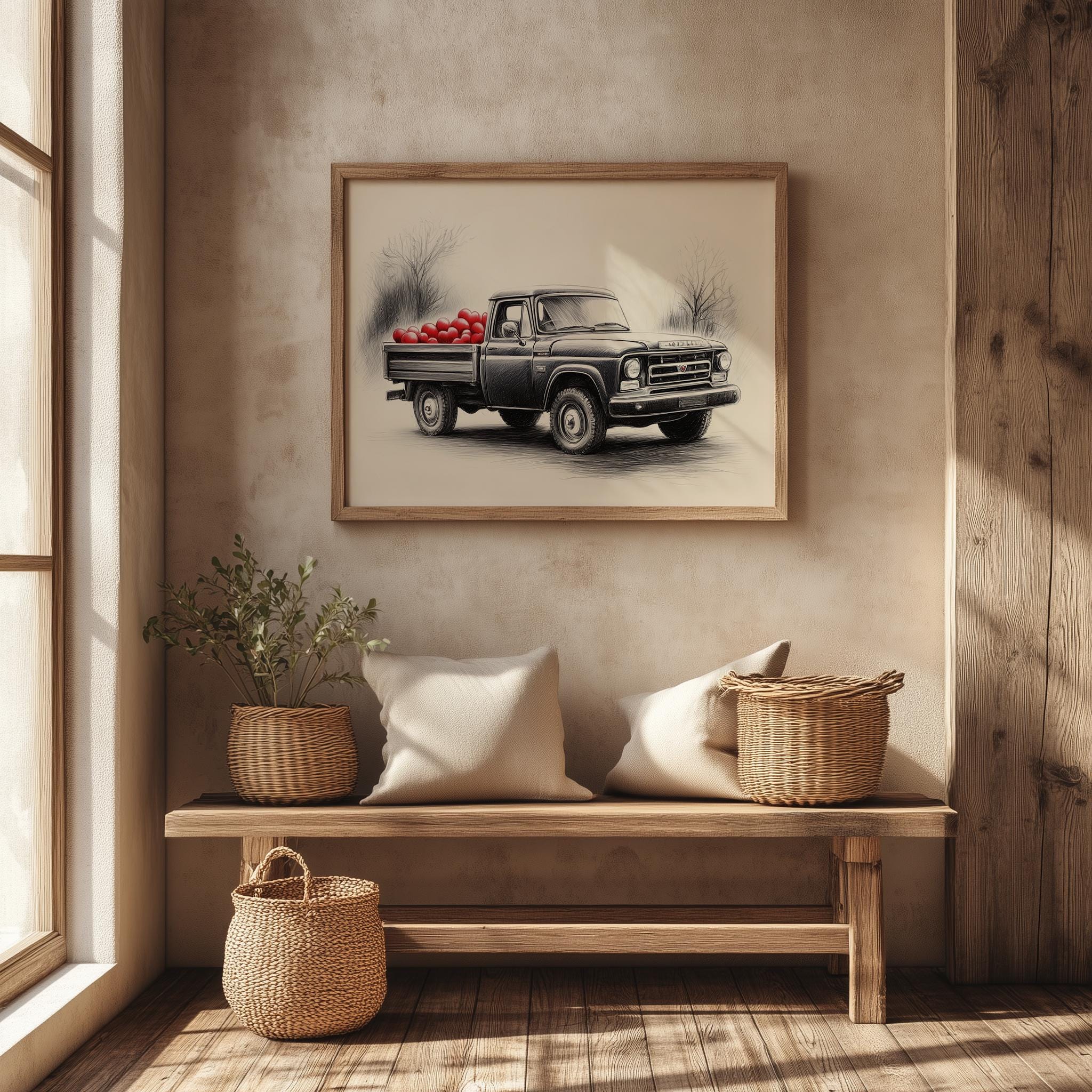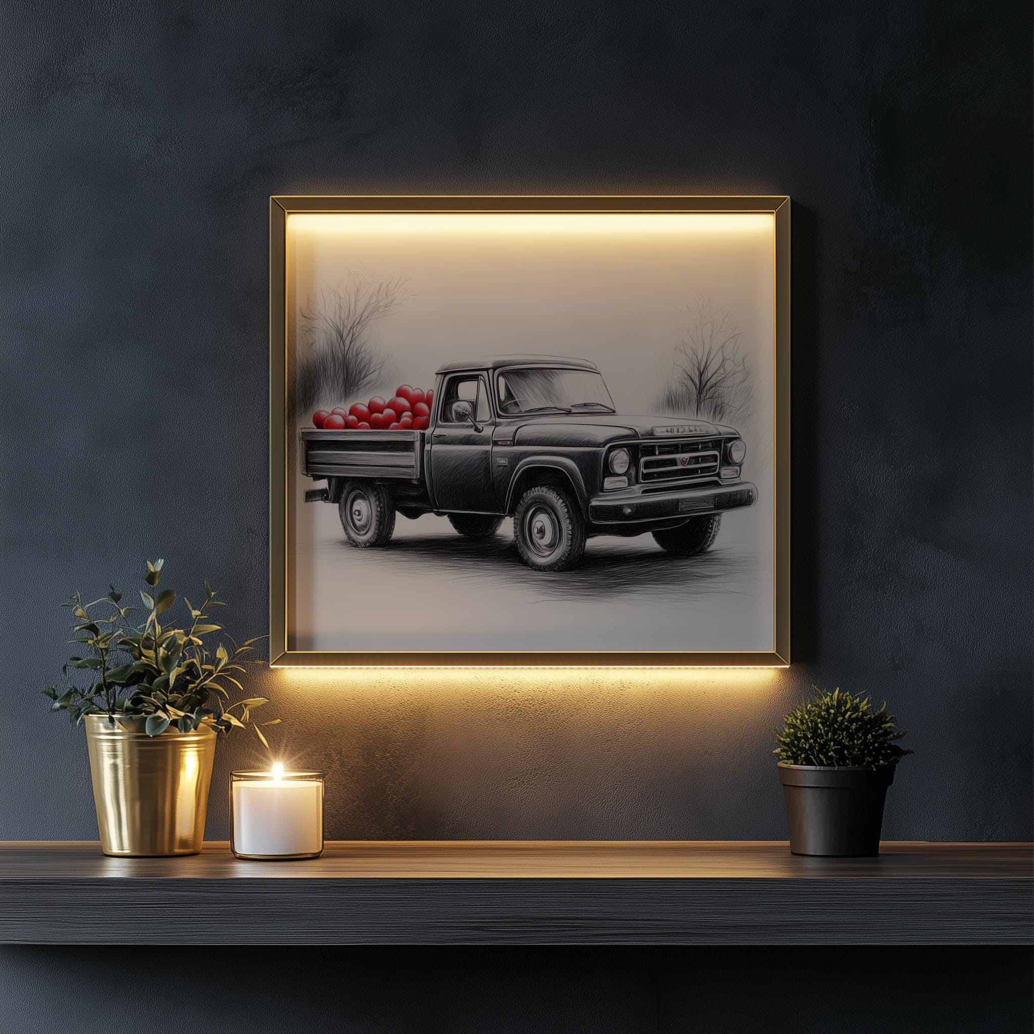 Immerse yourself in the charm with this rustic painting of a vintage pickup truck carrying heart-shaped balloons. An instantly downloadable print, it's perfect for elevating your decor with budget-friendly charm. This gives you the flexibility to customize the size, frame, and material according to your personal taste and space, ensuring a perfect fit for your walls.