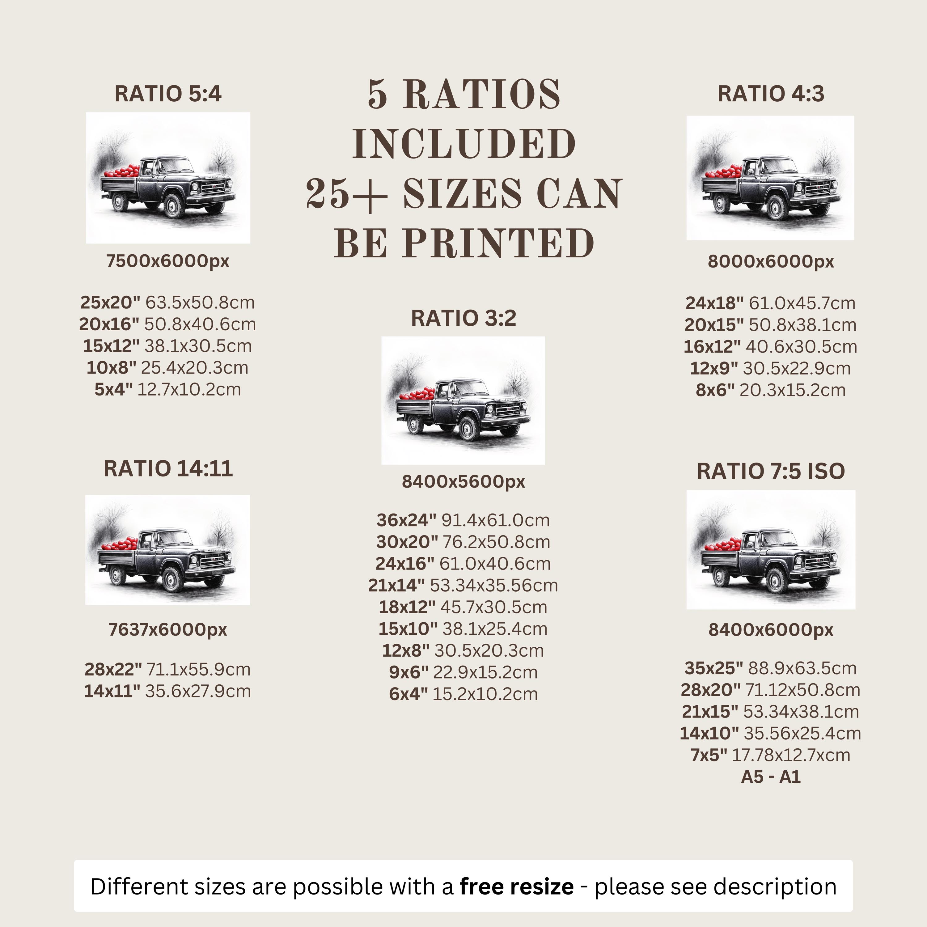 Each artwork includes 5 aspect ratios with 25+ print sizes. Most standard frames are covered. One custom resize per purchase available—message before ordering.