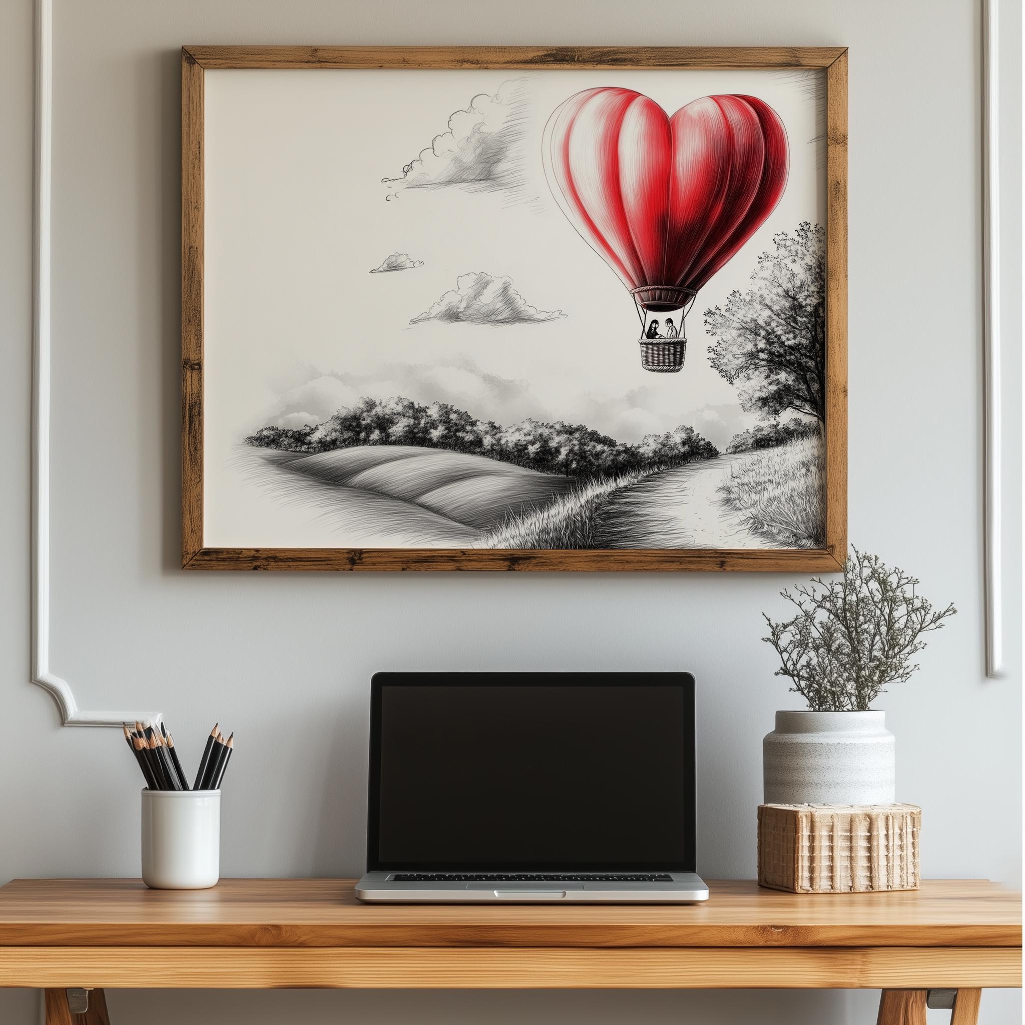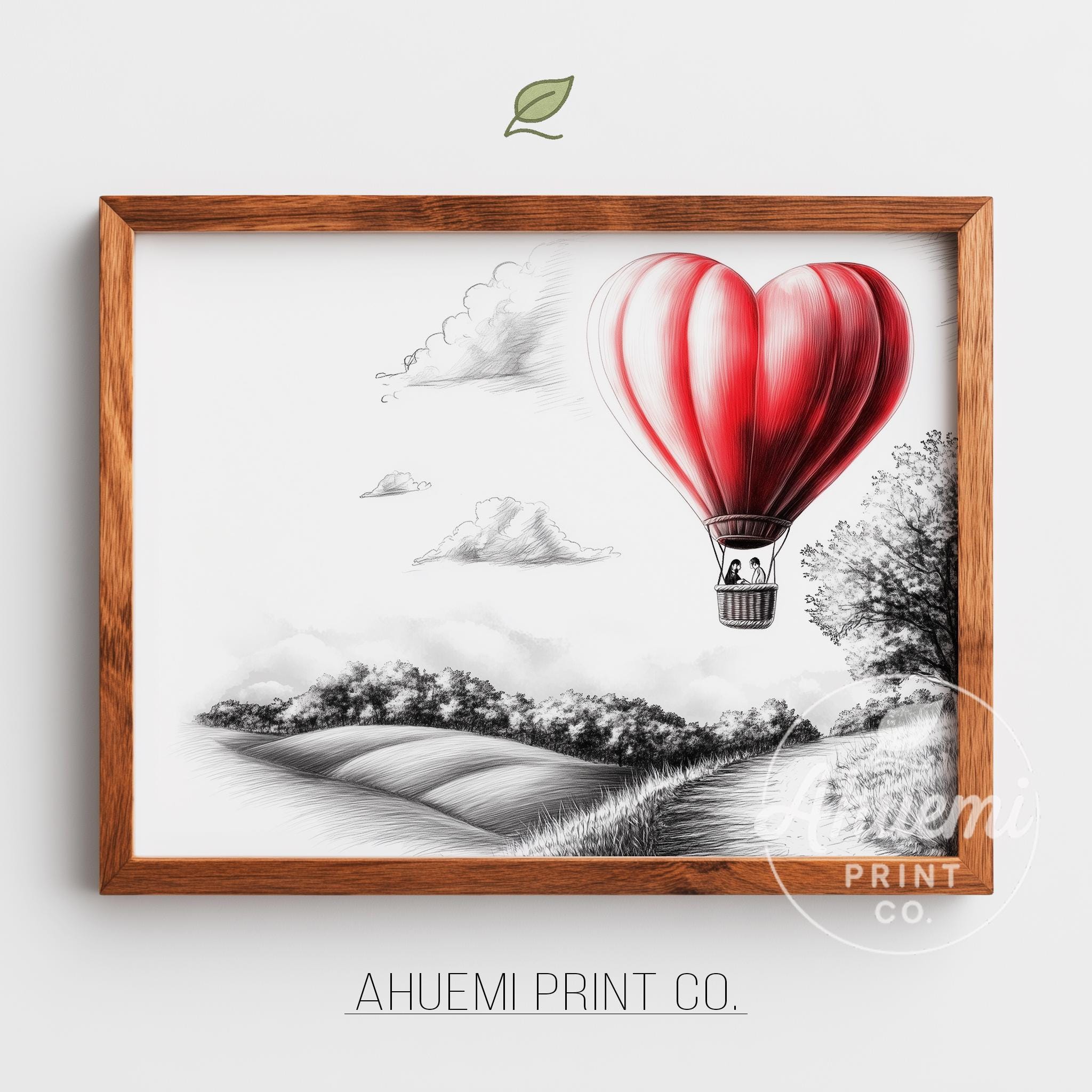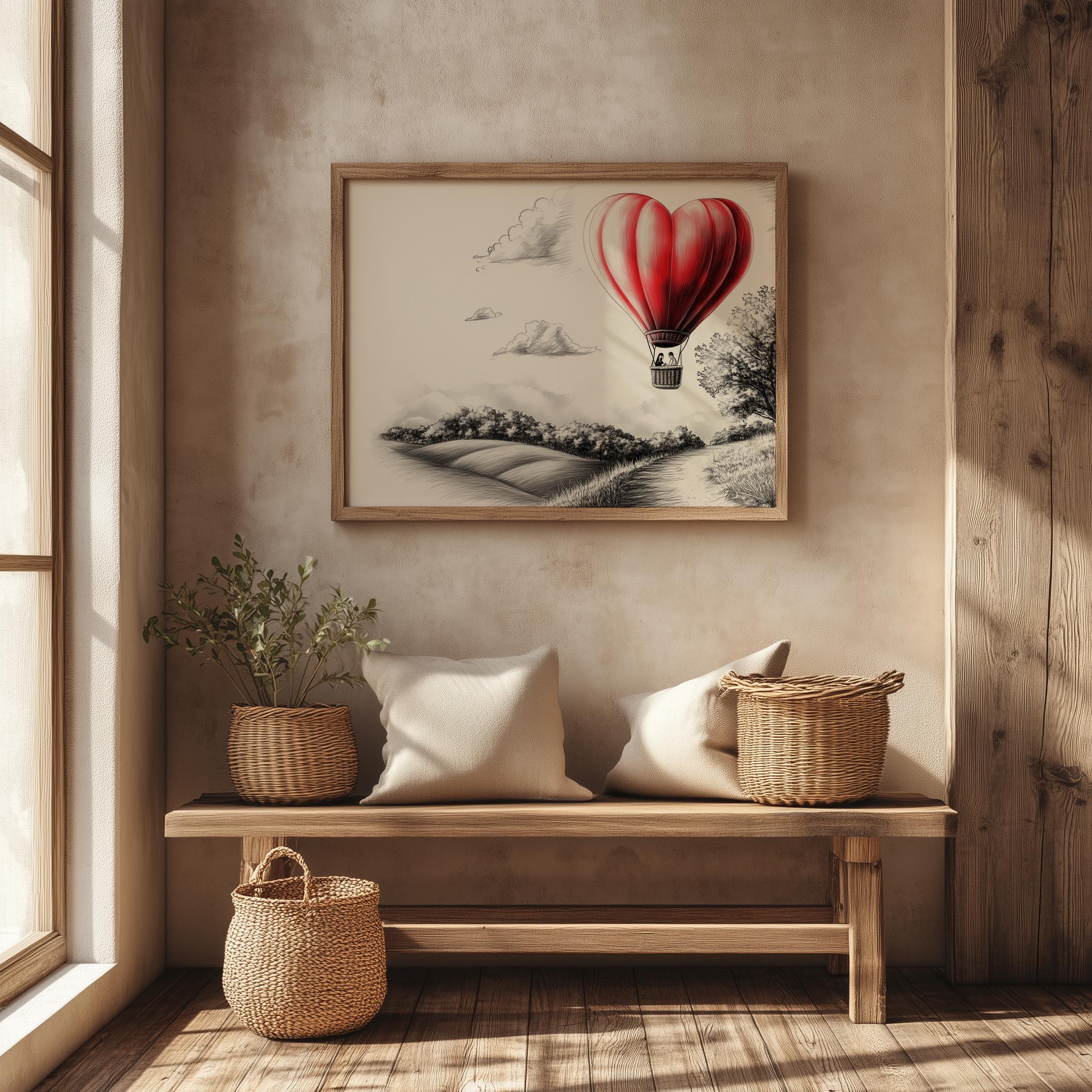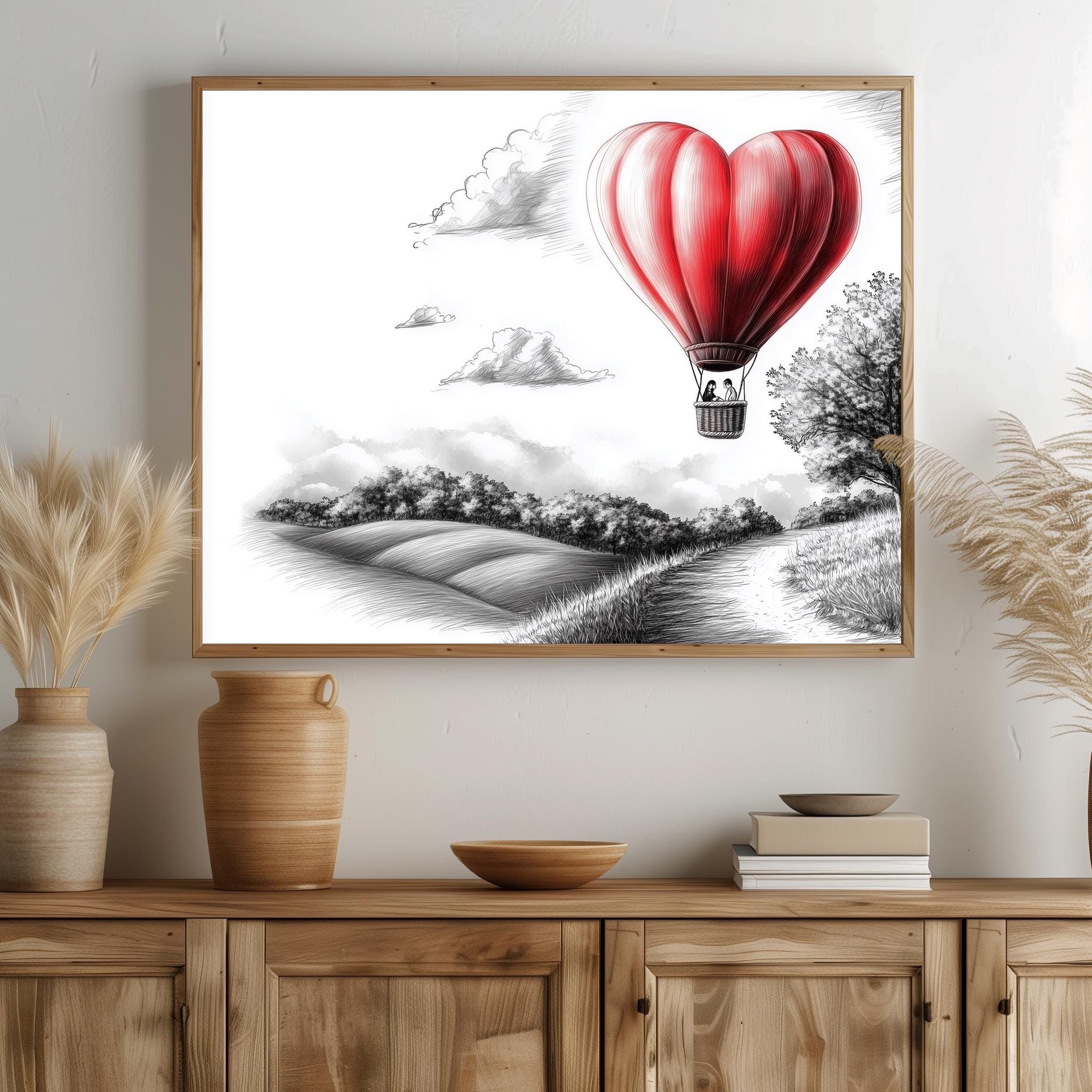 Immerse yourself in the charm with this rustic painting of a heart-shaped hot air balloon drifting over dreamy hills and fluffy clouds. An instantly downloadable print, it's perfect for elevating your decor with budget-friendly charm. This gives you the flexibility to customize the size, frame, and material according to your personal taste and space, ensuring a perfect fit for your walls.