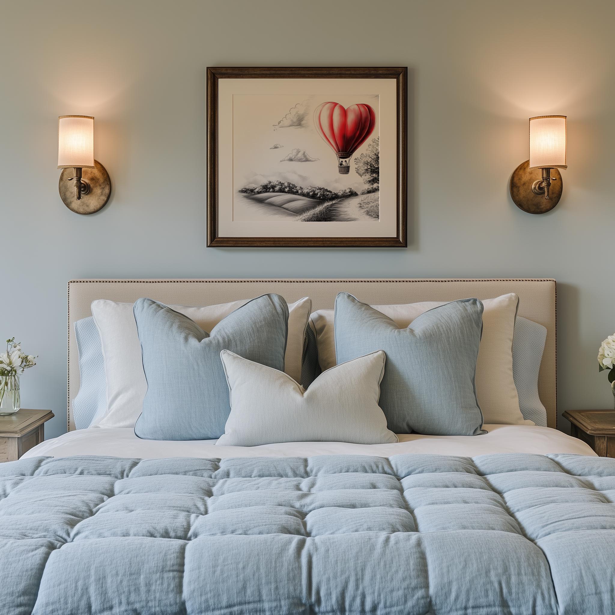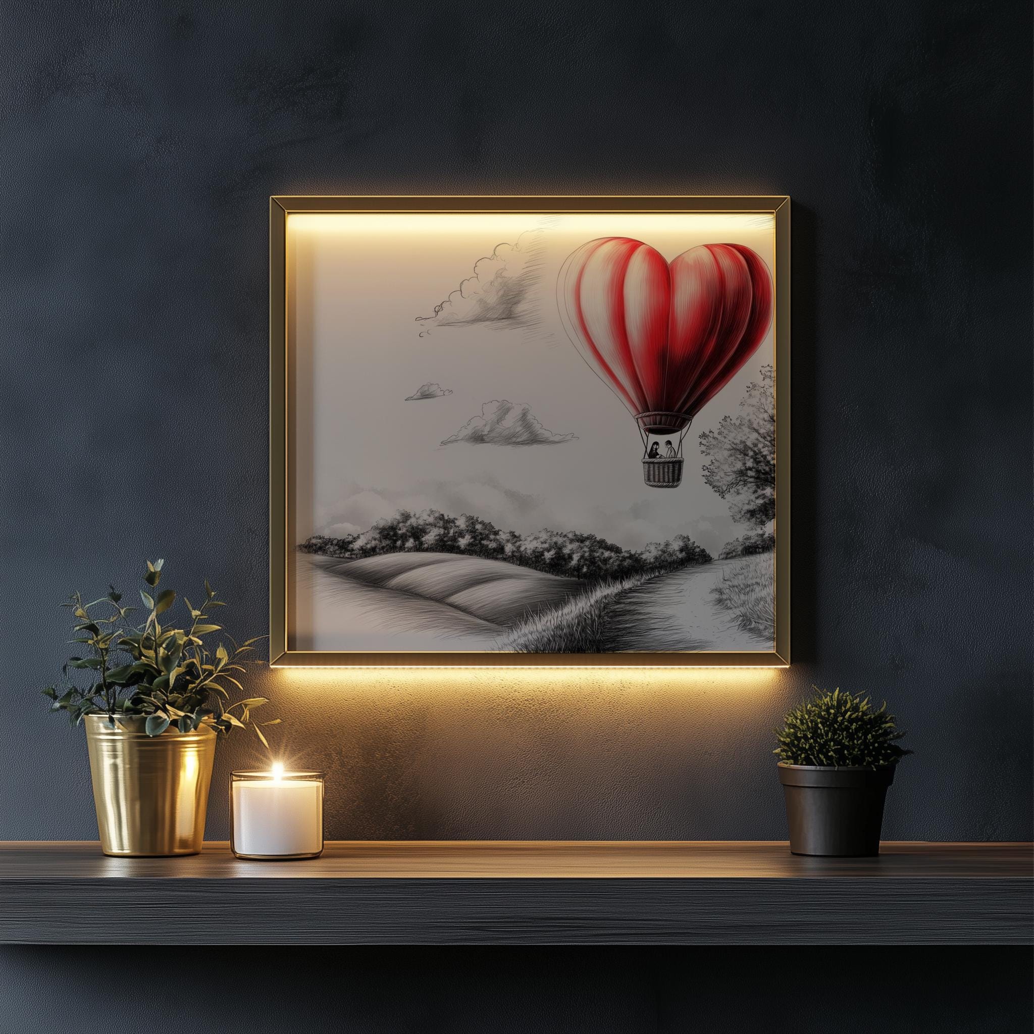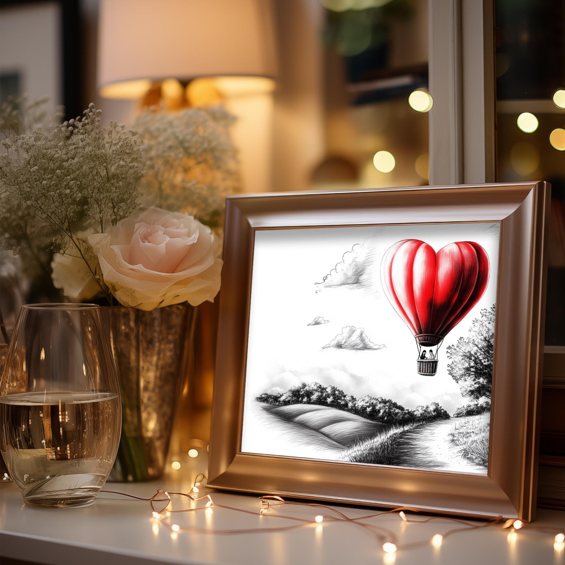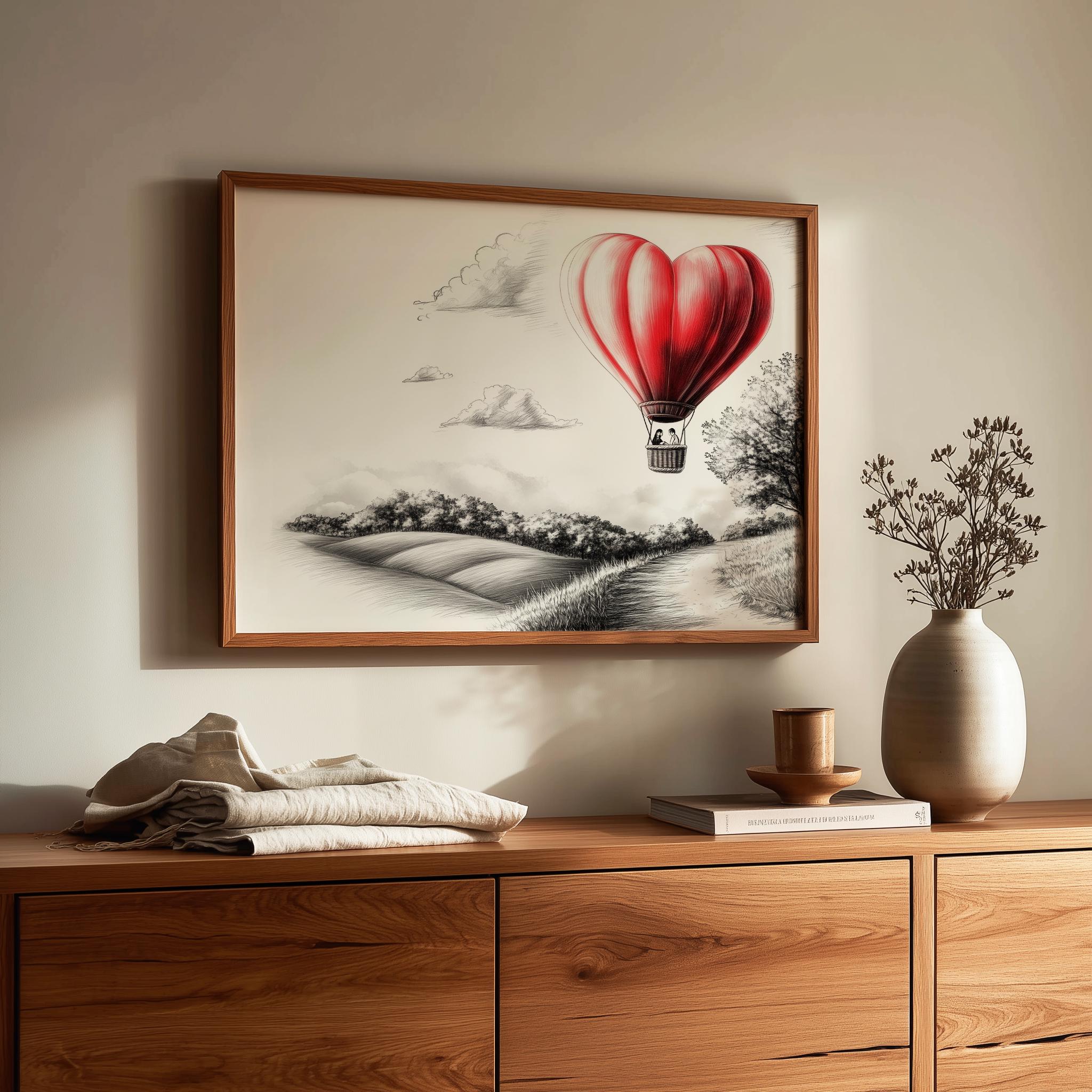 Immerse yourself in the charm with this rustic painting of a heart-shaped hot air balloon drifting over dreamy hills and fluffy clouds. An instantly downloadable print, it's perfect for elevating your decor with budget-friendly charm. This gives you the flexibility to customize the size, frame, and material according to your personal taste and space, ensuring a perfect fit for your walls.