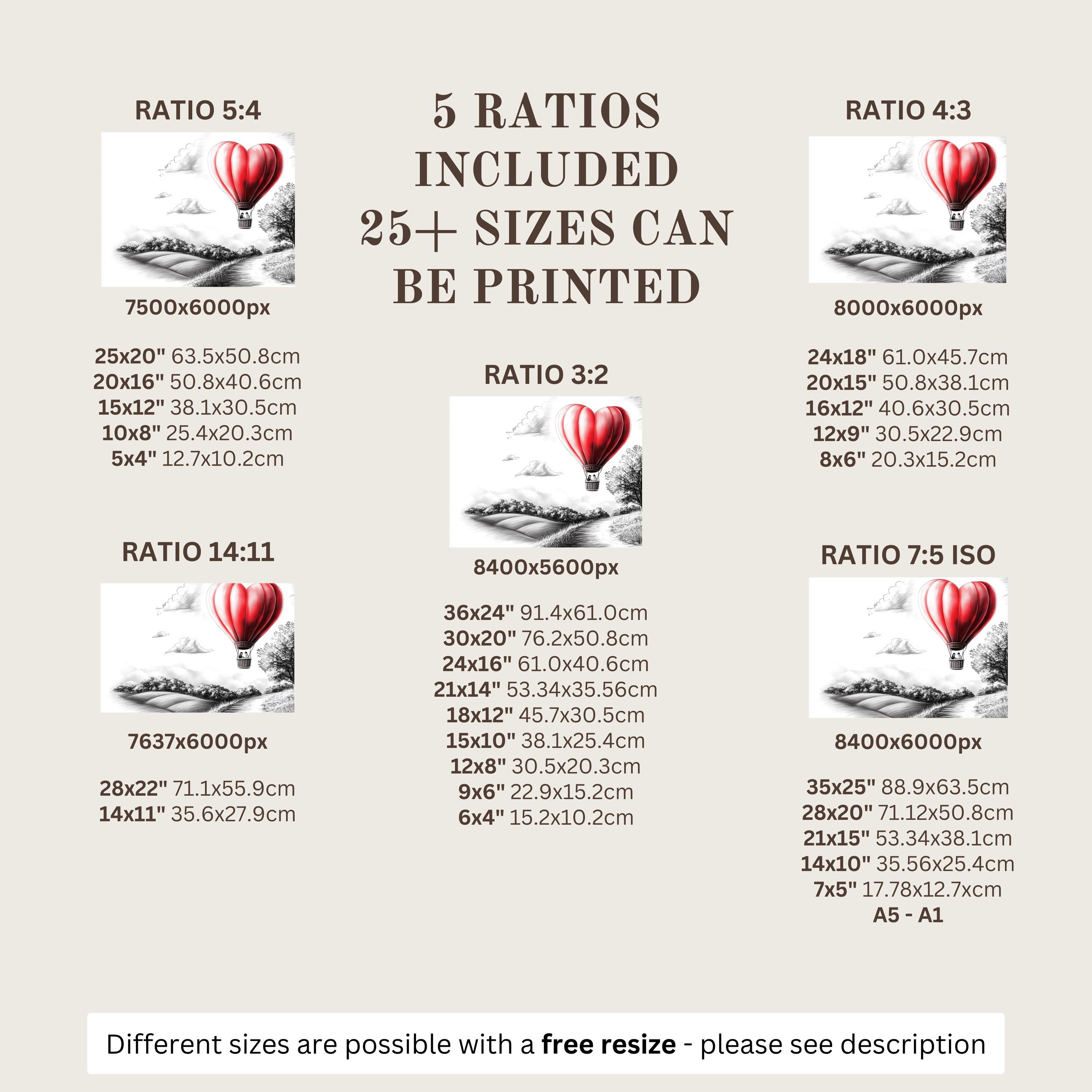 Each artwork includes 5 aspect ratios with 25+ print sizes. Most standard frames are covered. One custom resize per purchase available—message before ordering.