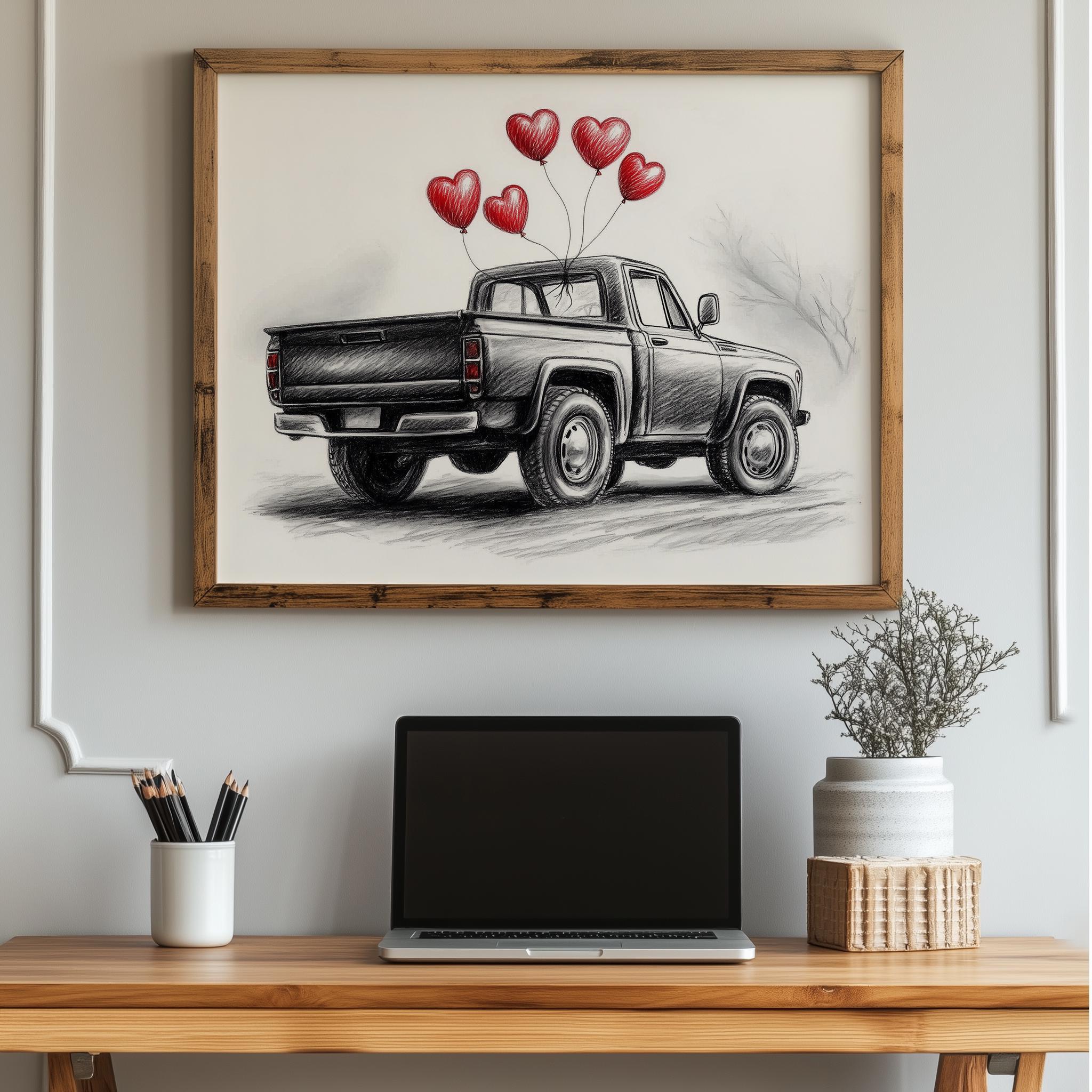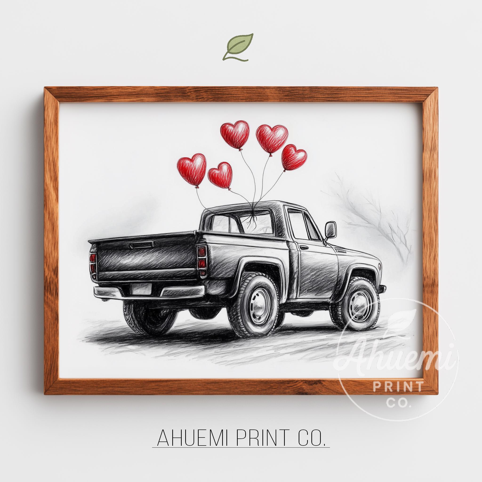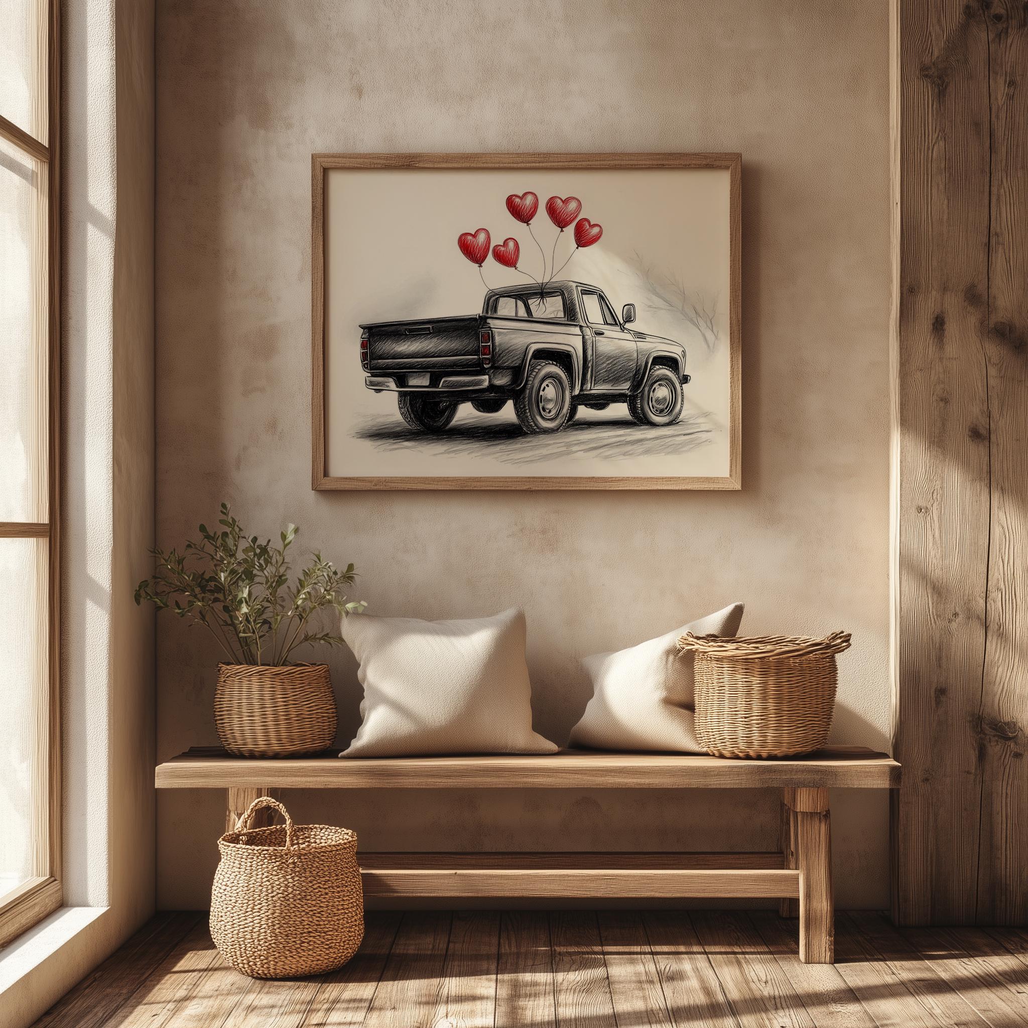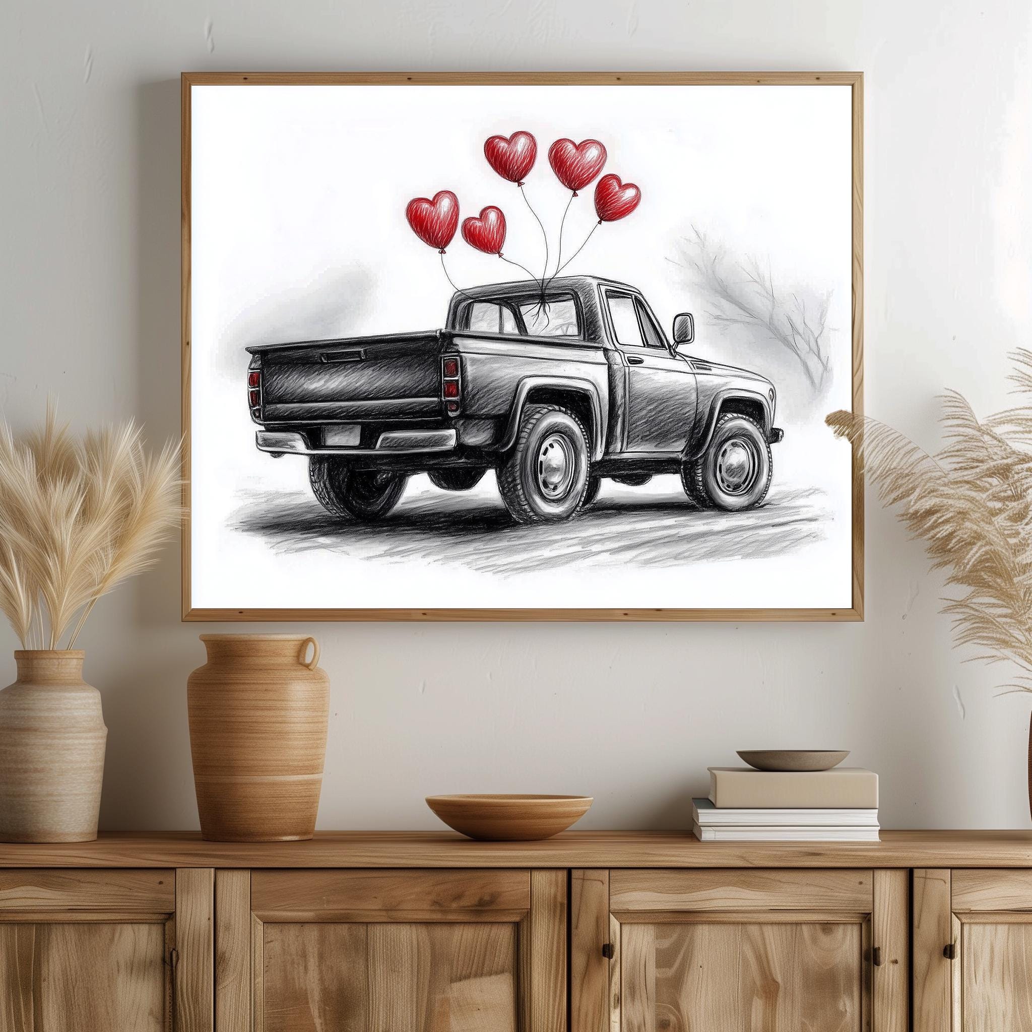 Immerse yourself in the charm with this rustic painting of a vintage pickup truck adorned with heart balloons. An instantly downloadable print, it's perfect for elevating your decor with budget-friendly charm. This gives you the flexibility to customize the size, frame, and material according to your personal taste and space, ensuring a perfect fit for your walls.