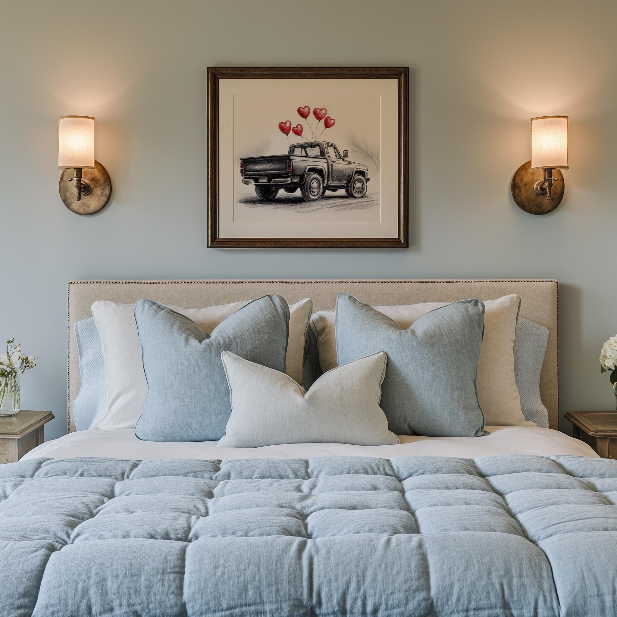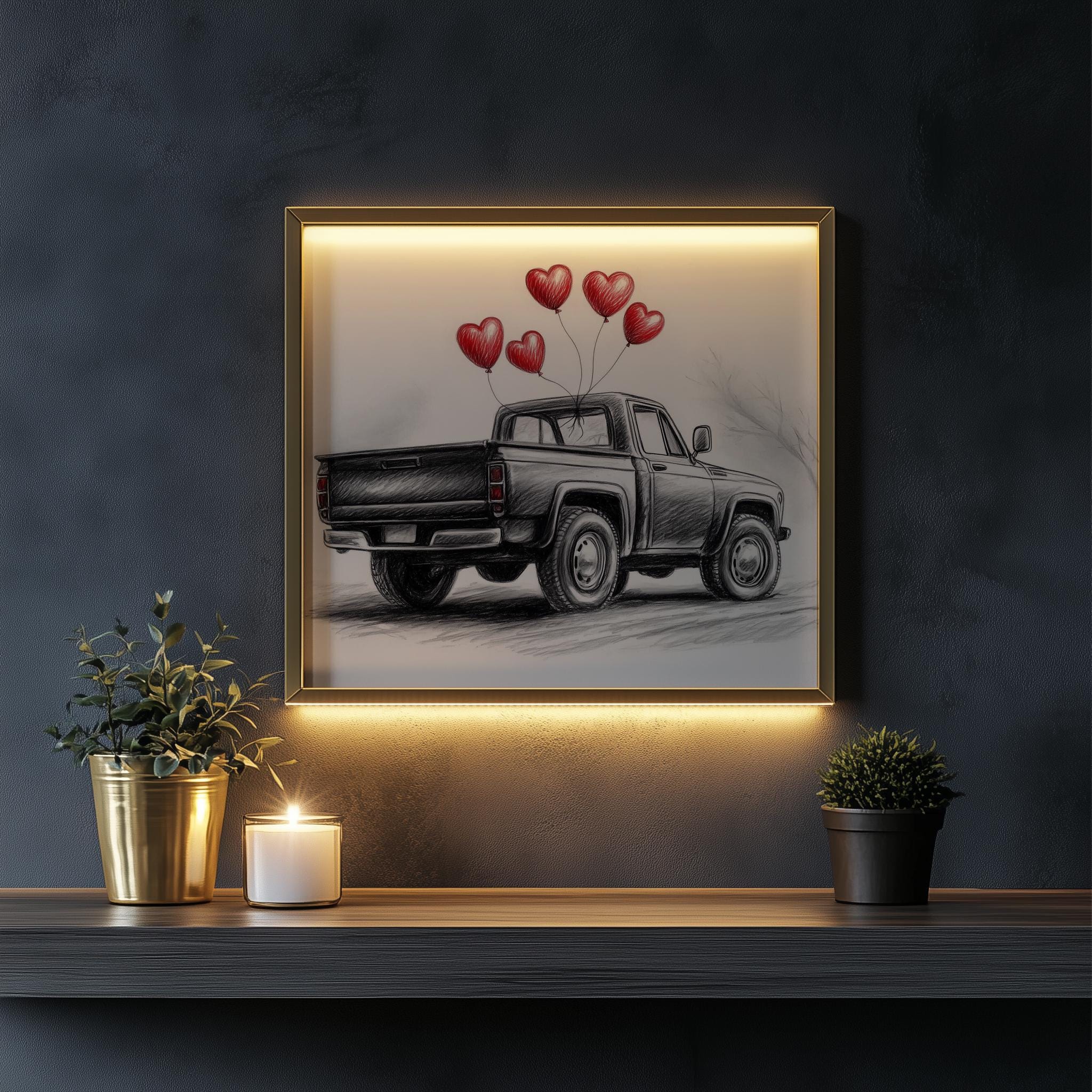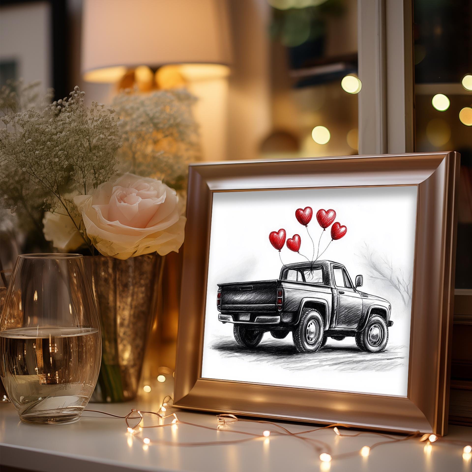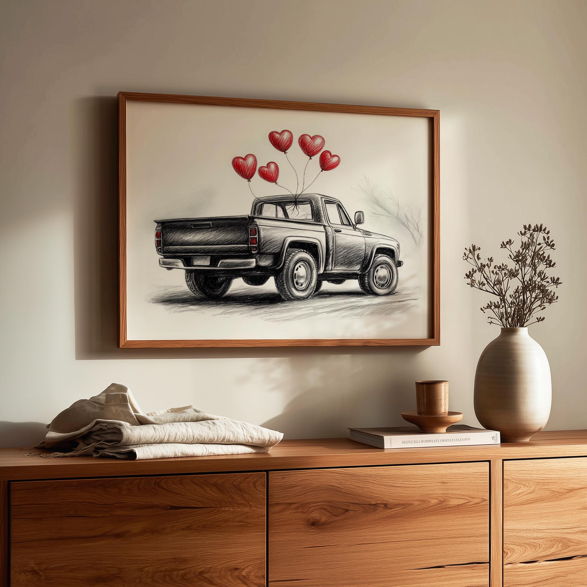 Immerse yourself in the charm with this rustic painting of a vintage pickup truck adorned with heart balloons. An instantly downloadable print, it's perfect for elevating your decor with budget-friendly charm. This gives you the flexibility to customize the size, frame, and material according to your personal taste and space, ensuring a perfect fit for your walls.