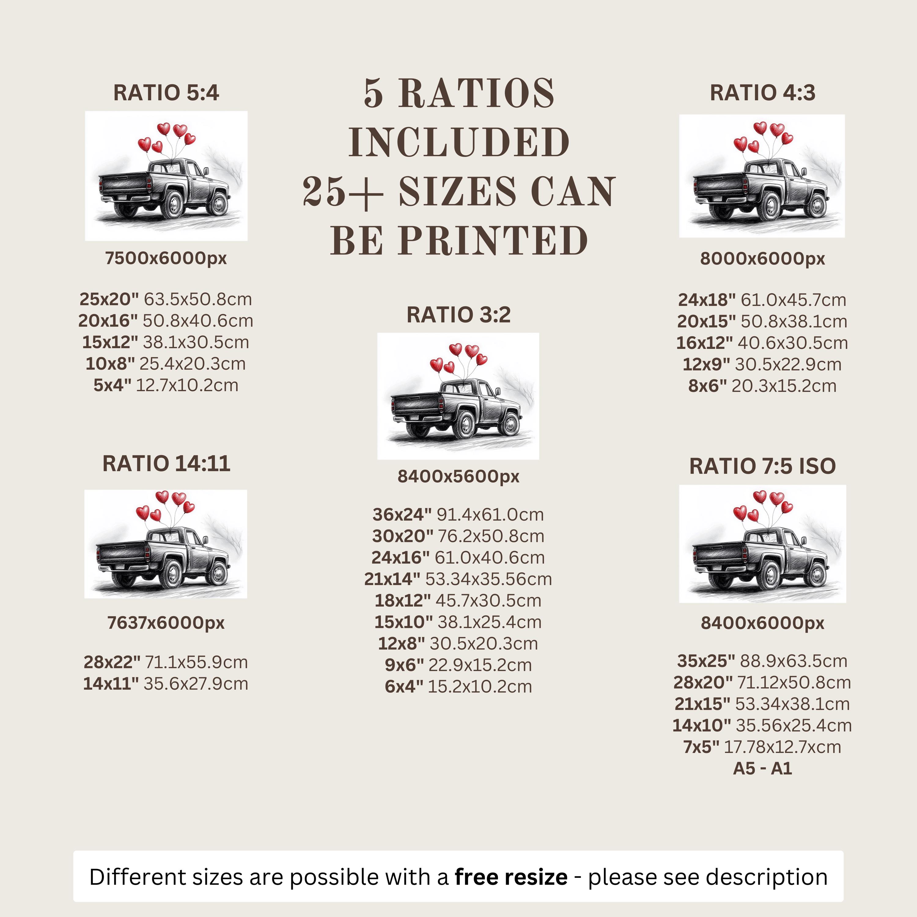Each artwork includes 5 aspect ratios with 25+ print sizes. Most standard frames are covered. One custom resize per purchase available—message before ordering.