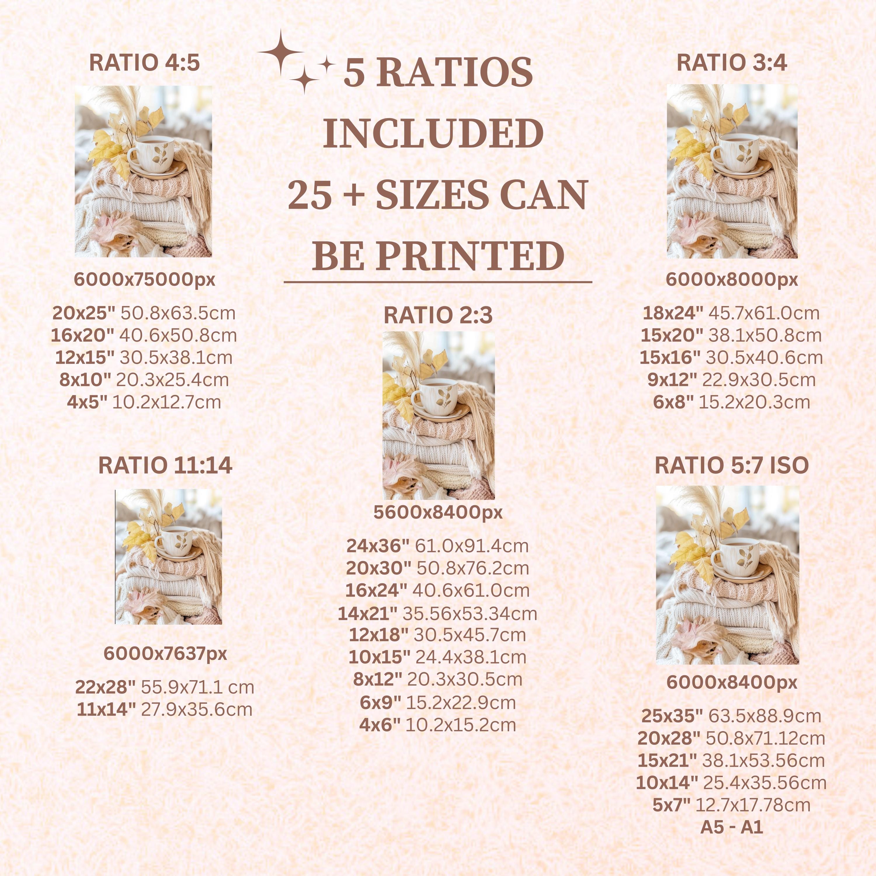 Each artwork includes 5 aspect ratios with 25+ print sizes. Most standard frames are covered. One custom resize per purchase available—message before ordering.