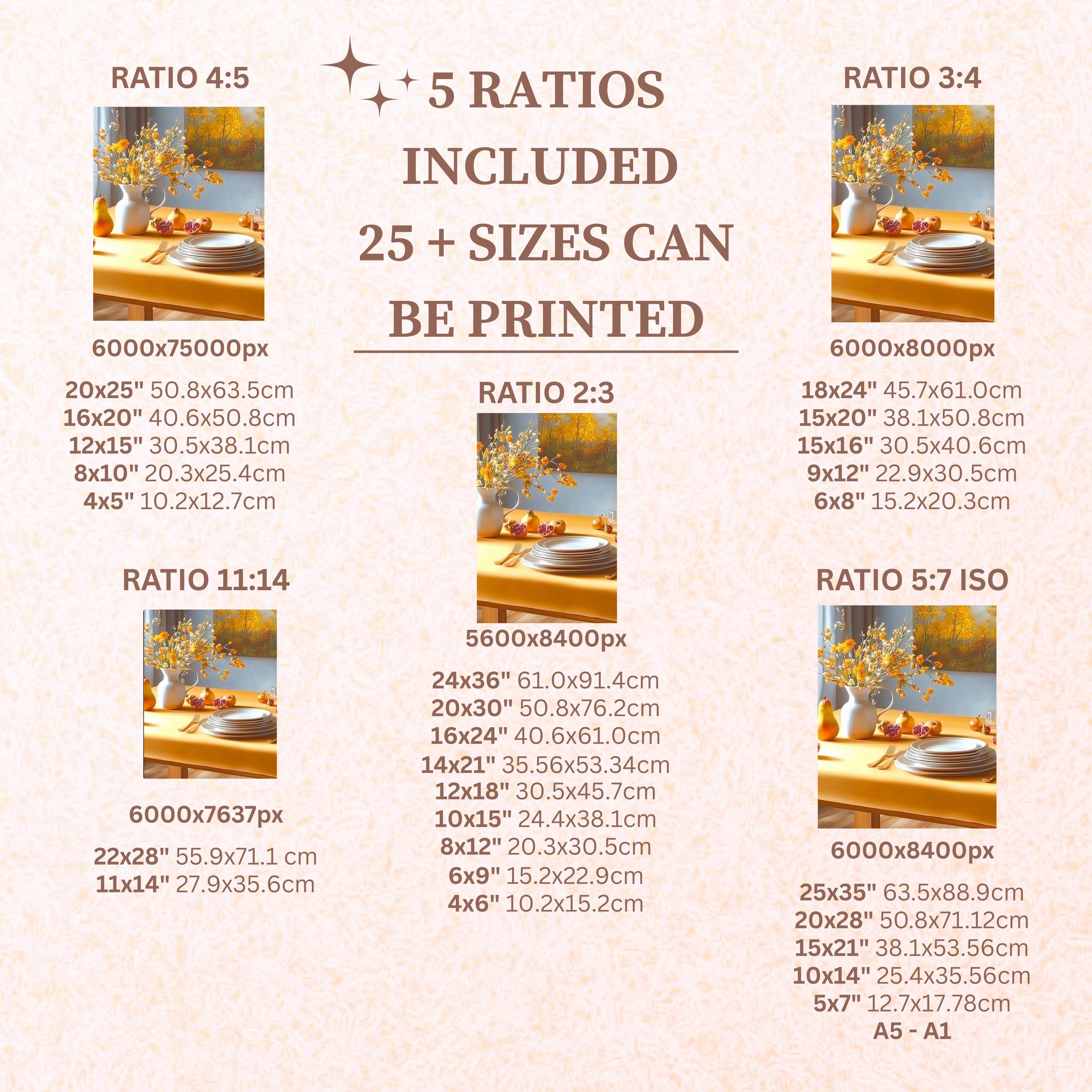 Each artwork includes 5 aspect ratios with 25+ print sizes. Most standard frames are covered. One custom resize per purchase available—message before ordering.