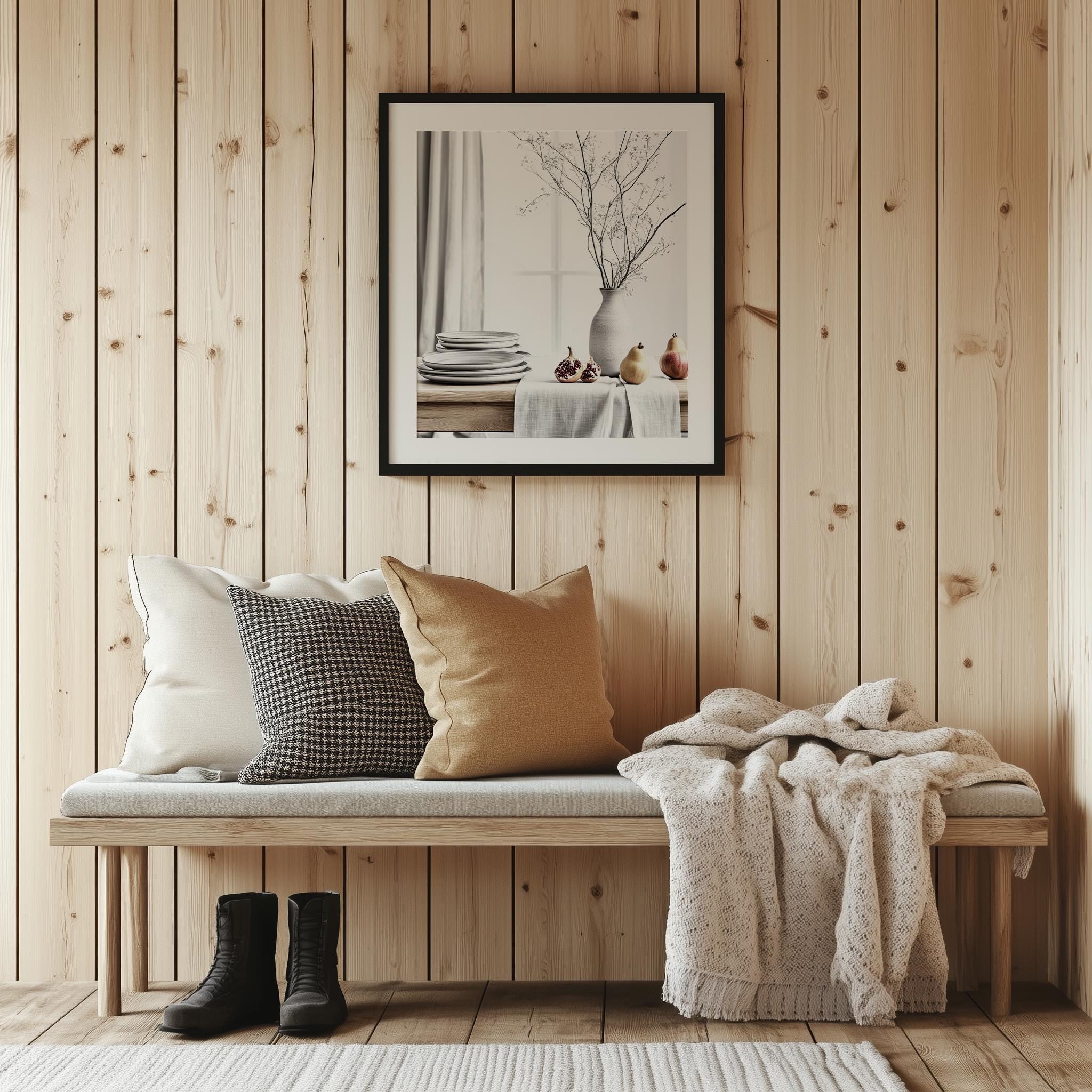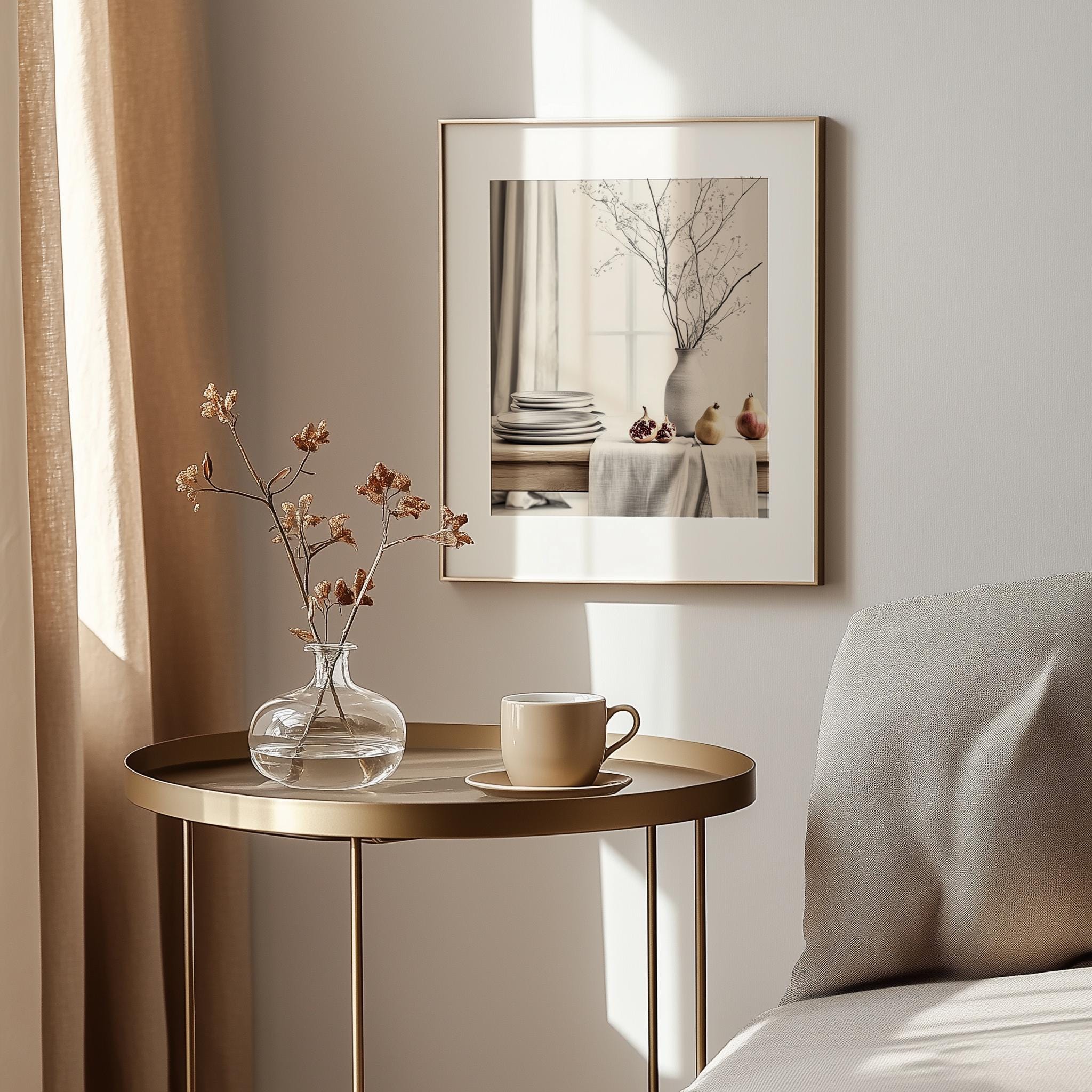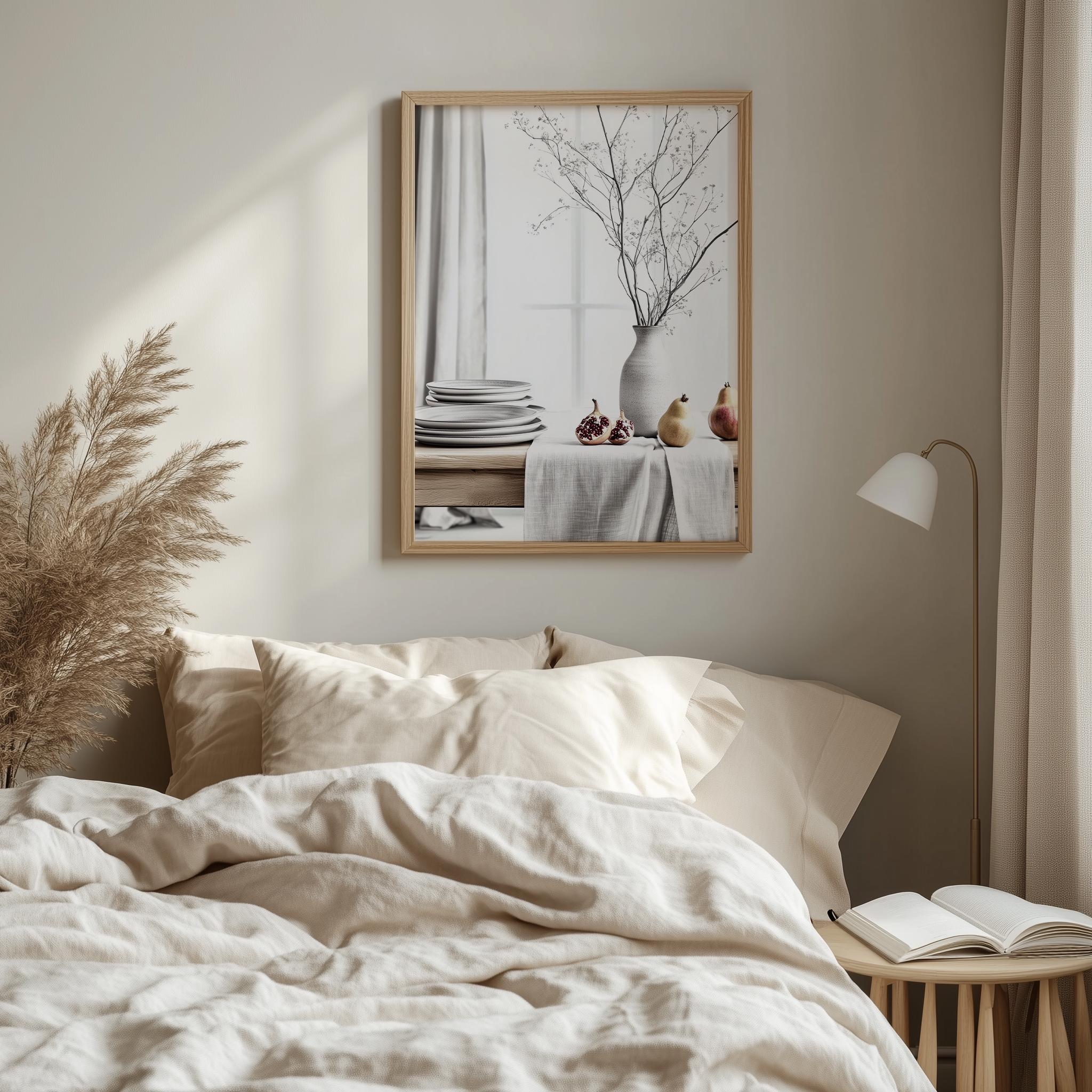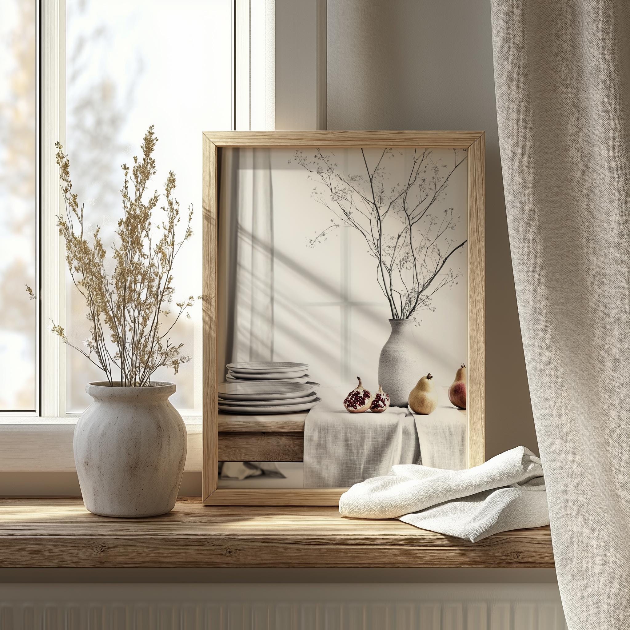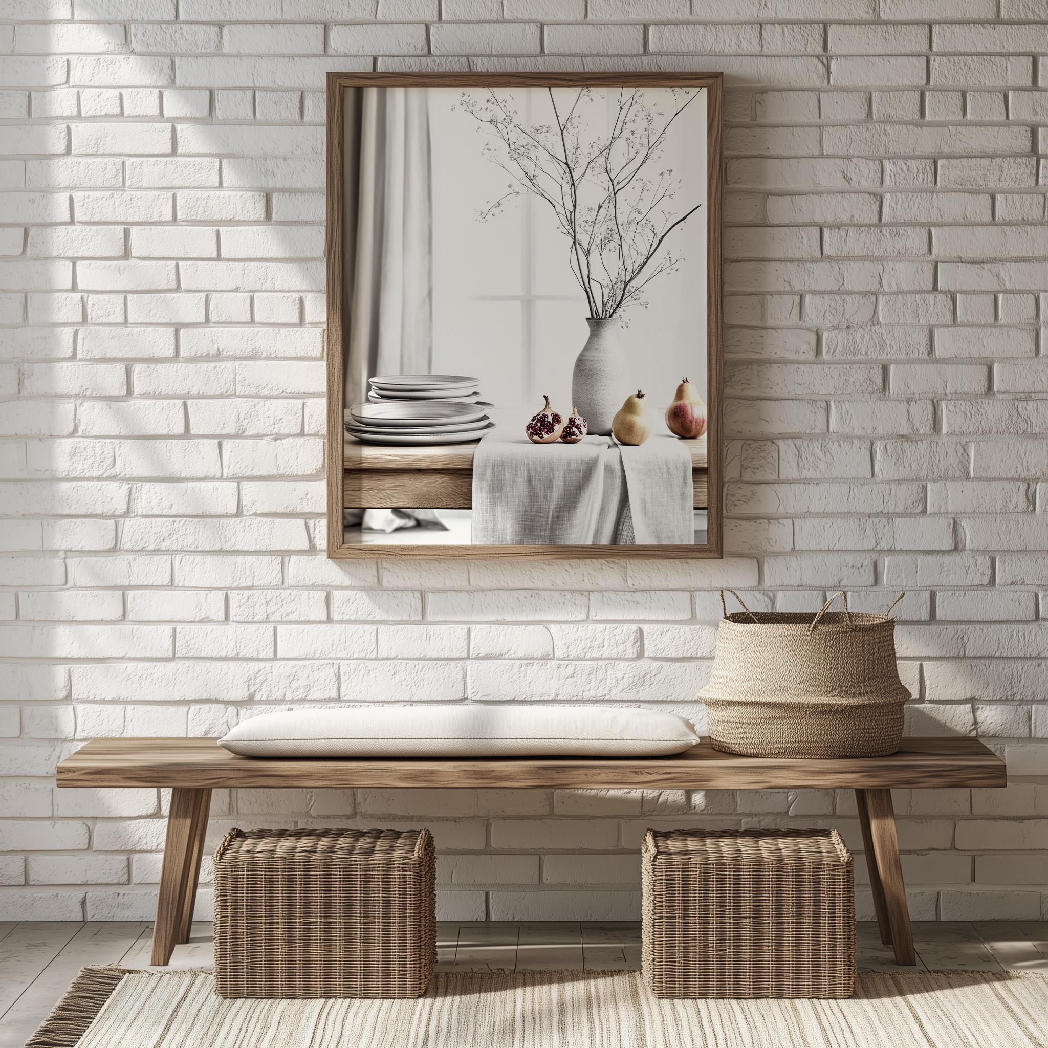 Immerse yourself in the charm with this rustic painting ofa serene table setting adorned with stacked plates and soft natural light. An instantly downloadable print, it's perfect for elevating your decor with budget friendly charm. This gives you the flexibility to customize the size, frame, and material according to your personal taste and space, ensuring a perfect fit for your walls.