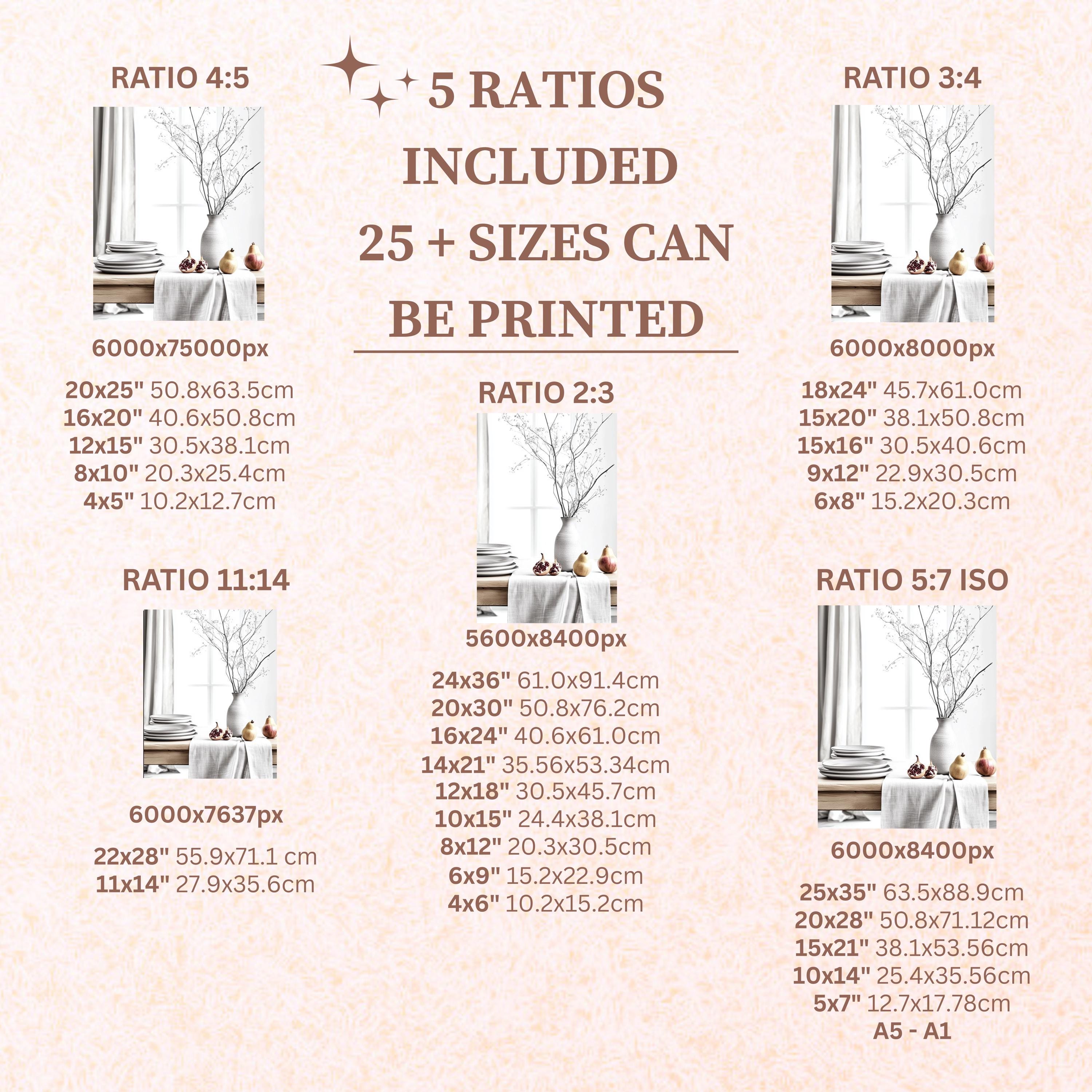 Each artwork includes 5 aspect ratios with 25+ print sizes. Most standard frames are covered. One custom resize per purchase available—message before ordering.