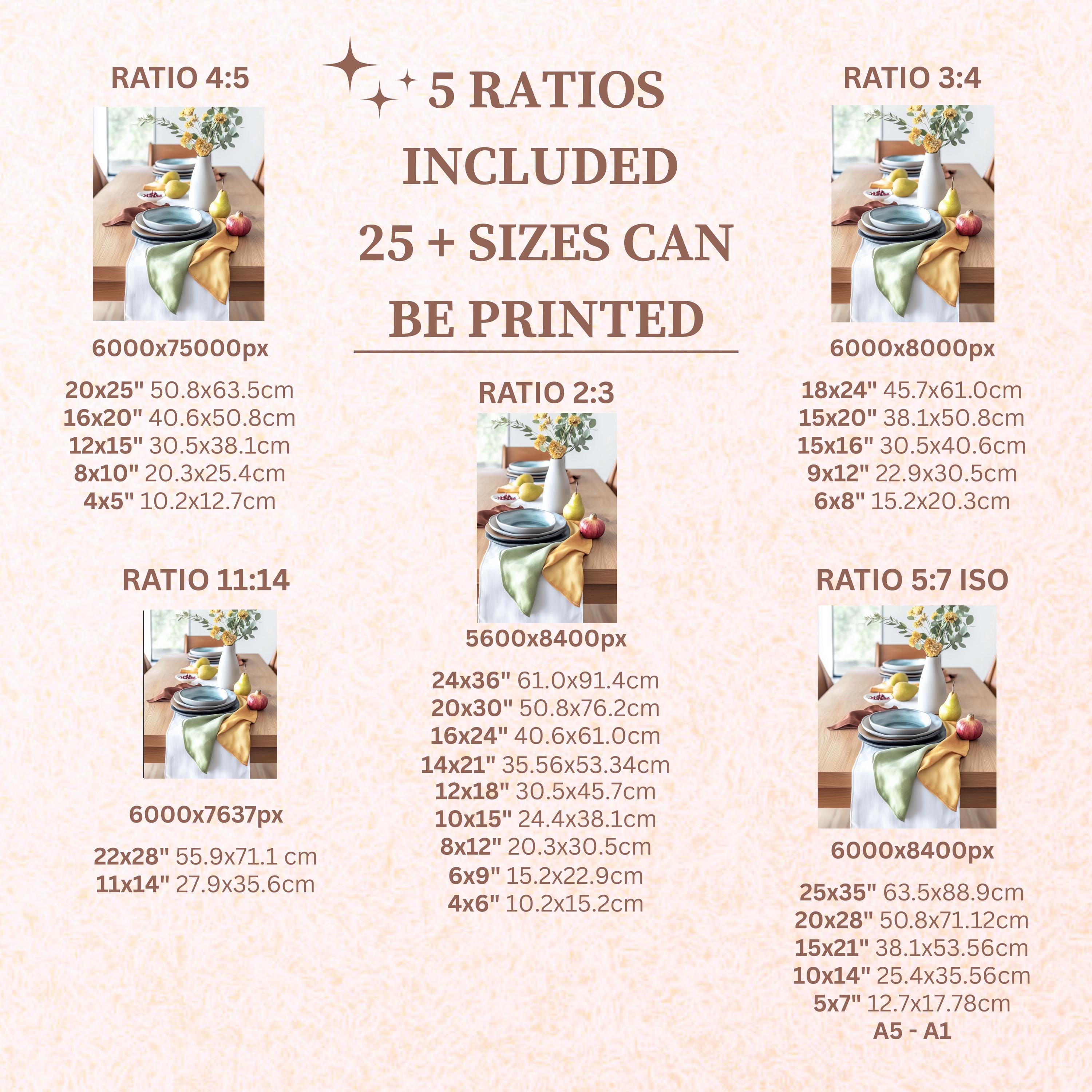 Each artwork includes 5 aspect ratios with 25+ print sizes. Most standard frames are covered. One custom resize per purchase available—message before ordering.