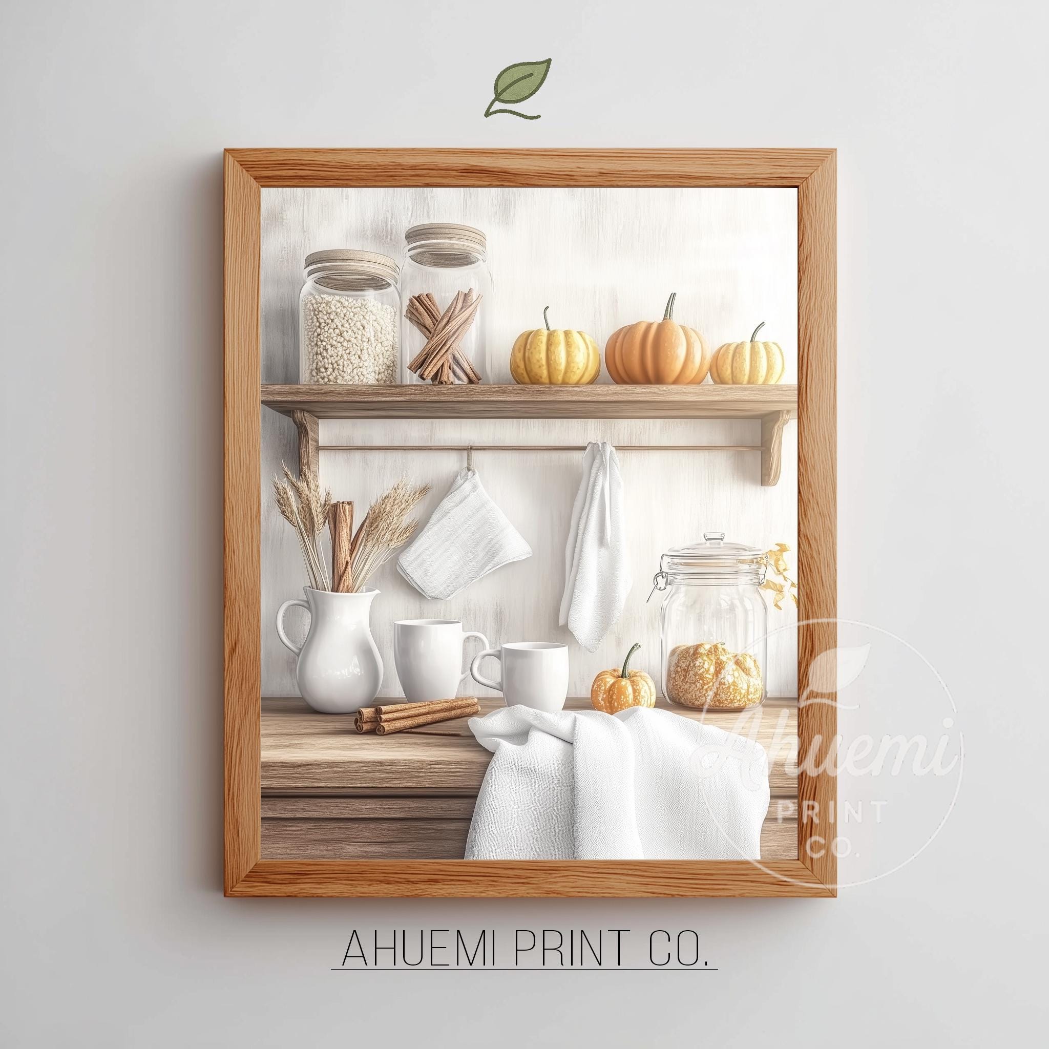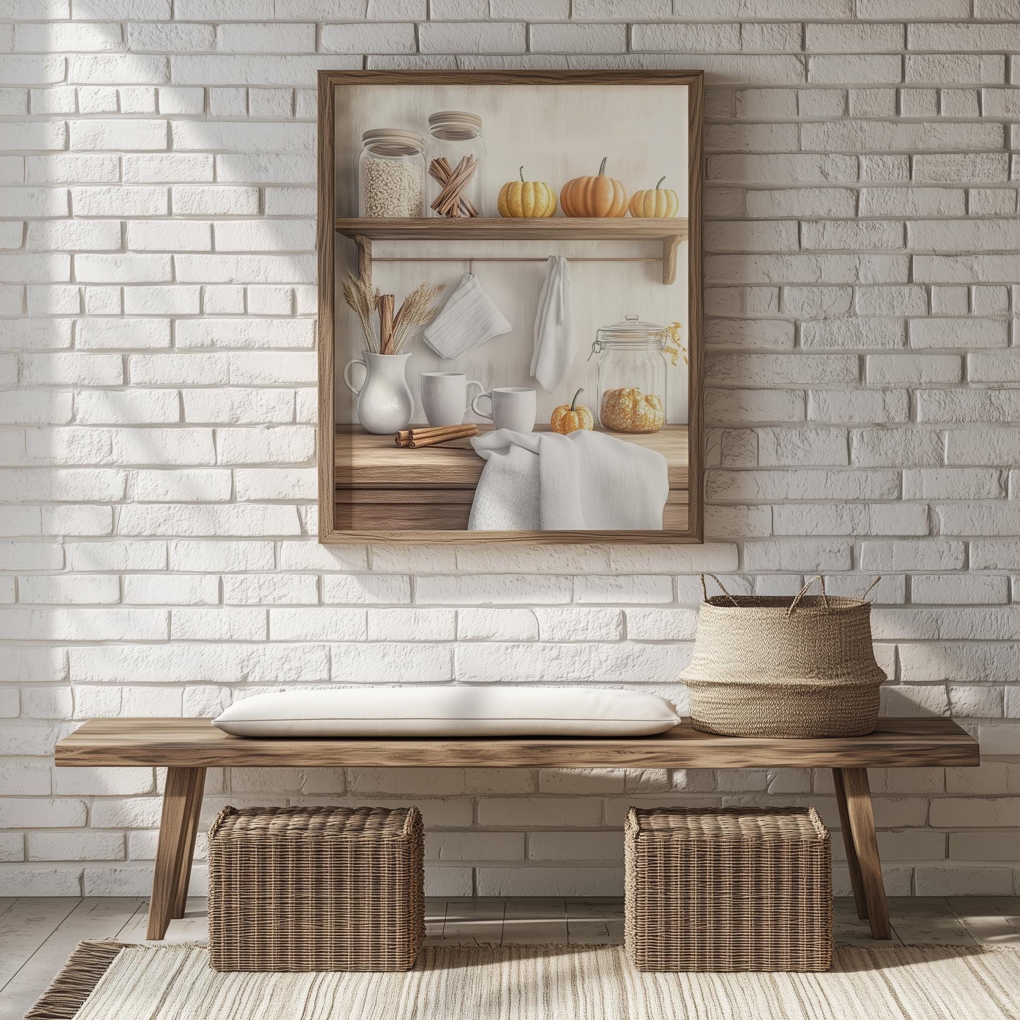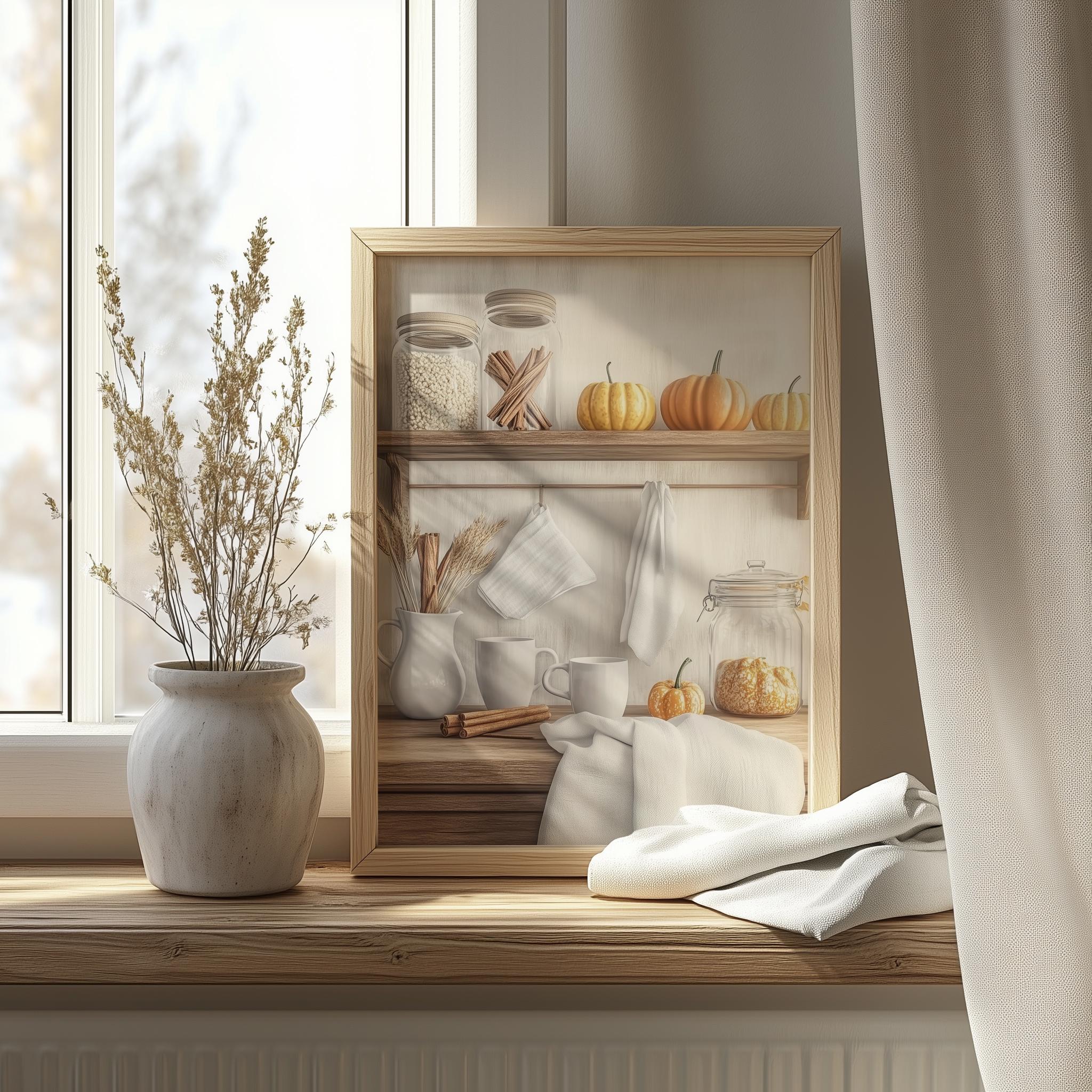 Immerse yourself in the charm with this rustic painting ofa cozy autumn kitchen shelf adorned with dried flowers and warm-toned decor. An instantly downloadable print, it's perfect for elevating your decor with budget friendly charm. This gives you the flexibility to customize the size, frame, and material according to your personal taste and space, ensuring a perfect fit for your walls.