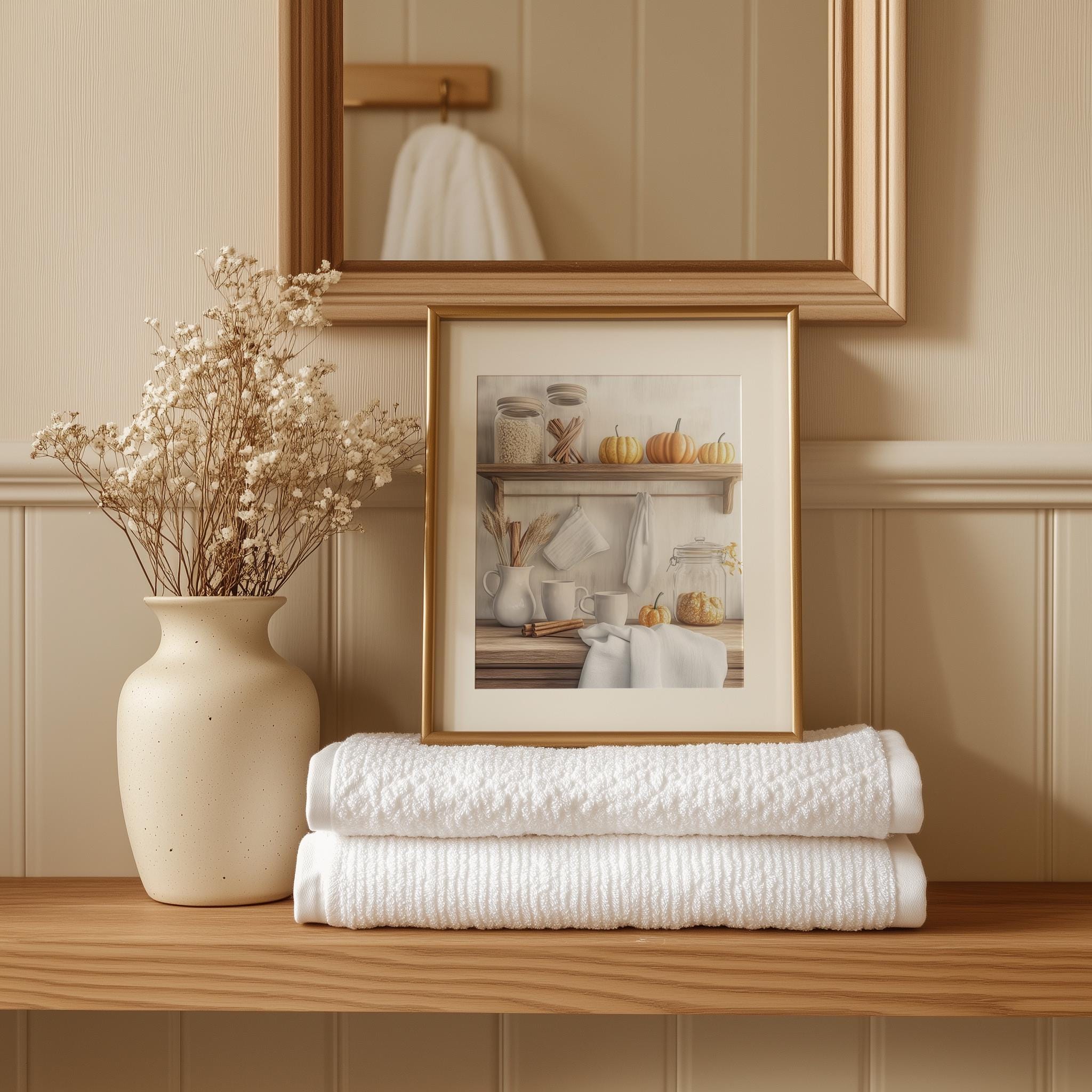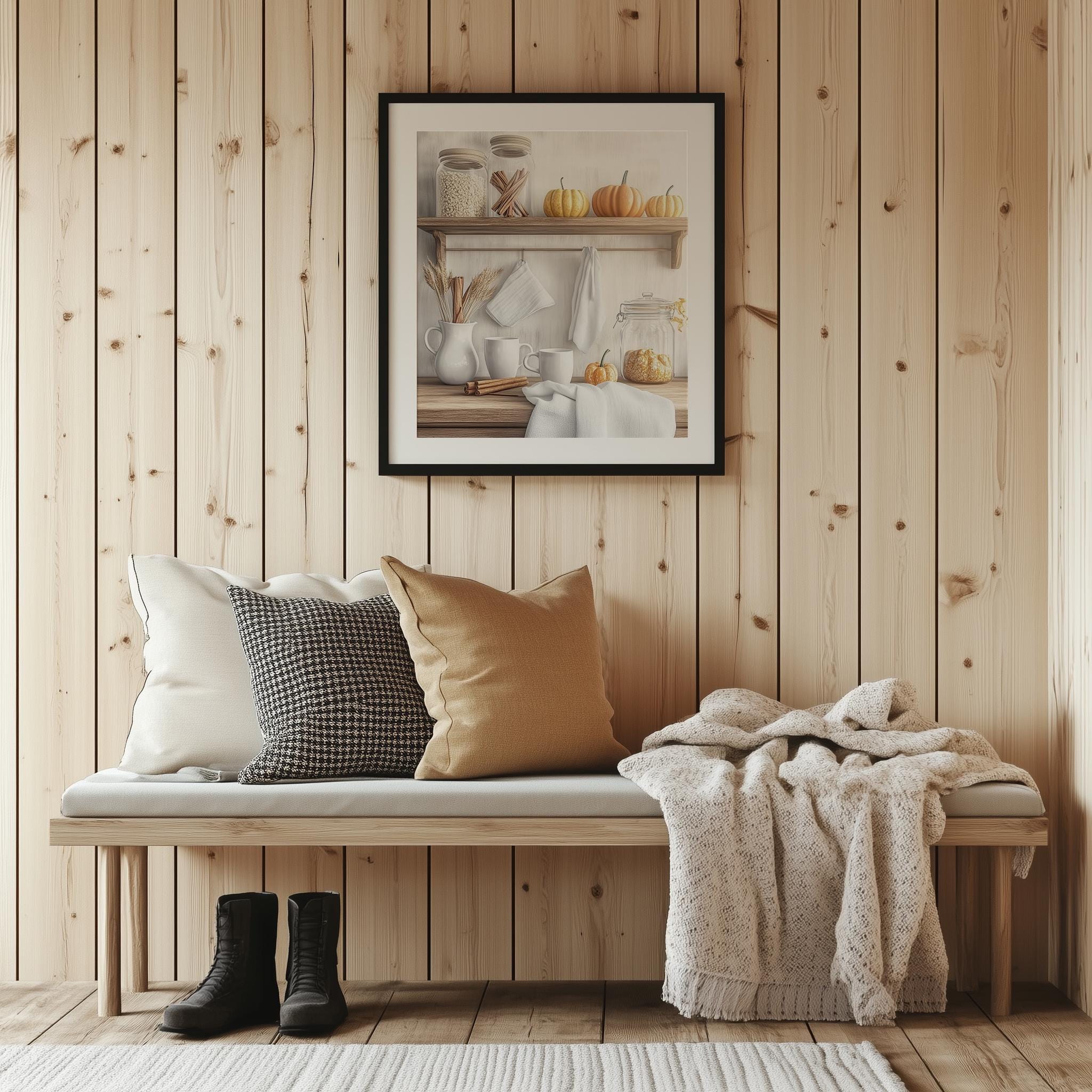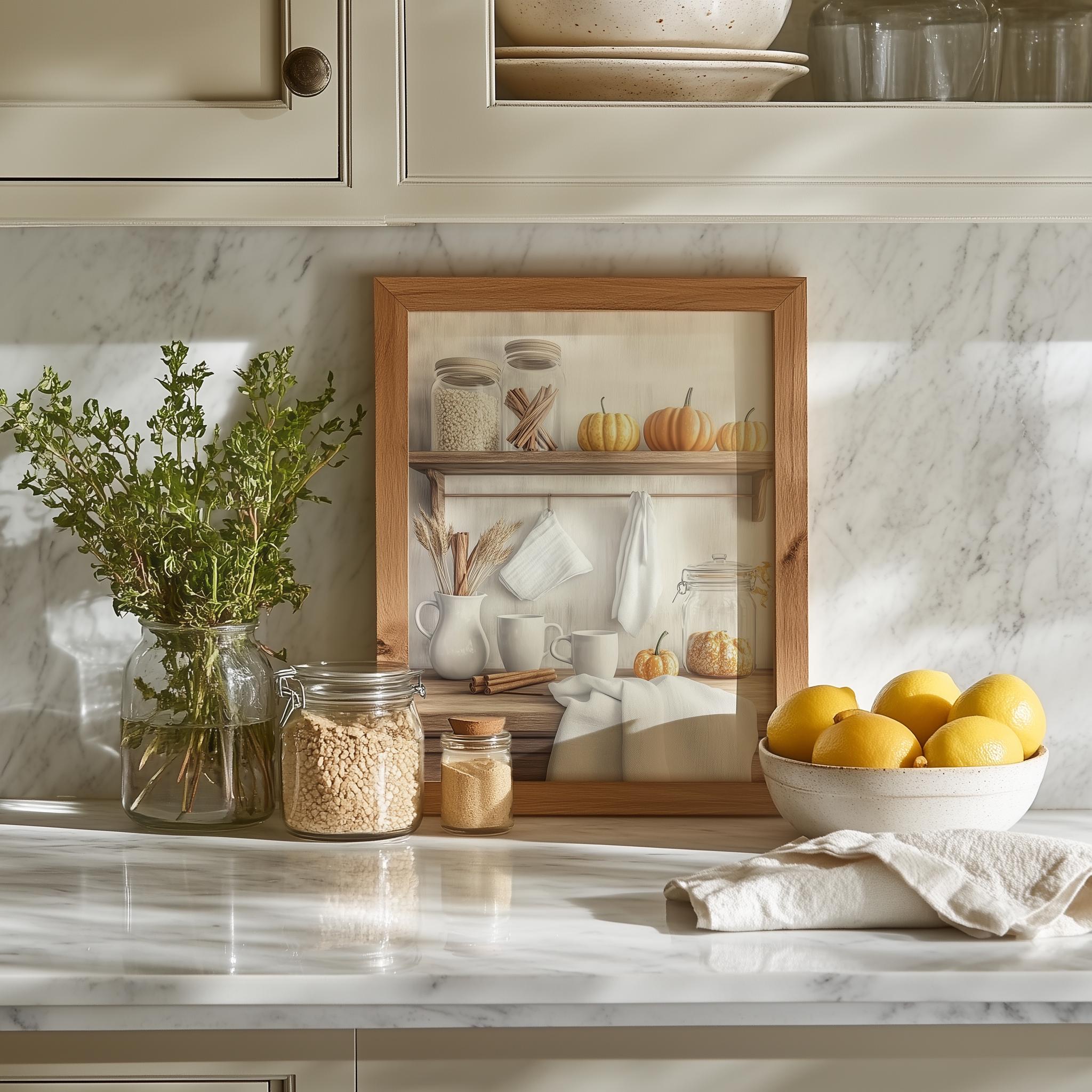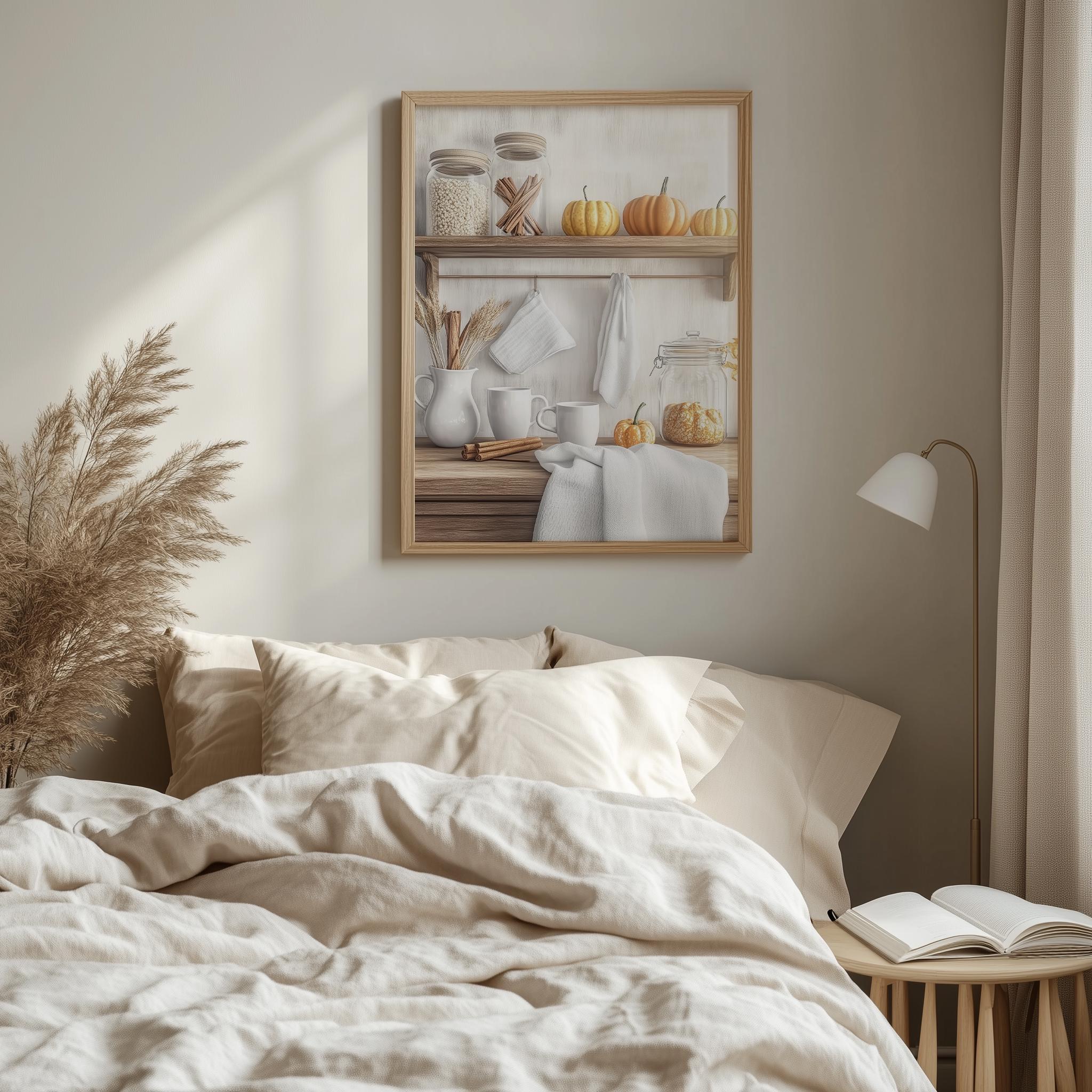 Immerse yourself in the charm with this rustic painting ofa cozy autumn kitchen shelf adorned with dried flowers and warm-toned decor. An instantly downloadable print, it's perfect for elevating your decor with budget friendly charm. This gives you the flexibility to customize the size, frame, and material according to your personal taste and space, ensuring a perfect fit for your walls.