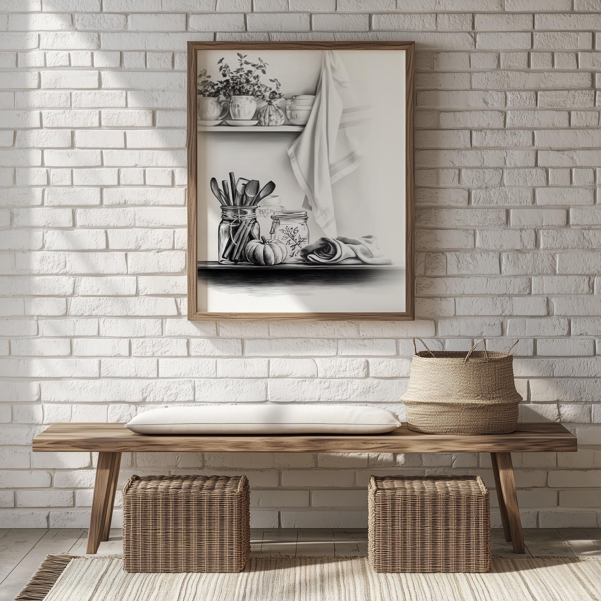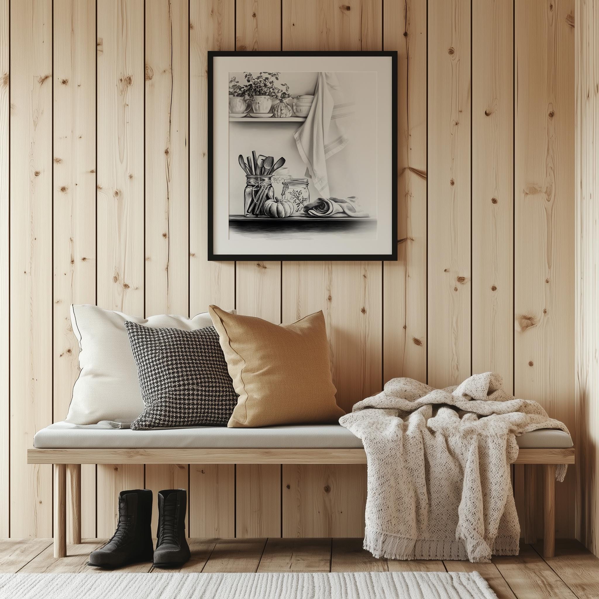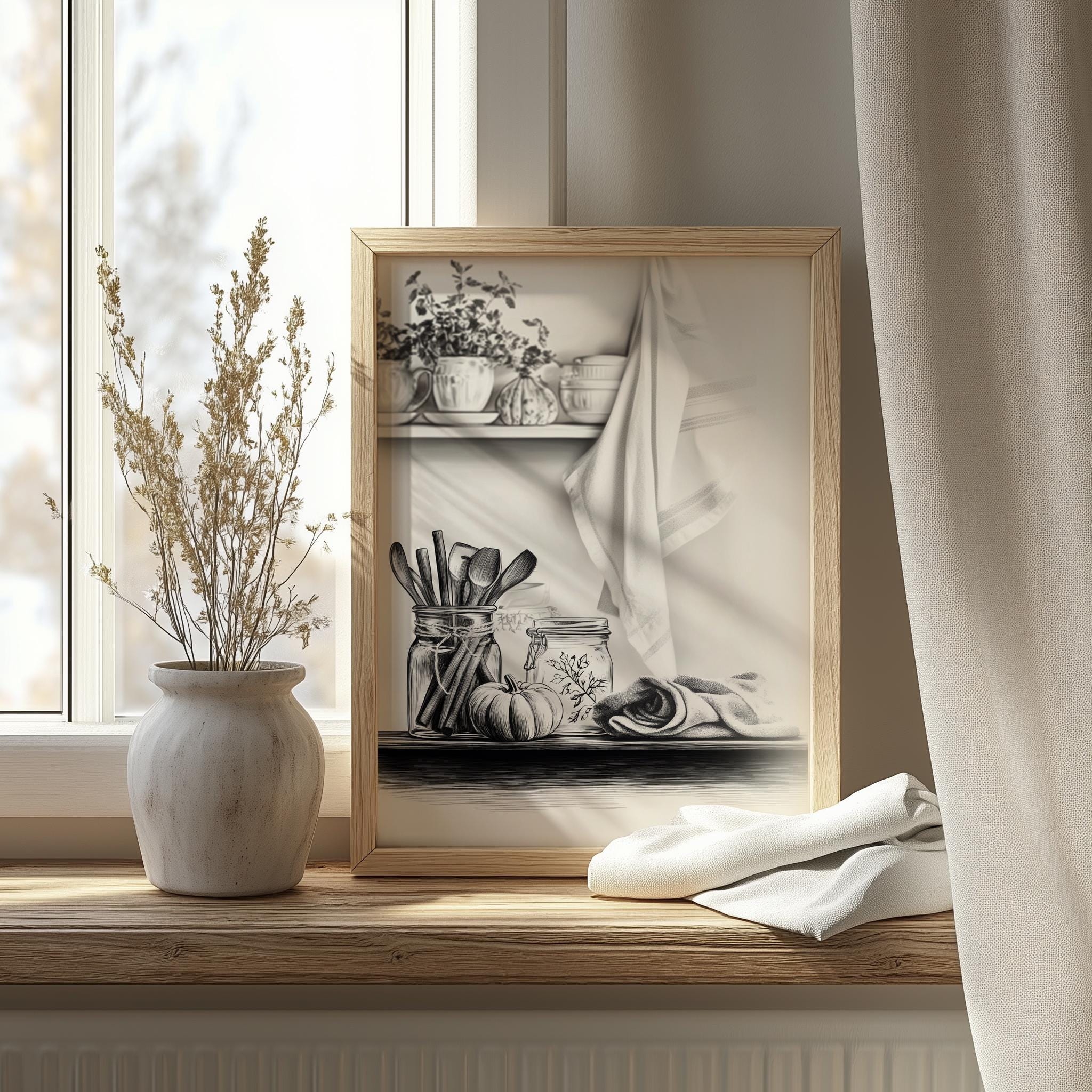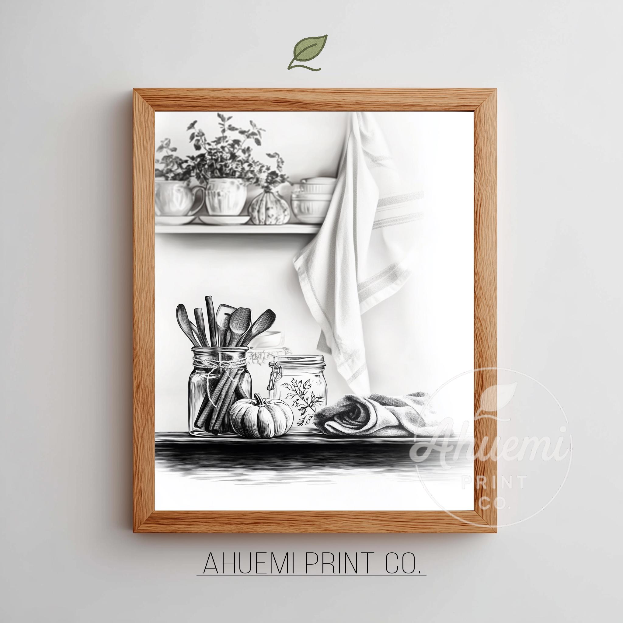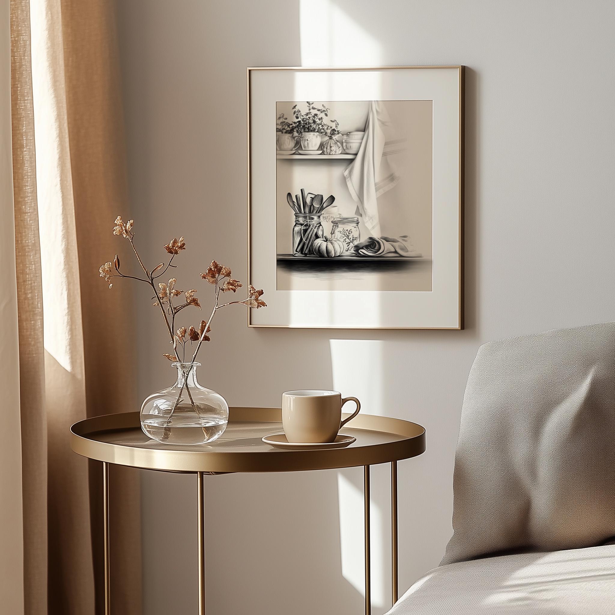 Immerse yourself in the charm with this rustic painting ofa cozy collection of ceramic mugs and autumn foliage. An instantly downloadable print, it's perfect for elevating your decor with budget friendly charm. This gives you the flexibility to customize the size, frame, and material according to your personal taste and space, ensuring a perfect fit for your walls.