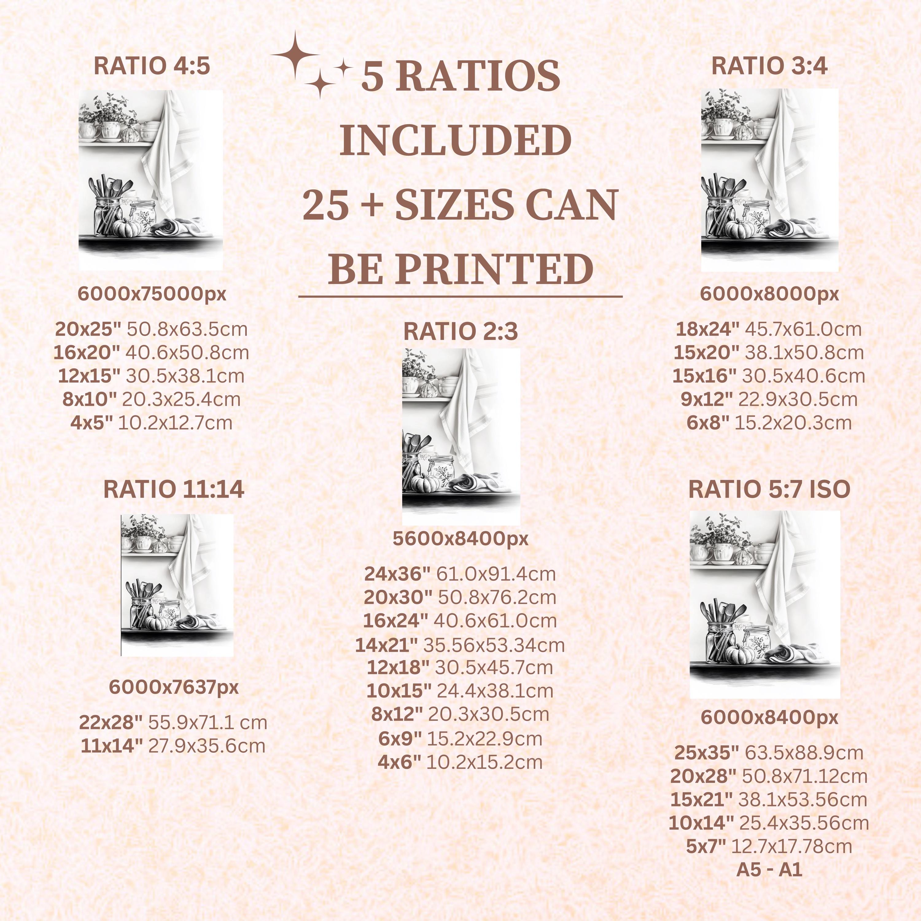 Each artwork includes 5 aspect ratios with 25+ print sizes. Most standard frames are covered. One custom resize per purchase available—message before ordering.