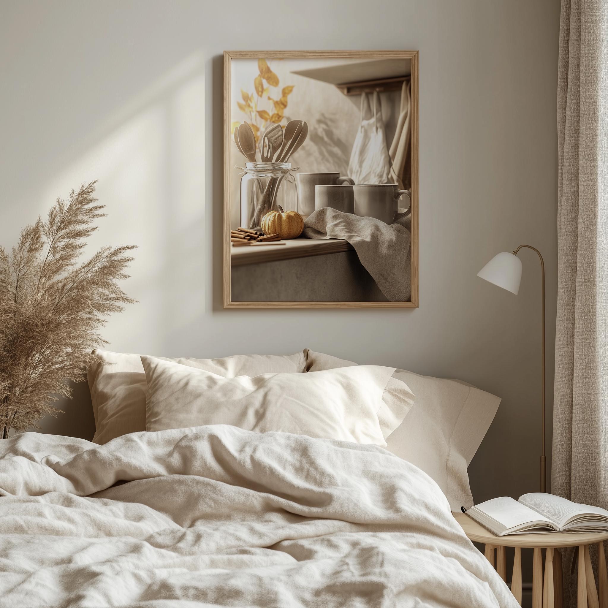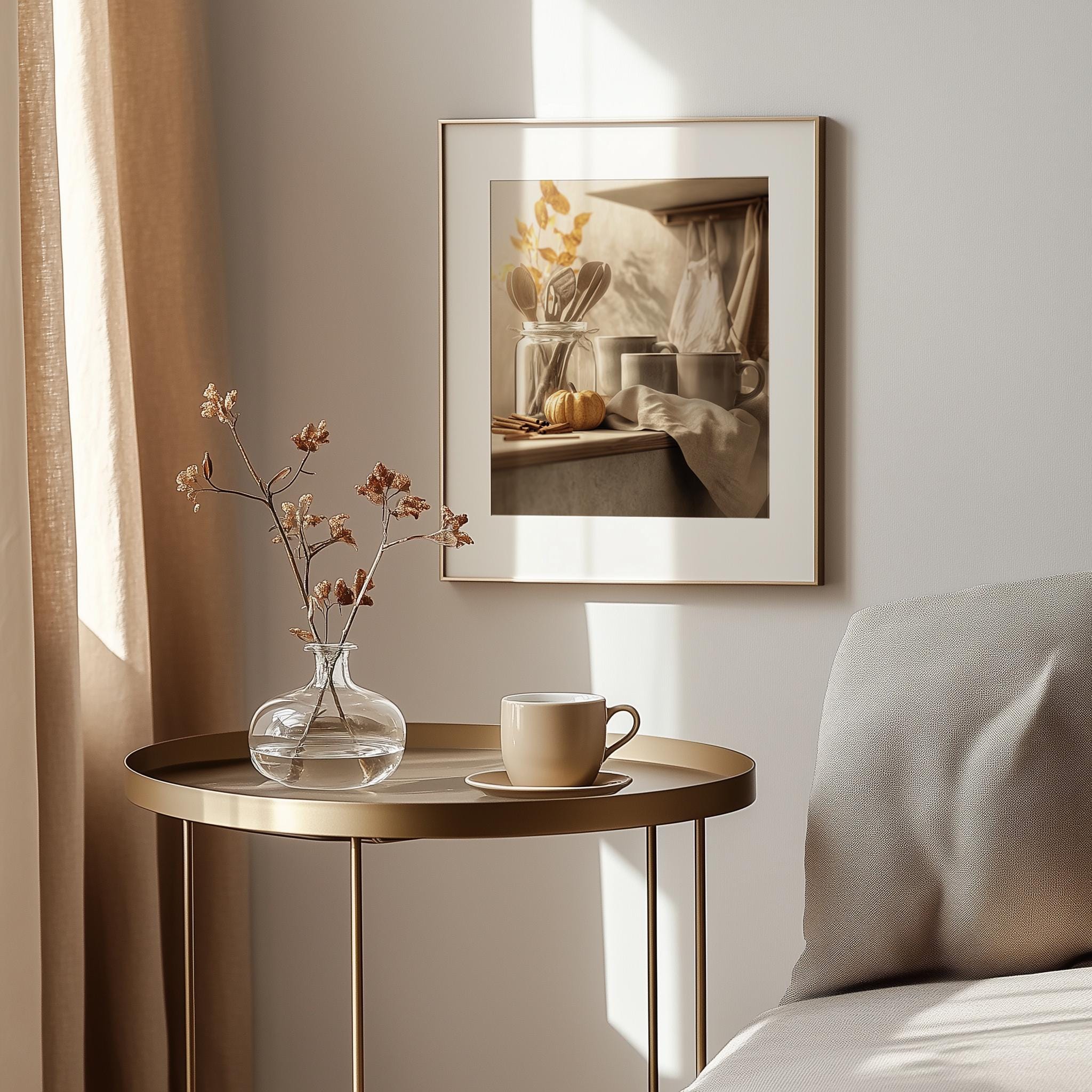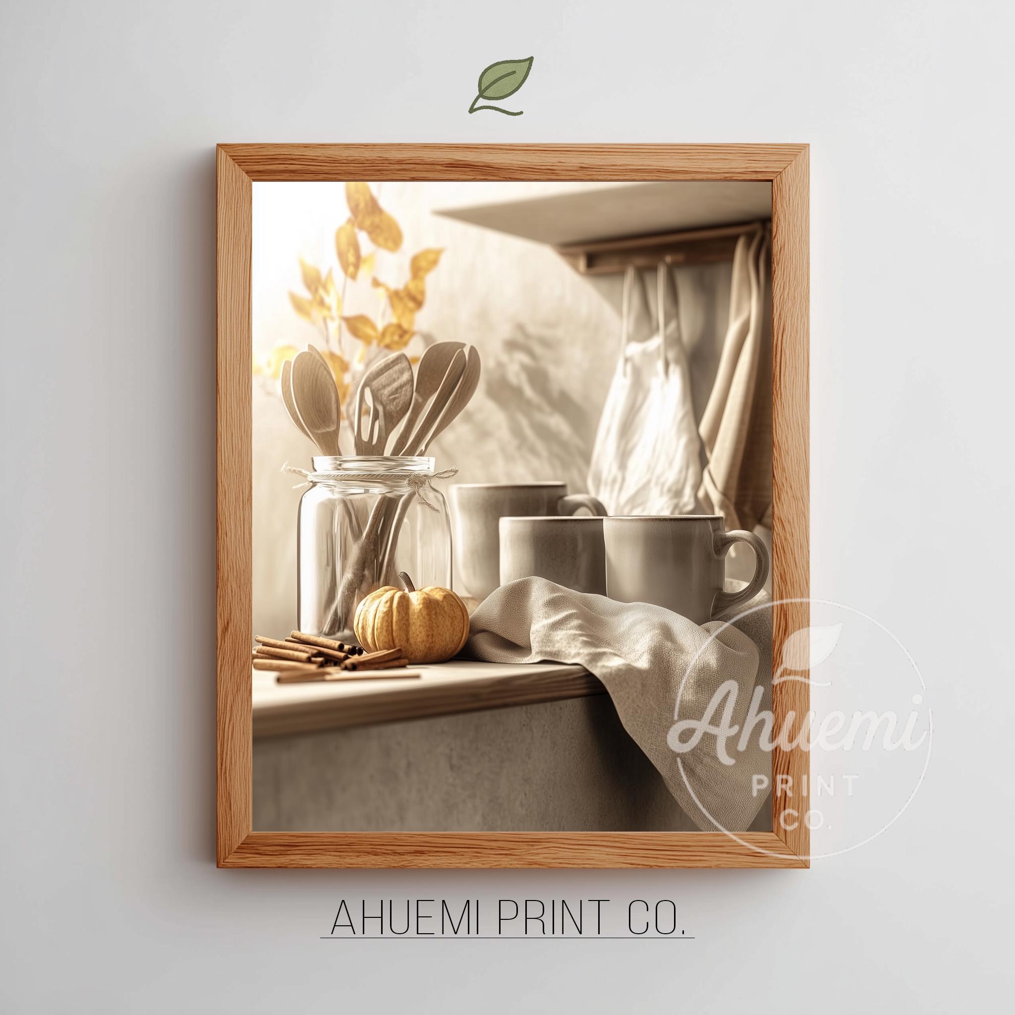 Immerse yourself in the charm with this rustic painting ofa cozy fall still life featuring elegant ceramic mugs nestled among autumn leaves and warm seasonal accents. An instantly downloadable print, it's perfect for elevating your decor with budget friendly charm. This gives you the flexibility to customize the size, frame, and material according to your personal taste and space, ensuring a perfect fit for your walls.