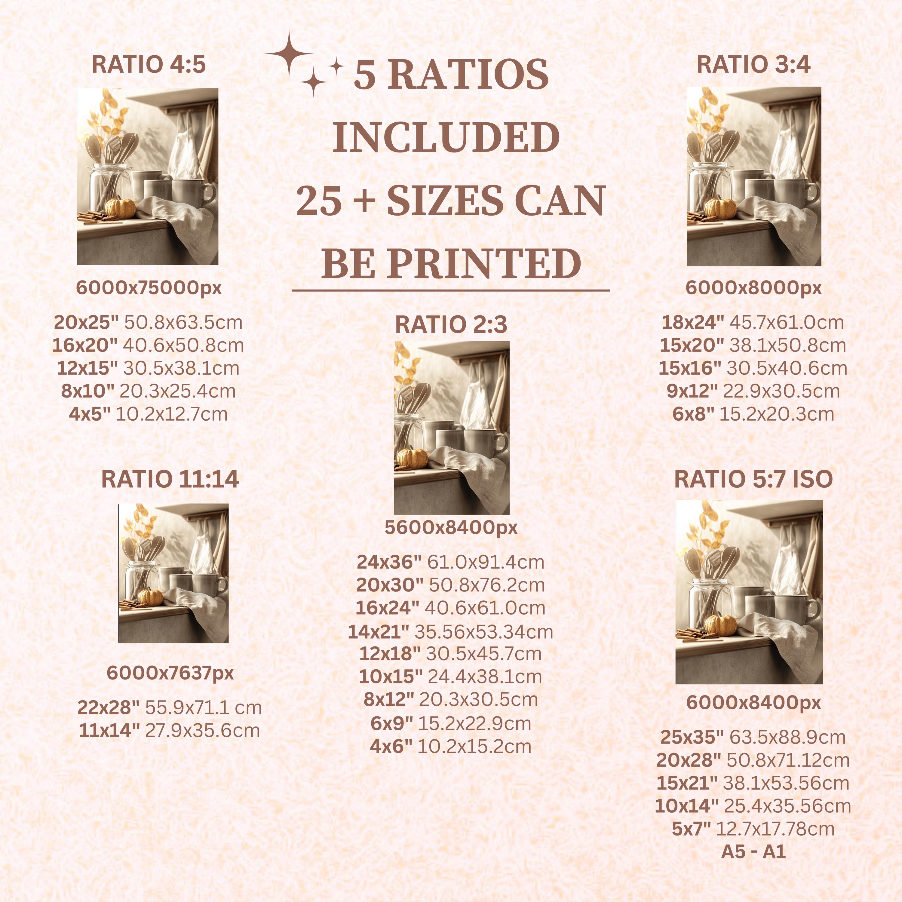 Each artwork includes 5 aspect ratios with 25+ print sizes. Most standard frames are covered. One custom resize per purchase available—message before ordering.