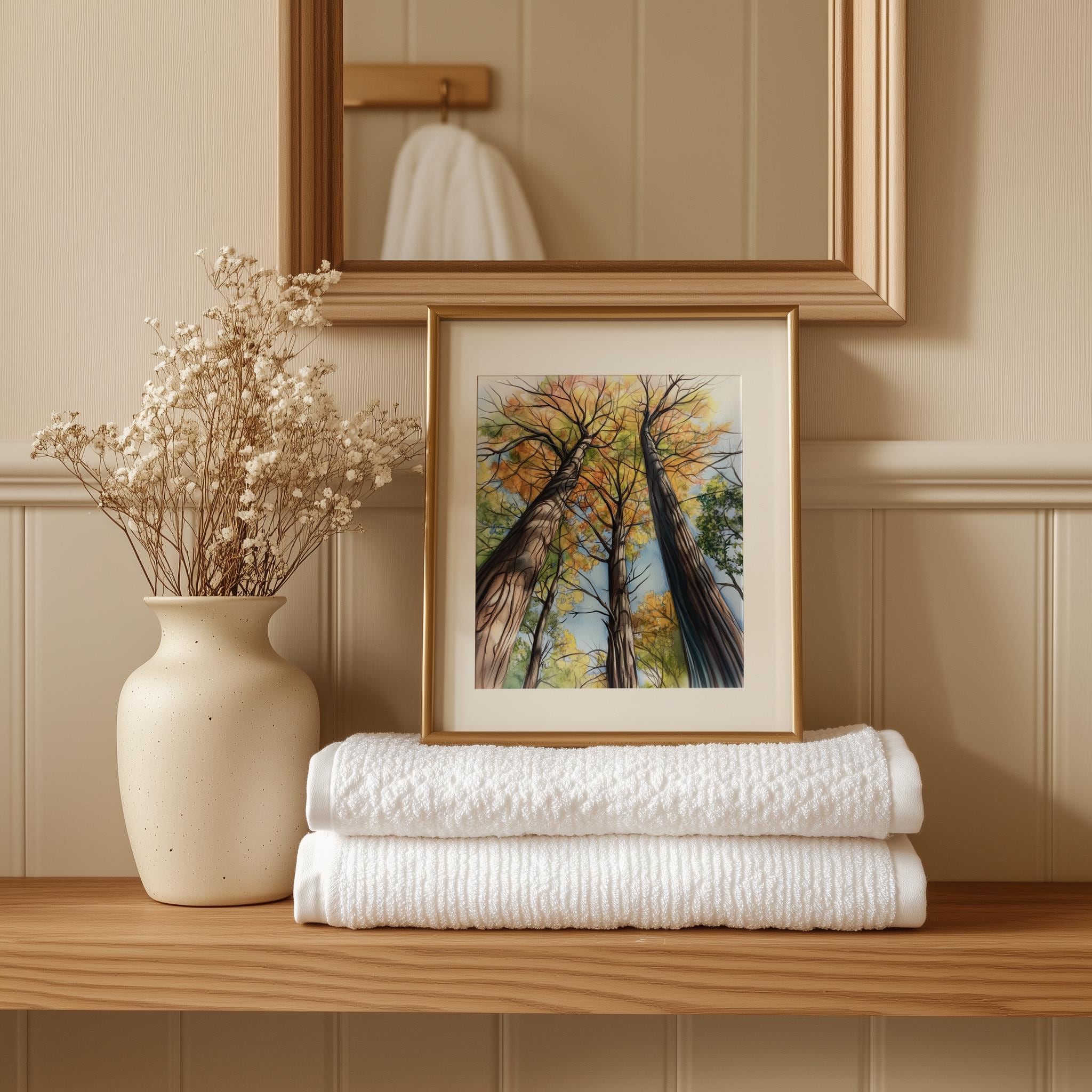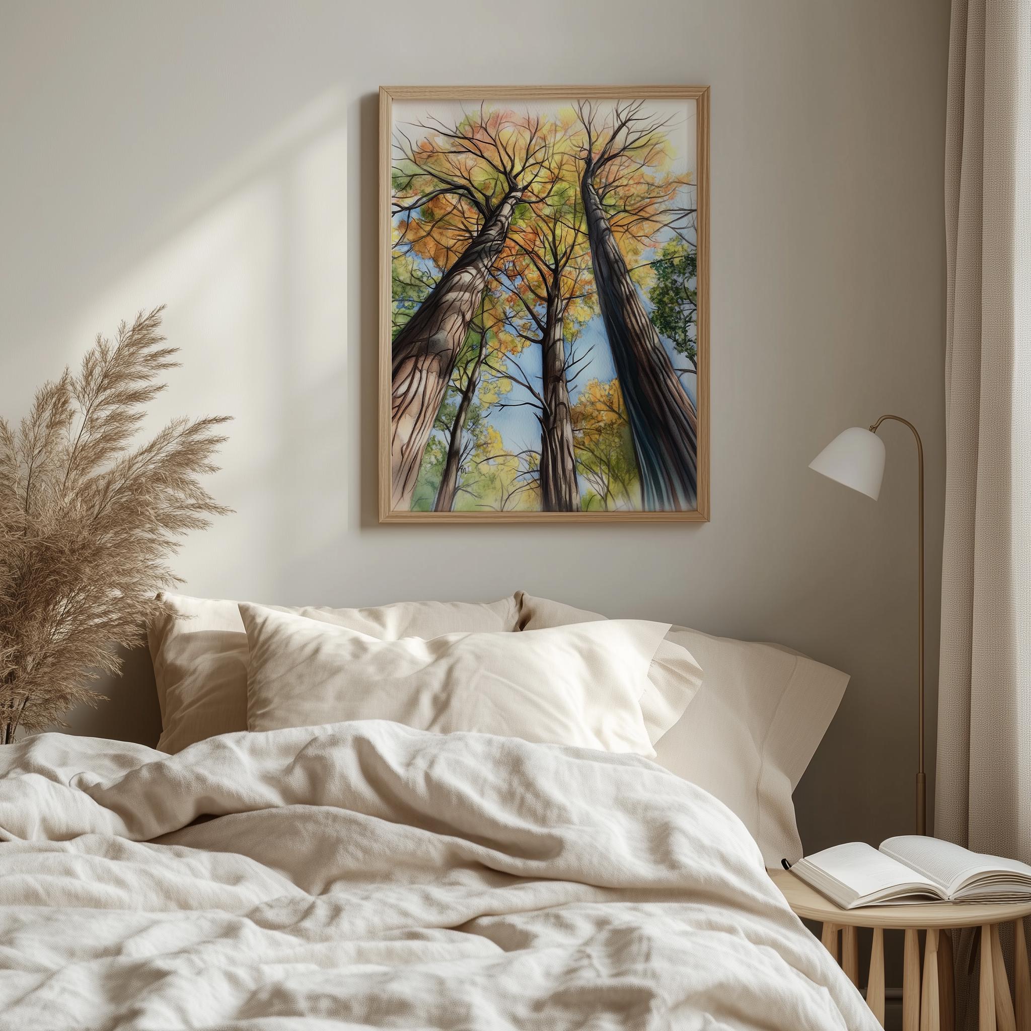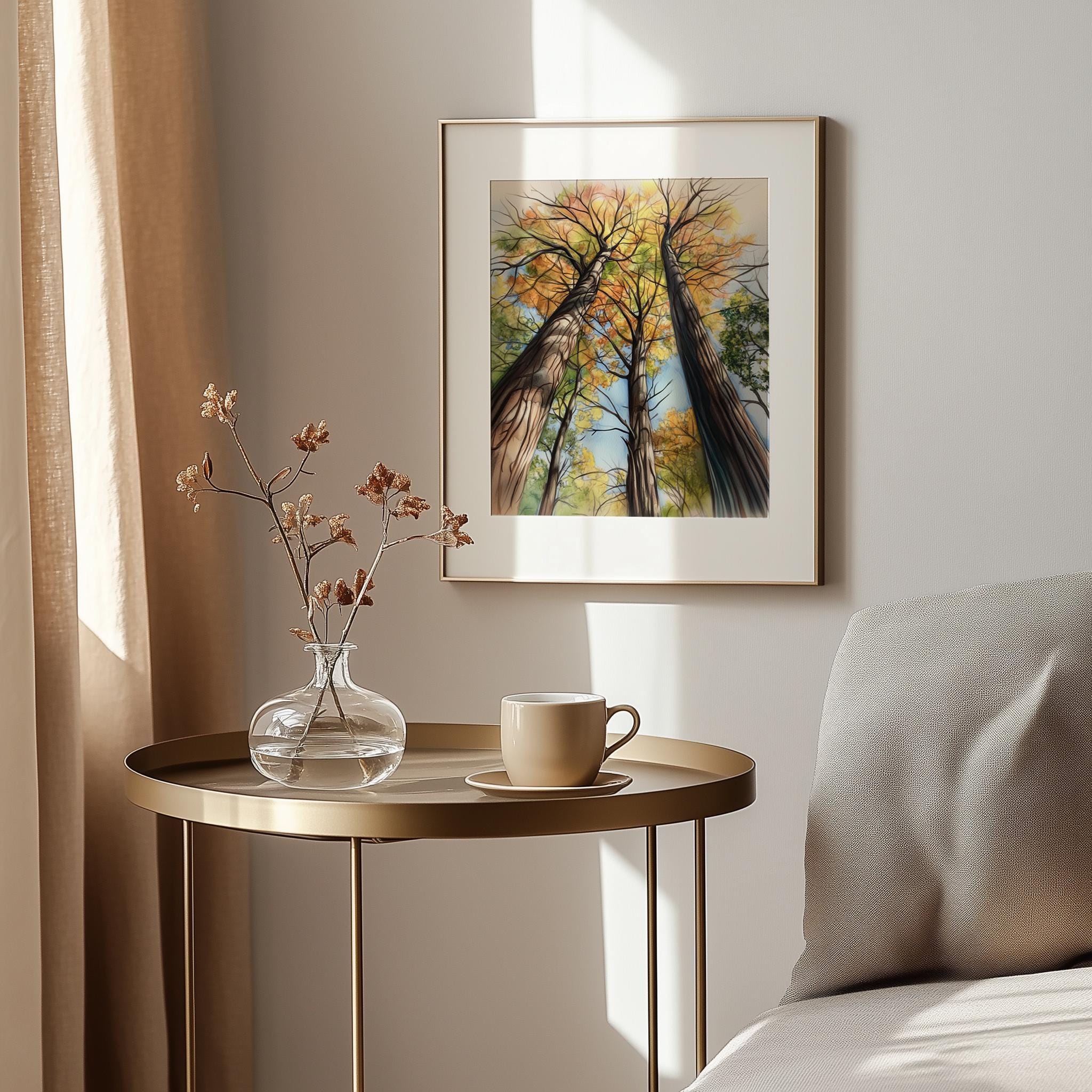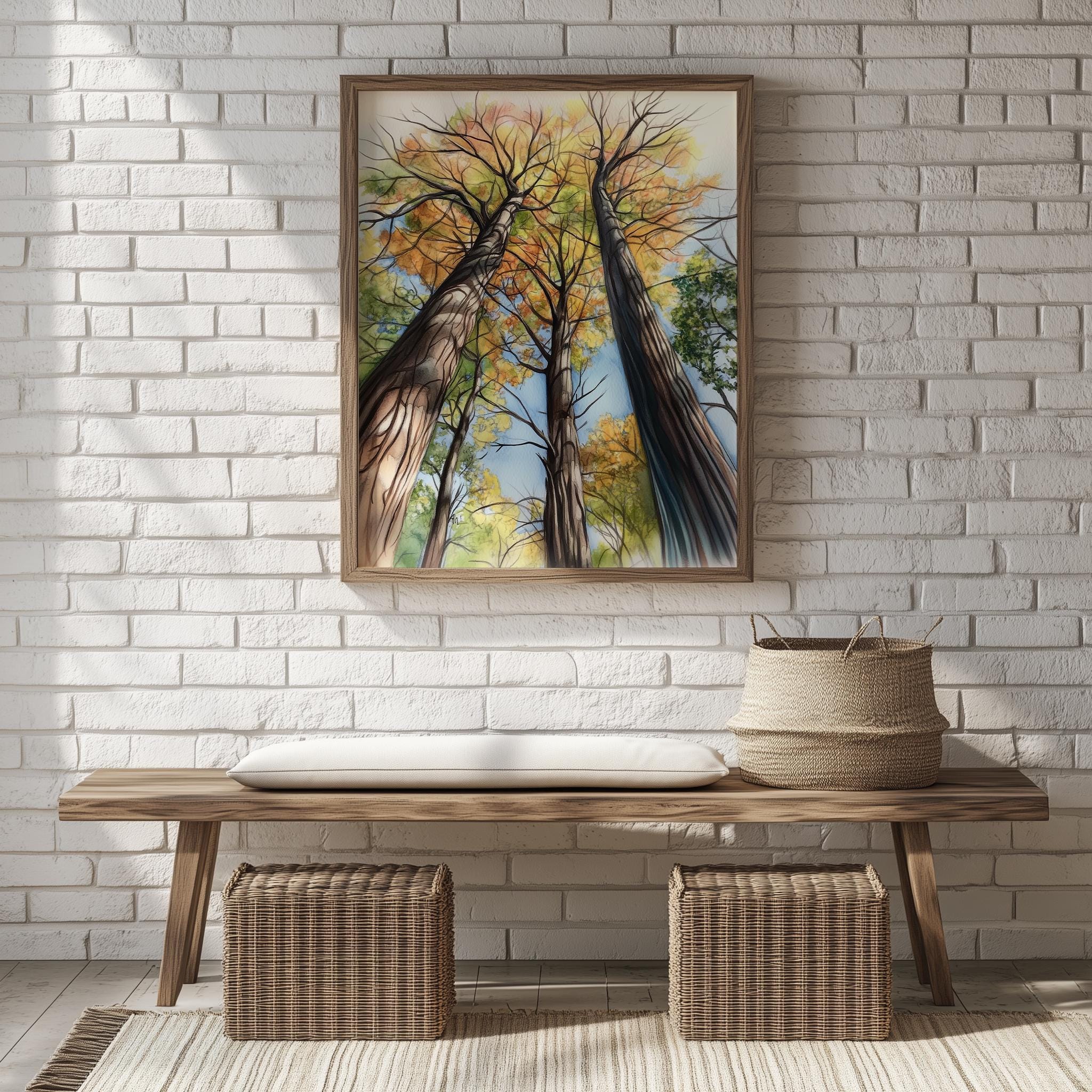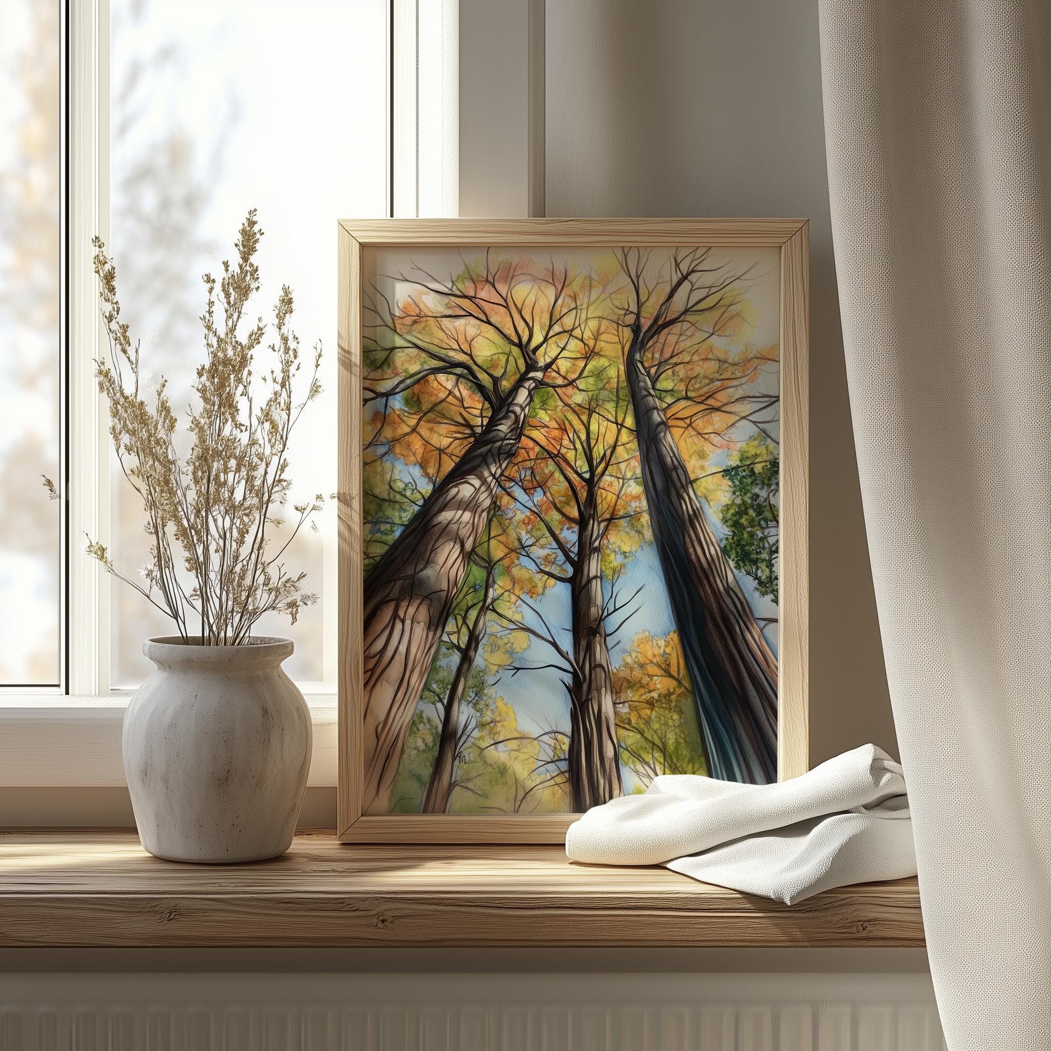 Immerse yourself in the charm with this rustic painting ofa serene autumn treetop canopy, where vibrant leaves dance in warm hues of orange and gold. An instantly downloadable print, it's perfect for elevating your decor with budget friendly charm. This gives you the flexibility to customize the size, frame, and material according to your personal taste and space, ensuring a perfect fit for your walls.