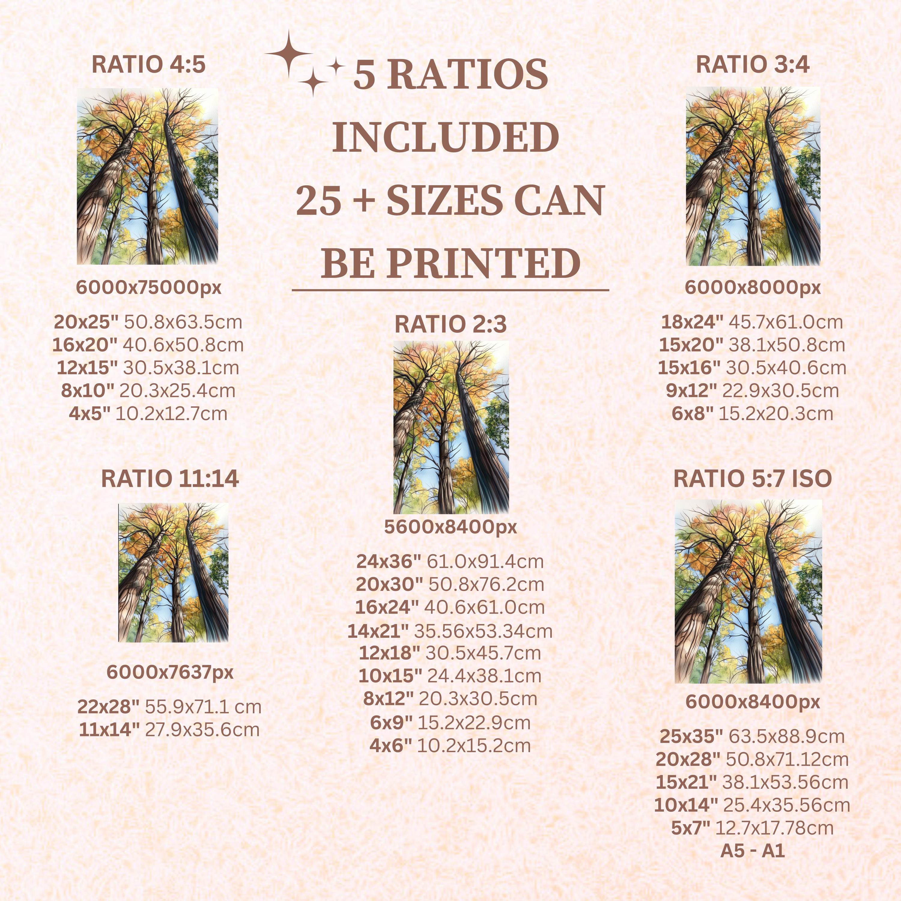 Each artwork includes 5 aspect ratios with 25+ print sizes. Most standard frames are covered. One custom resize per purchase available—message before ordering.