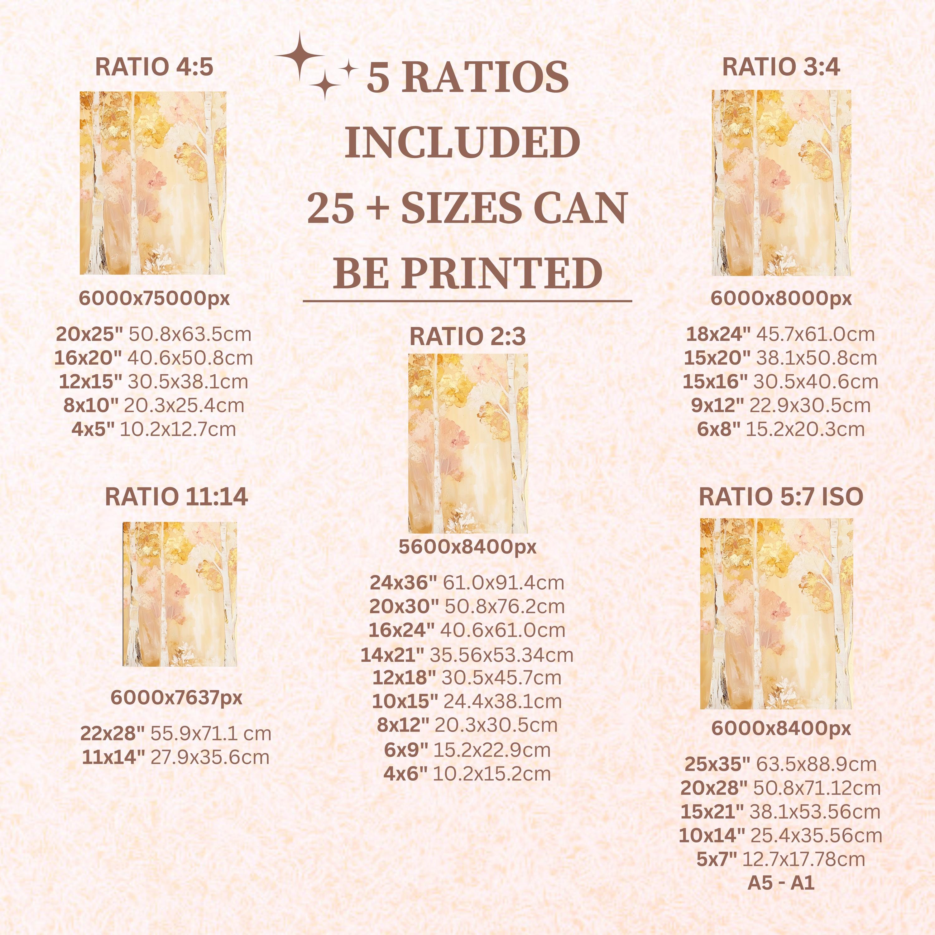 Each artwork includes 5 aspect ratios with 25+ print sizes. Most standard frames are covered. One custom resize per purchase available—message before ordering.