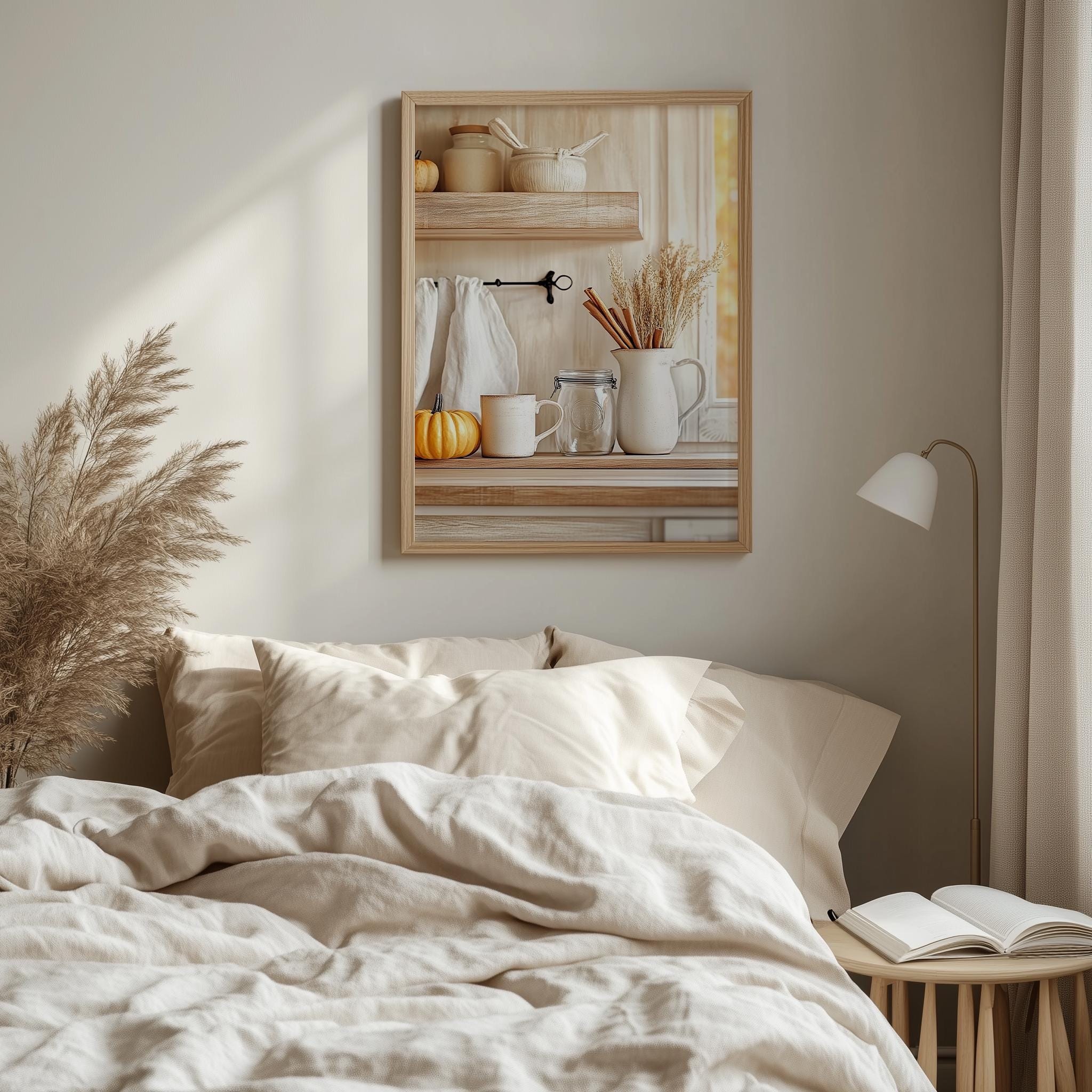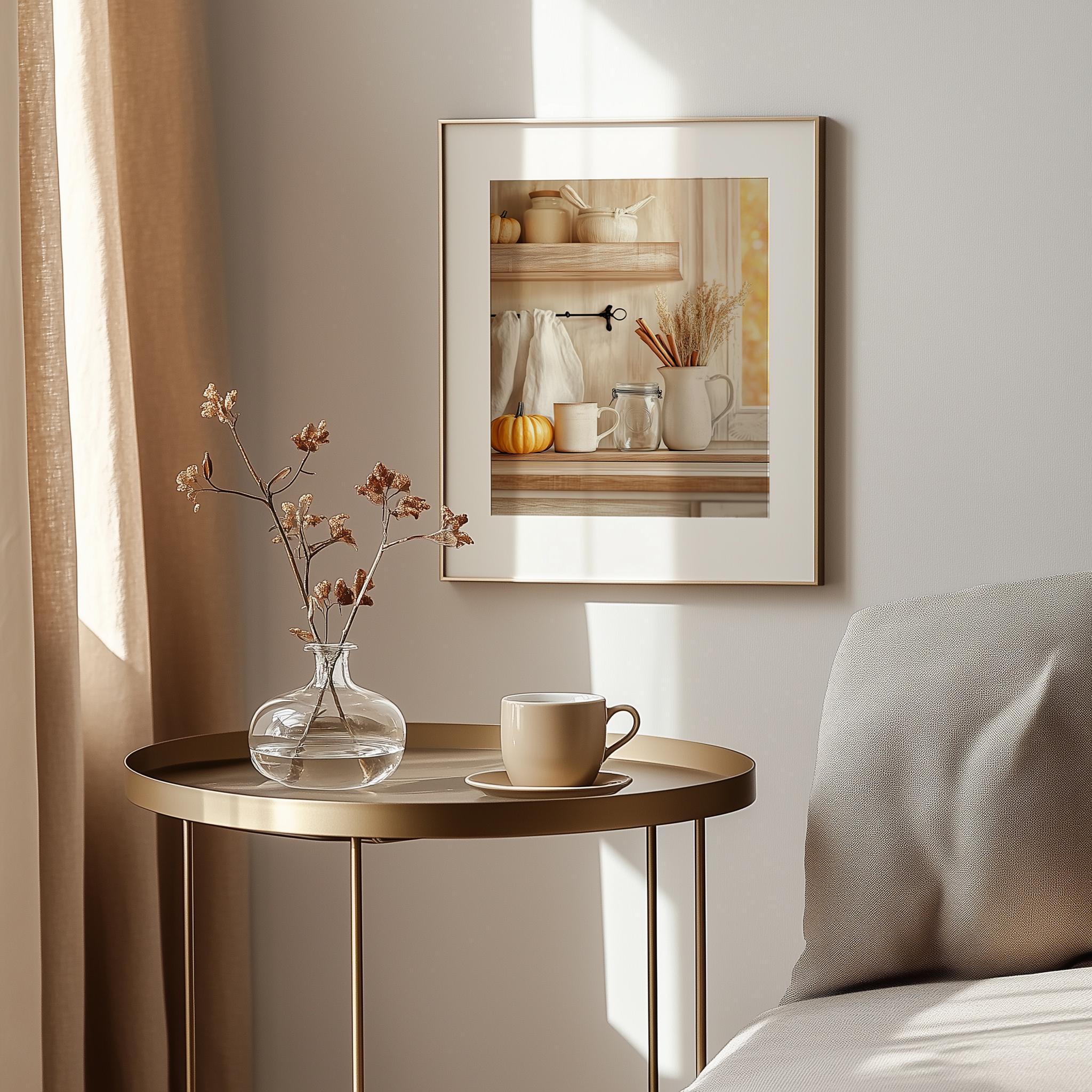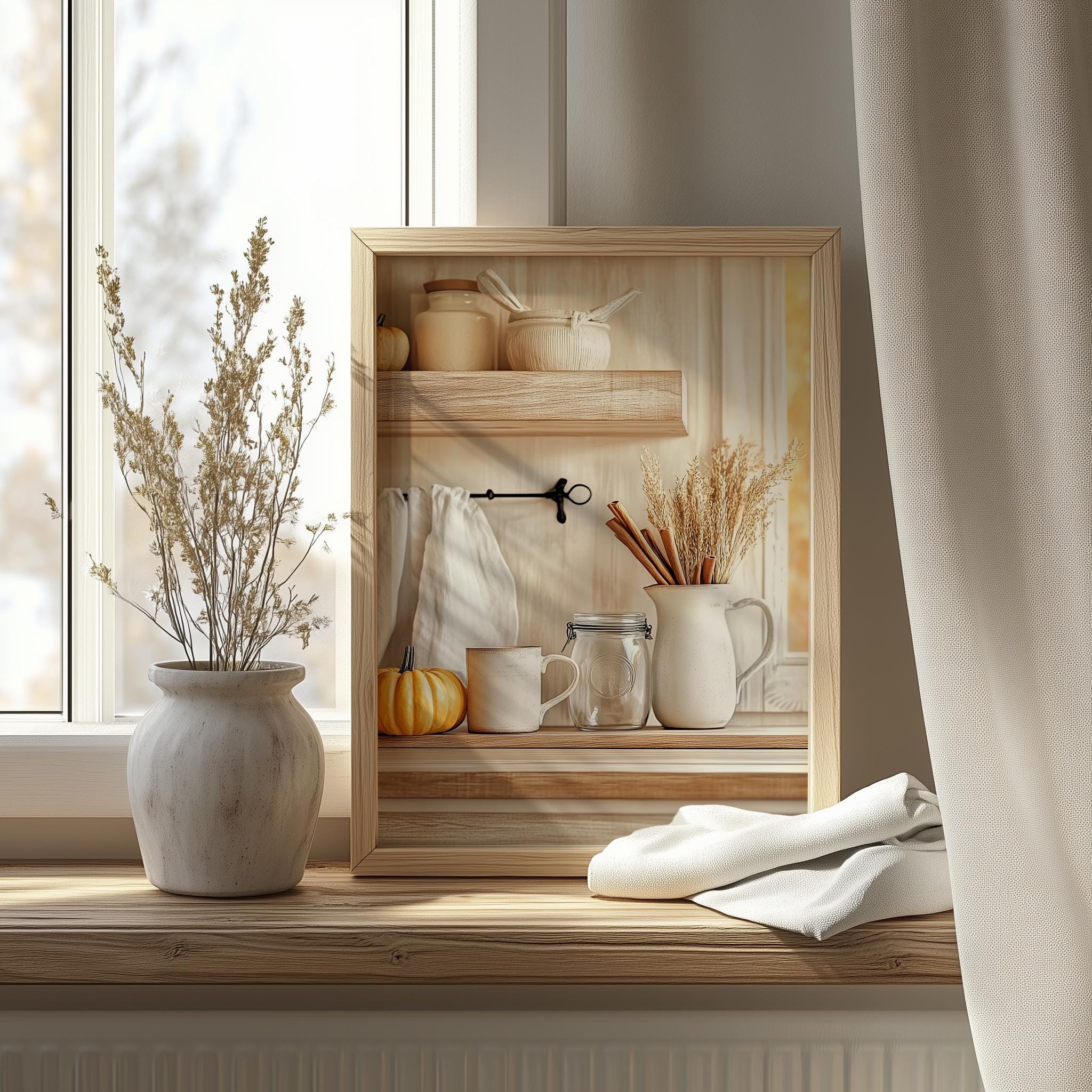 Immerse yourself in the charm with this rustic painting ofa cozy fall kitchen shelf adorned with seasonal elements. An instantly downloadable print, it's perfect for elevating your decor with budget friendly charm. This gives you the flexibility to customize the size, frame, and material according to your personal taste and space, ensuring a perfect fit for your walls.