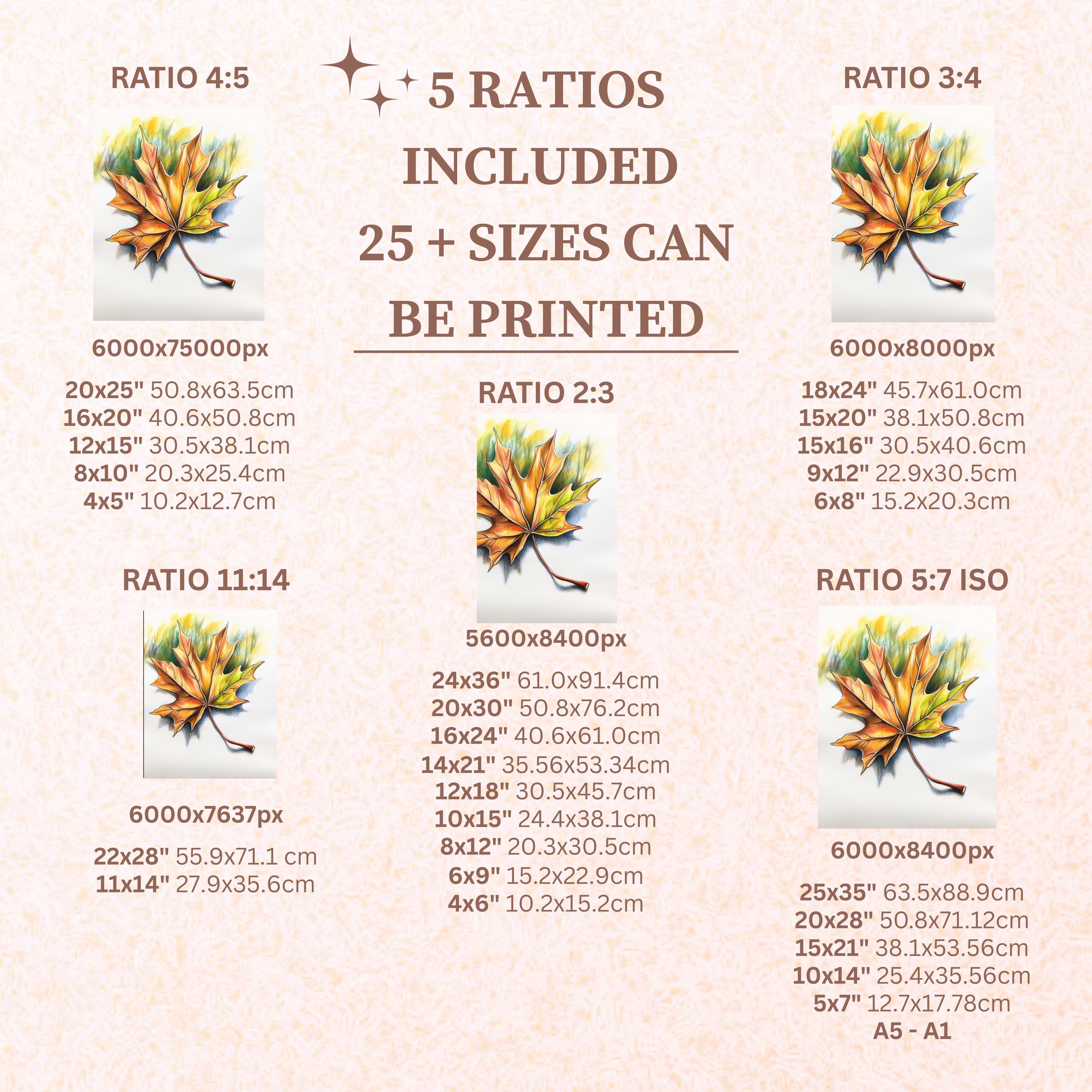 Each artwork includes 5 aspect ratios with 25+ print sizes. Most standard frames are covered. One custom resize per purchase available—message before ordering.