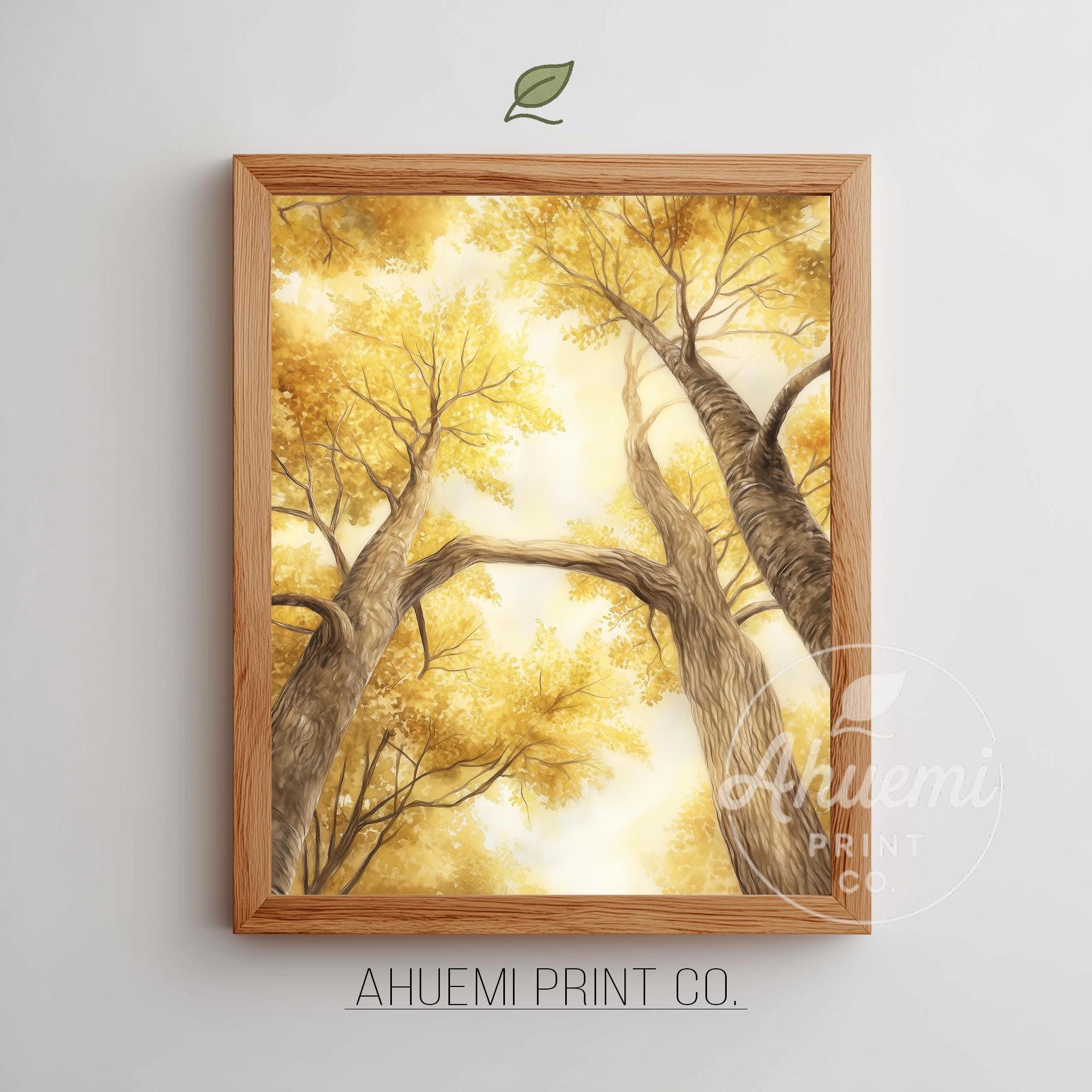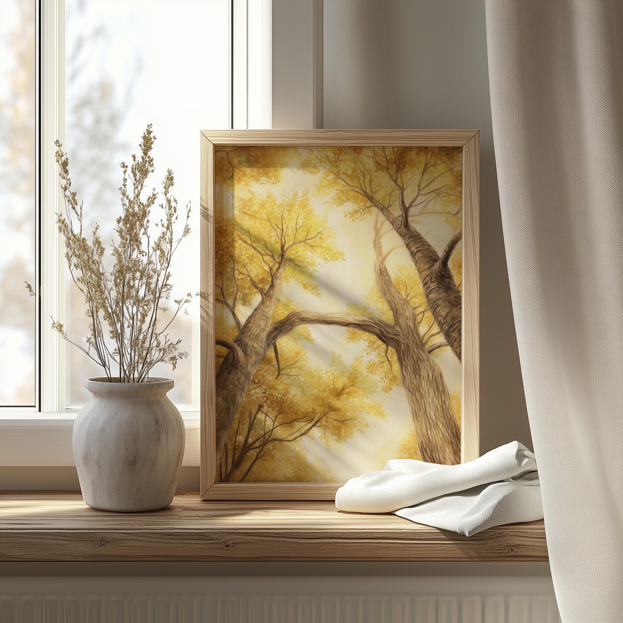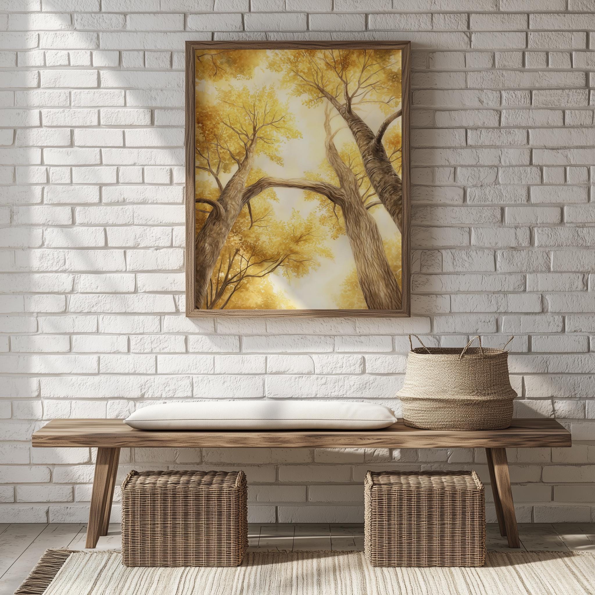 Immerse yourself in the charm with this rustic painting ofa golden autumn tree canopy, where luminous leaves dance in the warm sunlight. An instantly downloadable print, it's perfect for elevating your decor with budget friendly charm. This gives you the flexibility to customize the size, frame, and material according to your personal taste and space, ensuring a perfect fit for your walls.