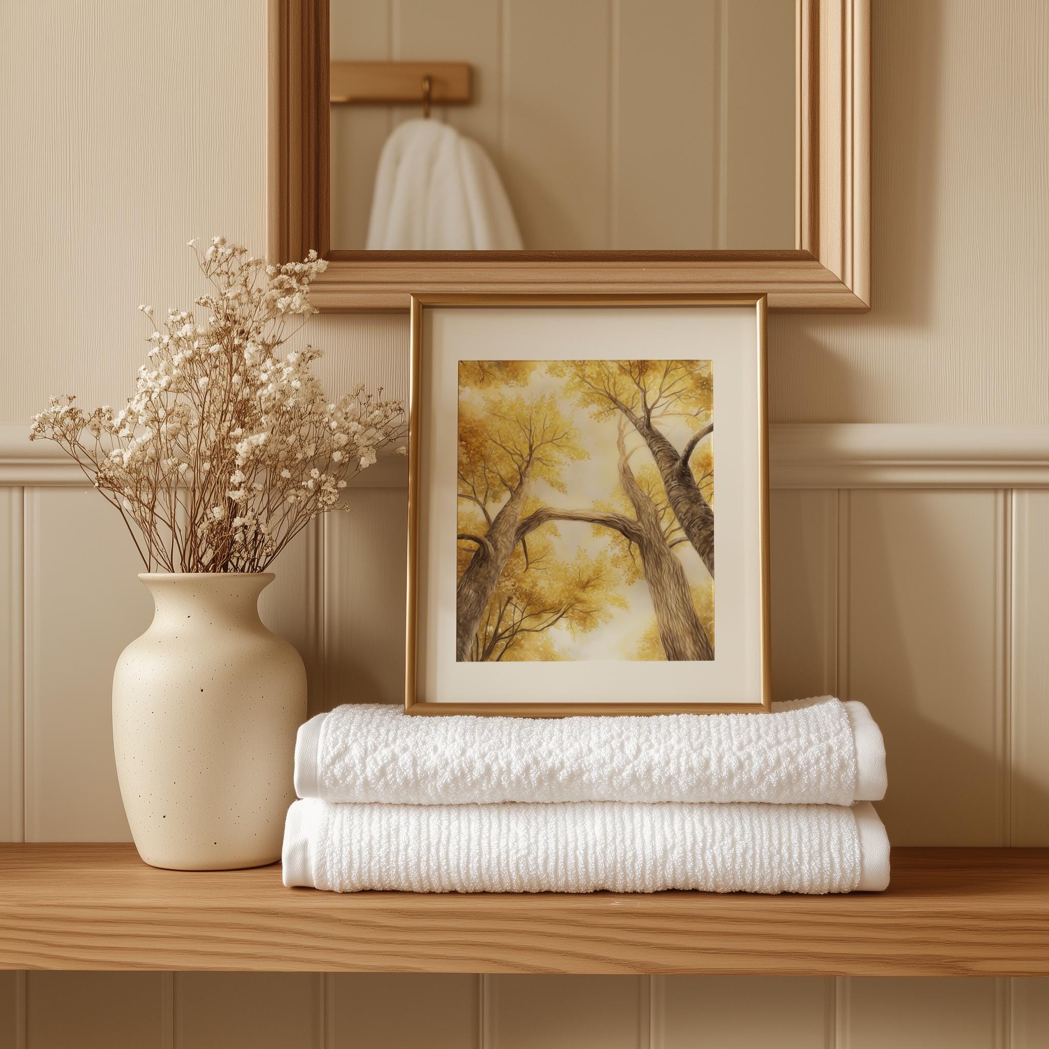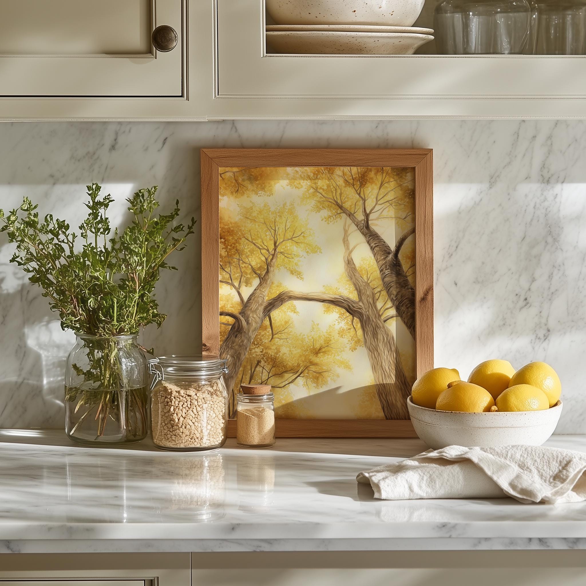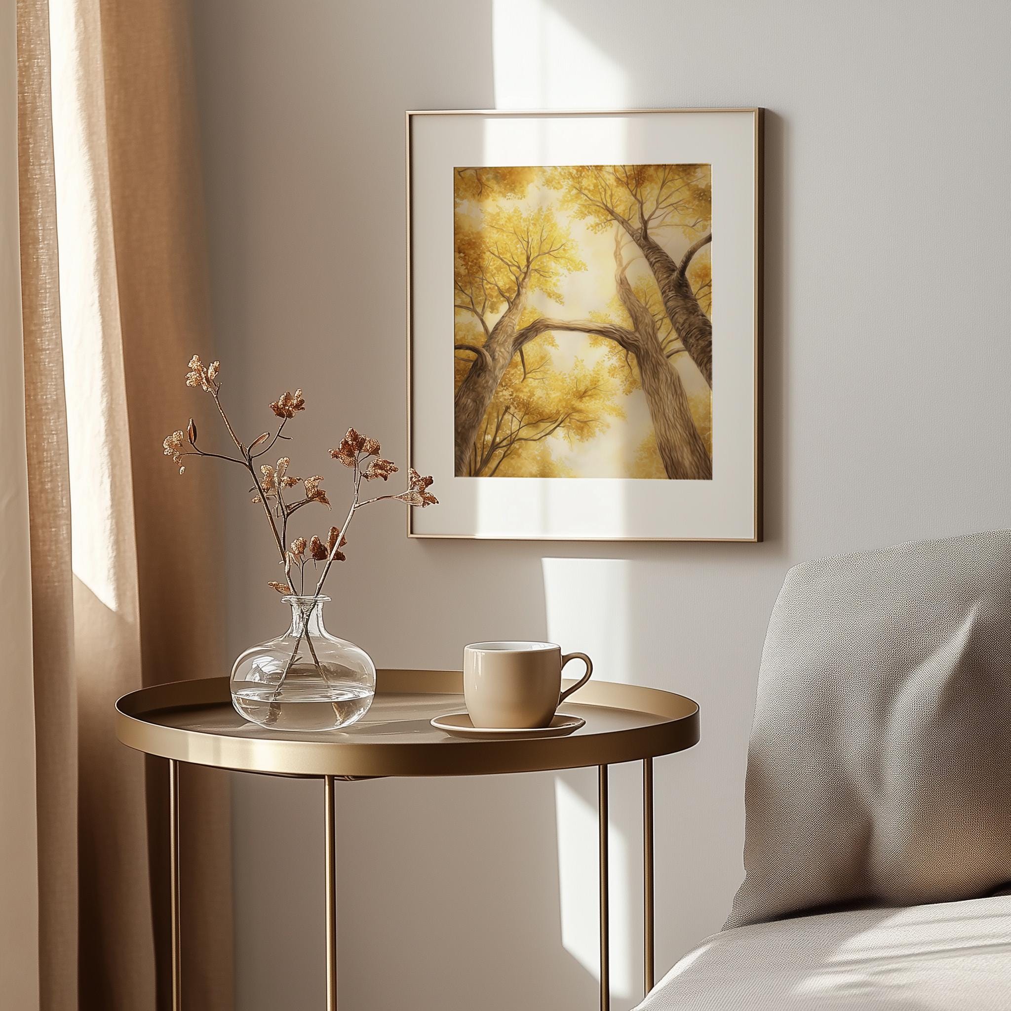 Immerse yourself in the charm with this rustic painting ofa golden autumn tree canopy, where luminous leaves dance in the warm sunlight. An instantly downloadable print, it's perfect for elevating your decor with budget friendly charm. This gives you the flexibility to customize the size, frame, and material according to your personal taste and space, ensuring a perfect fit for your walls.
