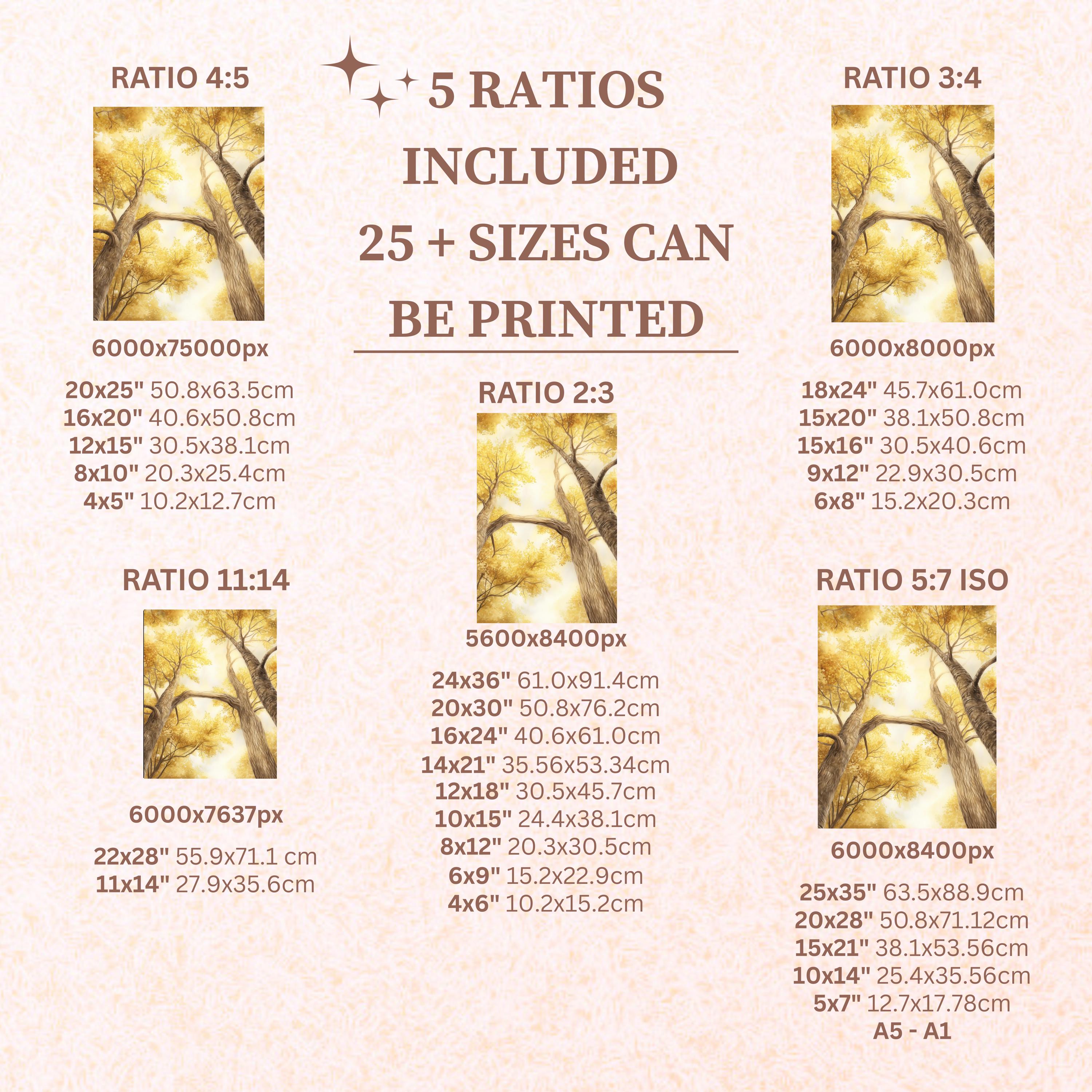 Each artwork includes 5 aspect ratios with 25+ print sizes. Most standard frames are covered. One custom resize per purchase available—message before ordering.