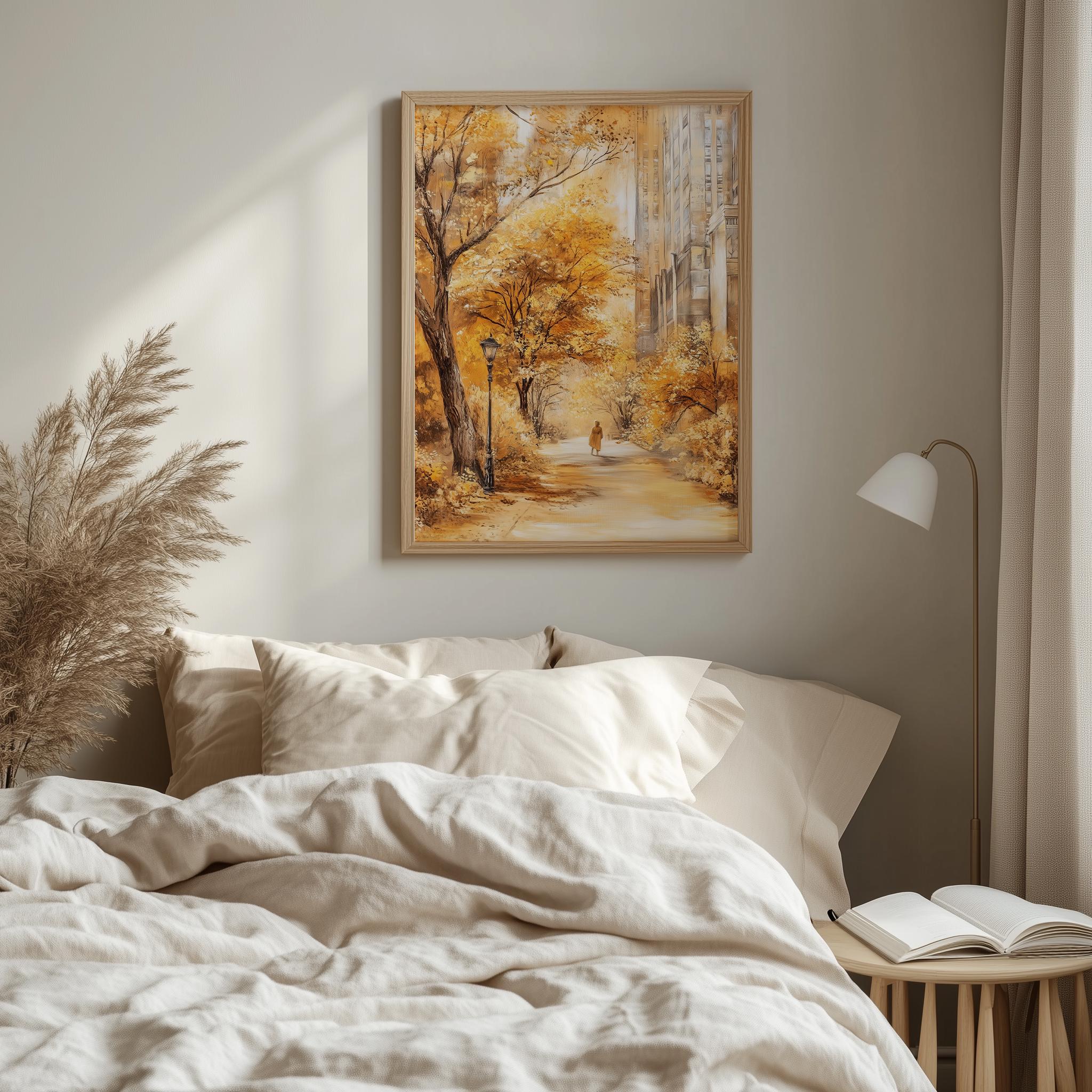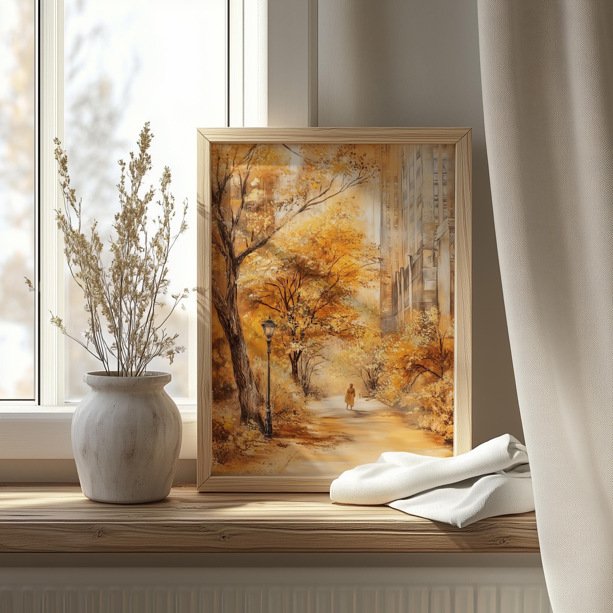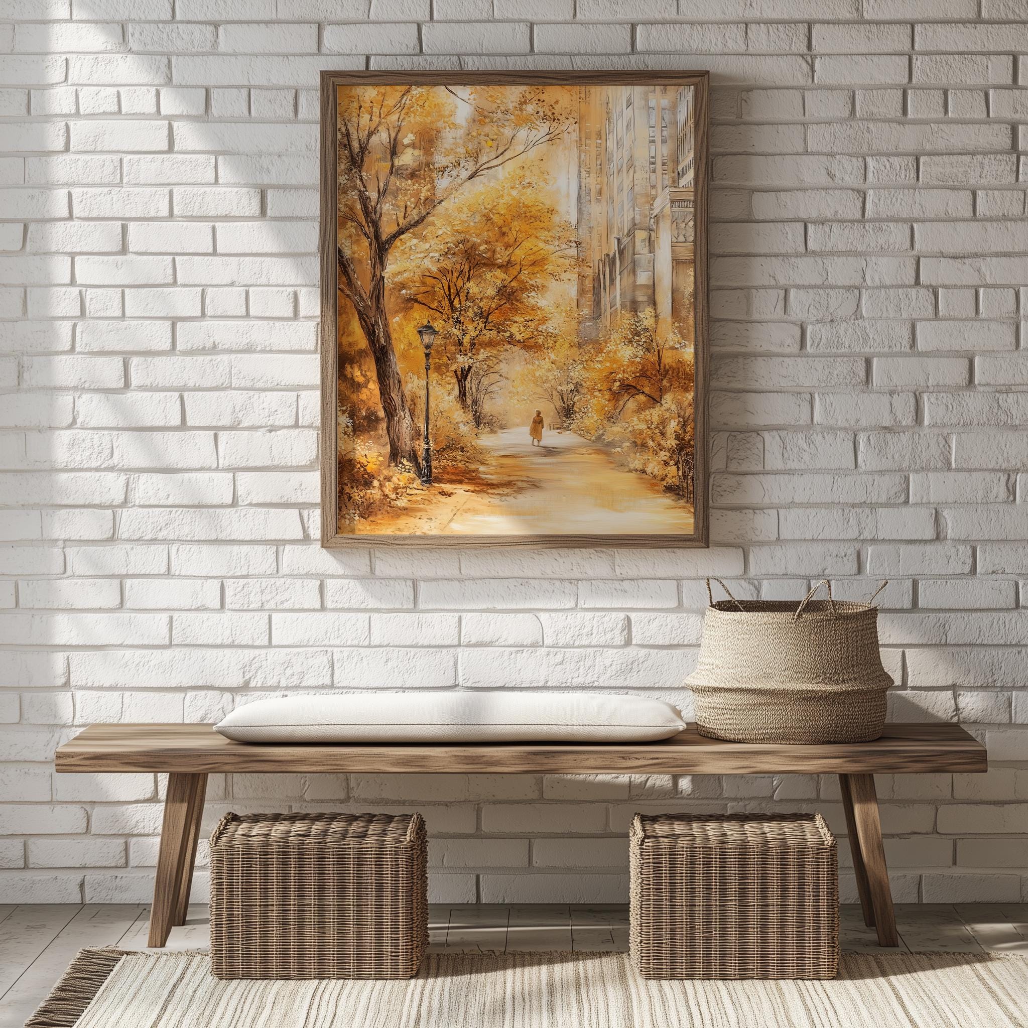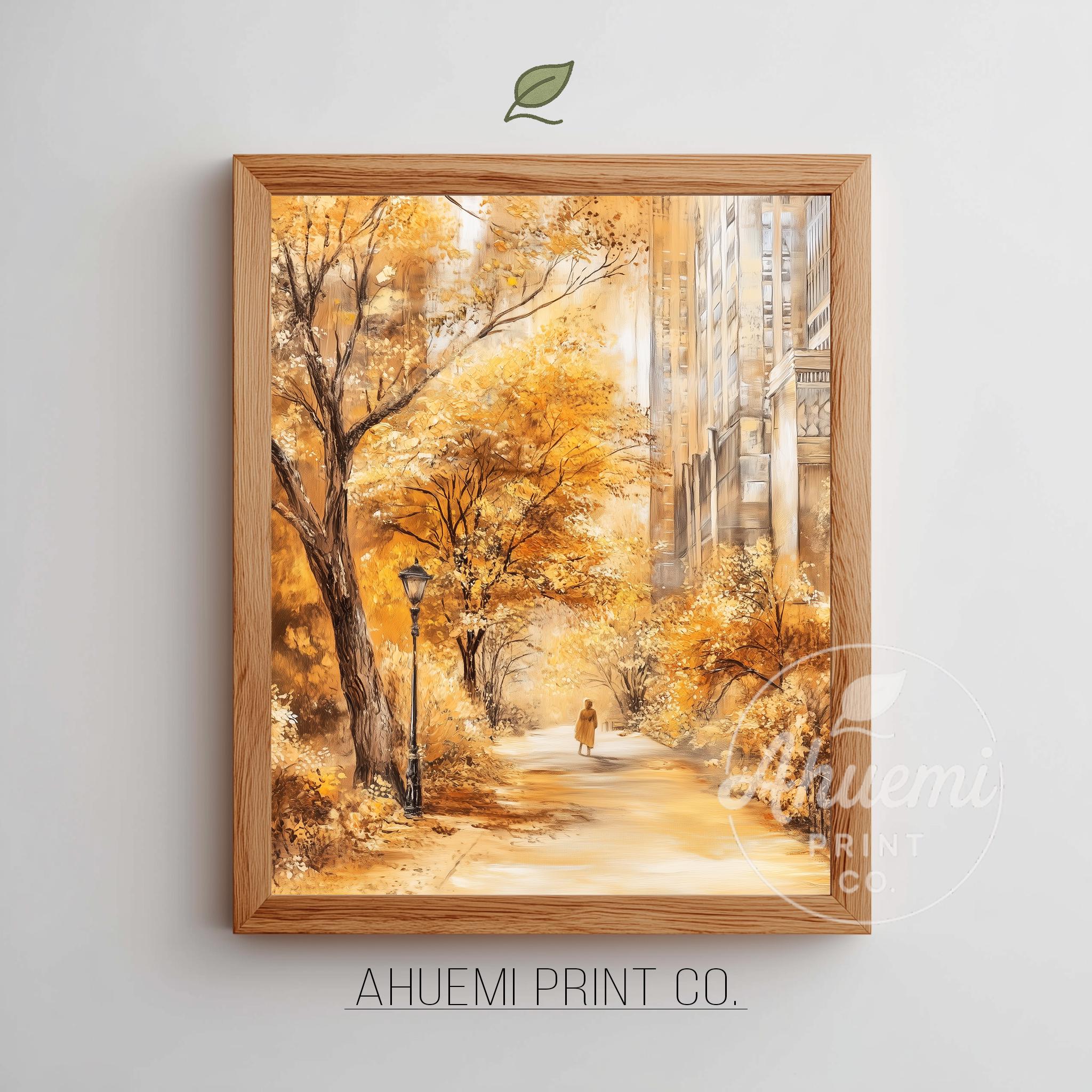 Immerse yourself in the charm with this rustic painting ofa serene urban park path adorned with vibrant golden foliage. An instantly downloadable print, it's perfect for elevating your decor with budget friendly charm. This gives you the flexibility to customize the size, frame, and material according to your personal taste and space, ensuring a perfect fit for your walls.