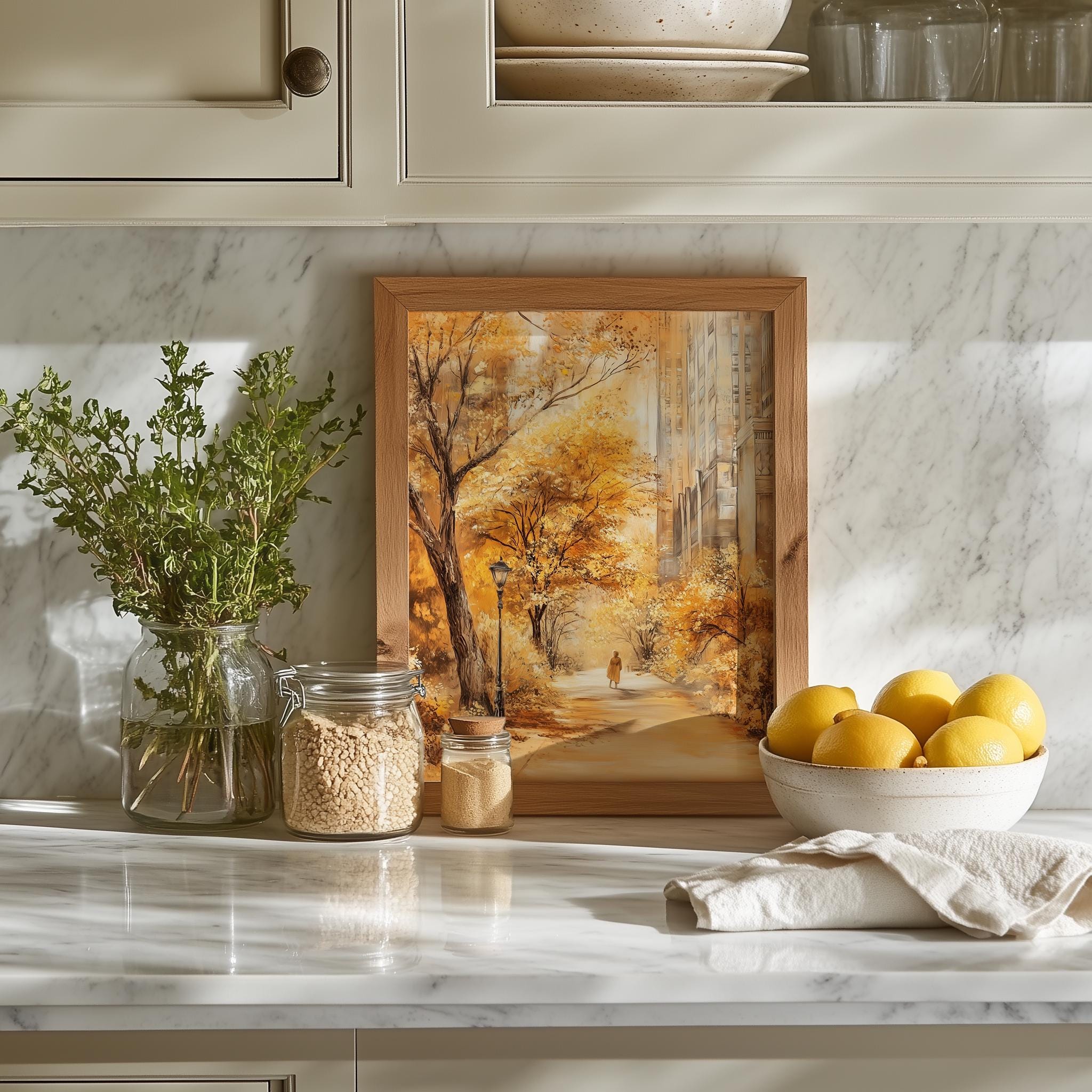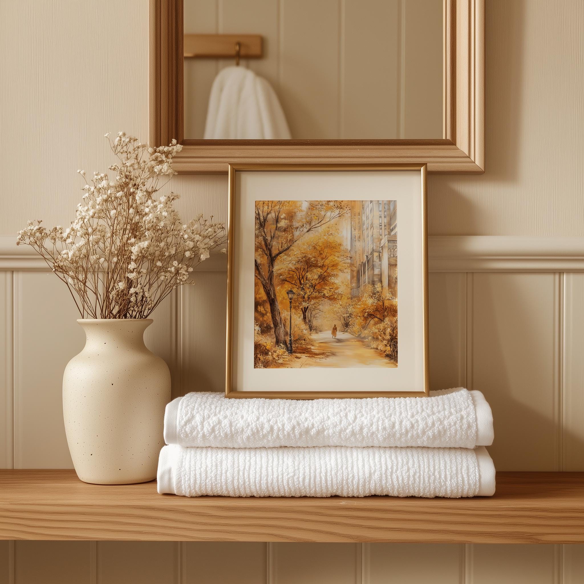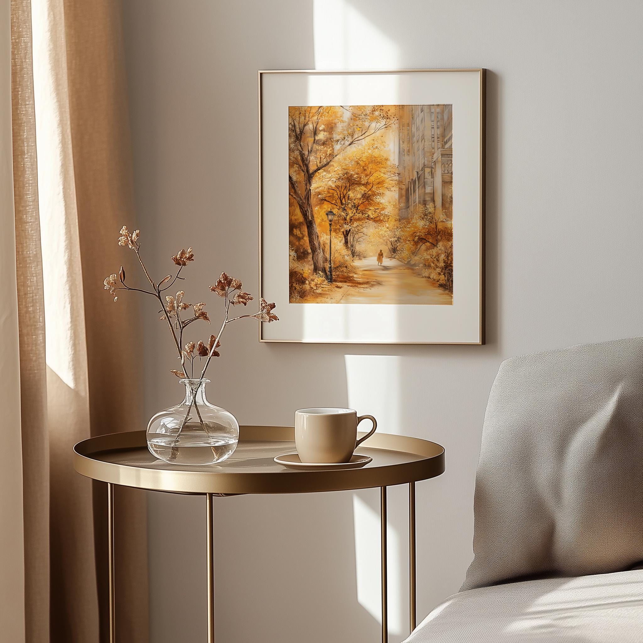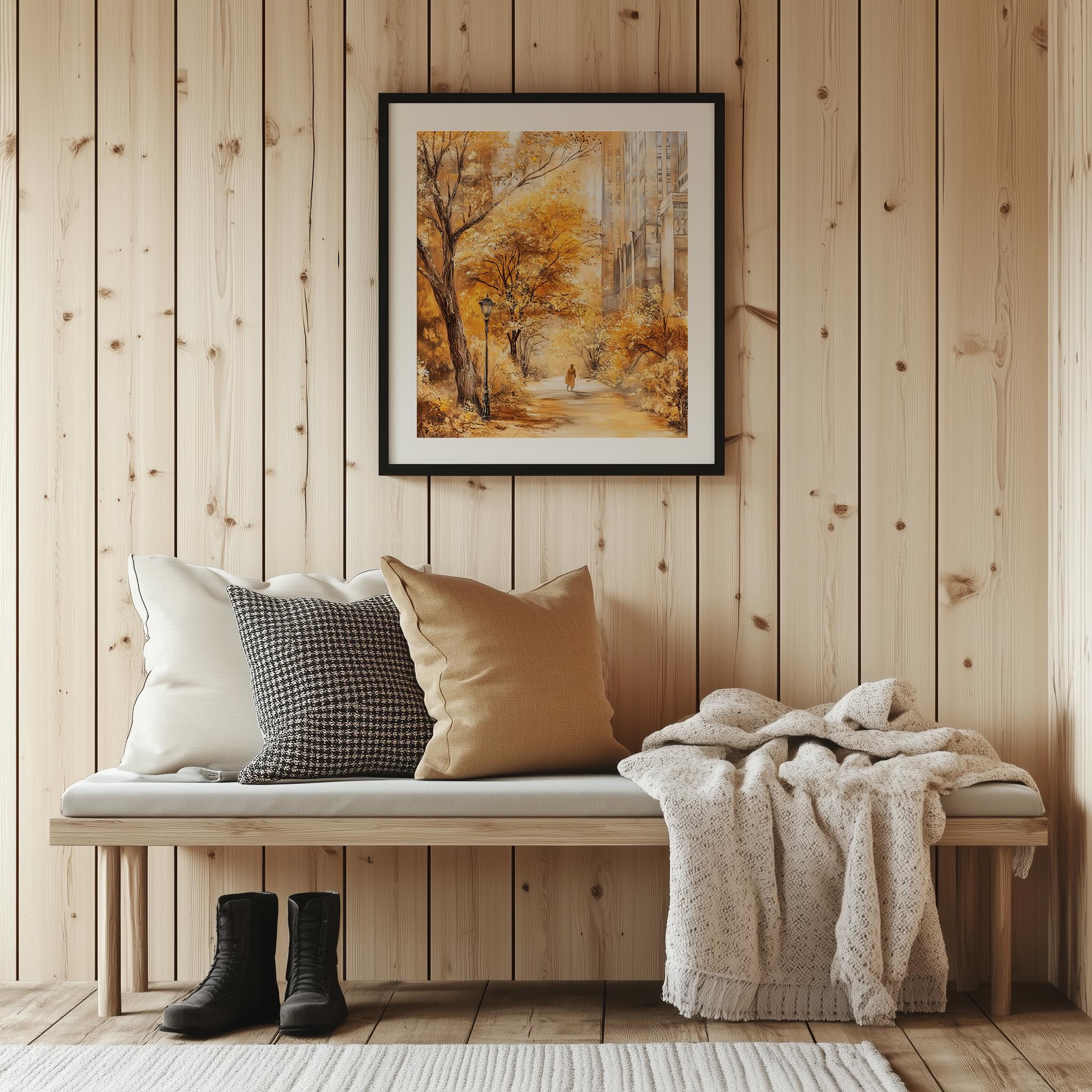 Immerse yourself in the charm with this rustic painting ofa serene urban park path adorned with vibrant golden foliage. An instantly downloadable print, it's perfect for elevating your decor with budget friendly charm. This gives you the flexibility to customize the size, frame, and material according to your personal taste and space, ensuring a perfect fit for your walls.
