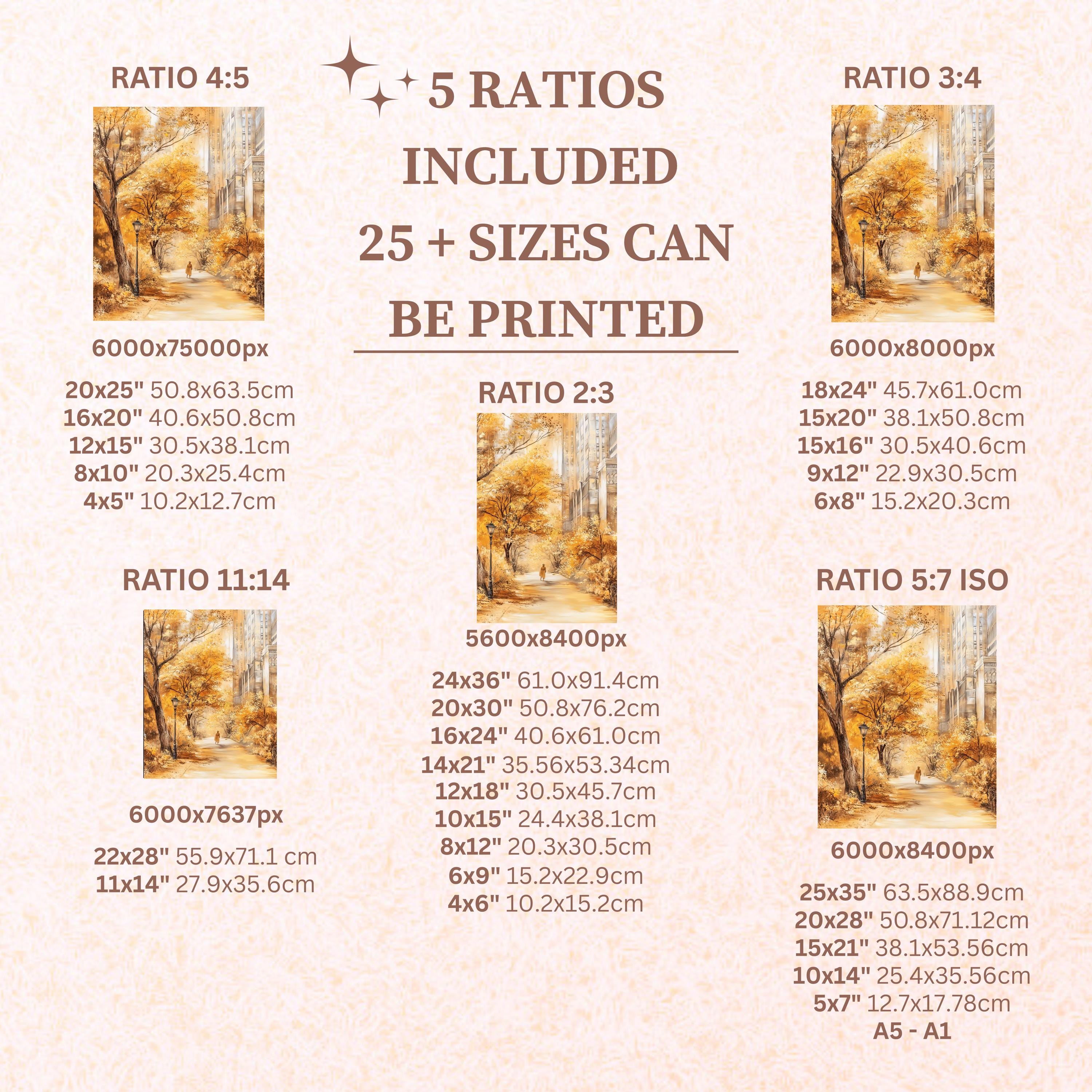 Each artwork includes 5 aspect ratios with 25+ print sizes. Most standard frames are covered. One custom resize per purchase available—message before ordering.
