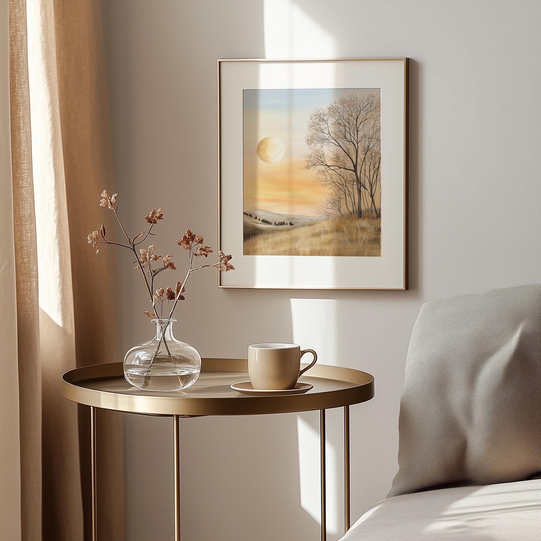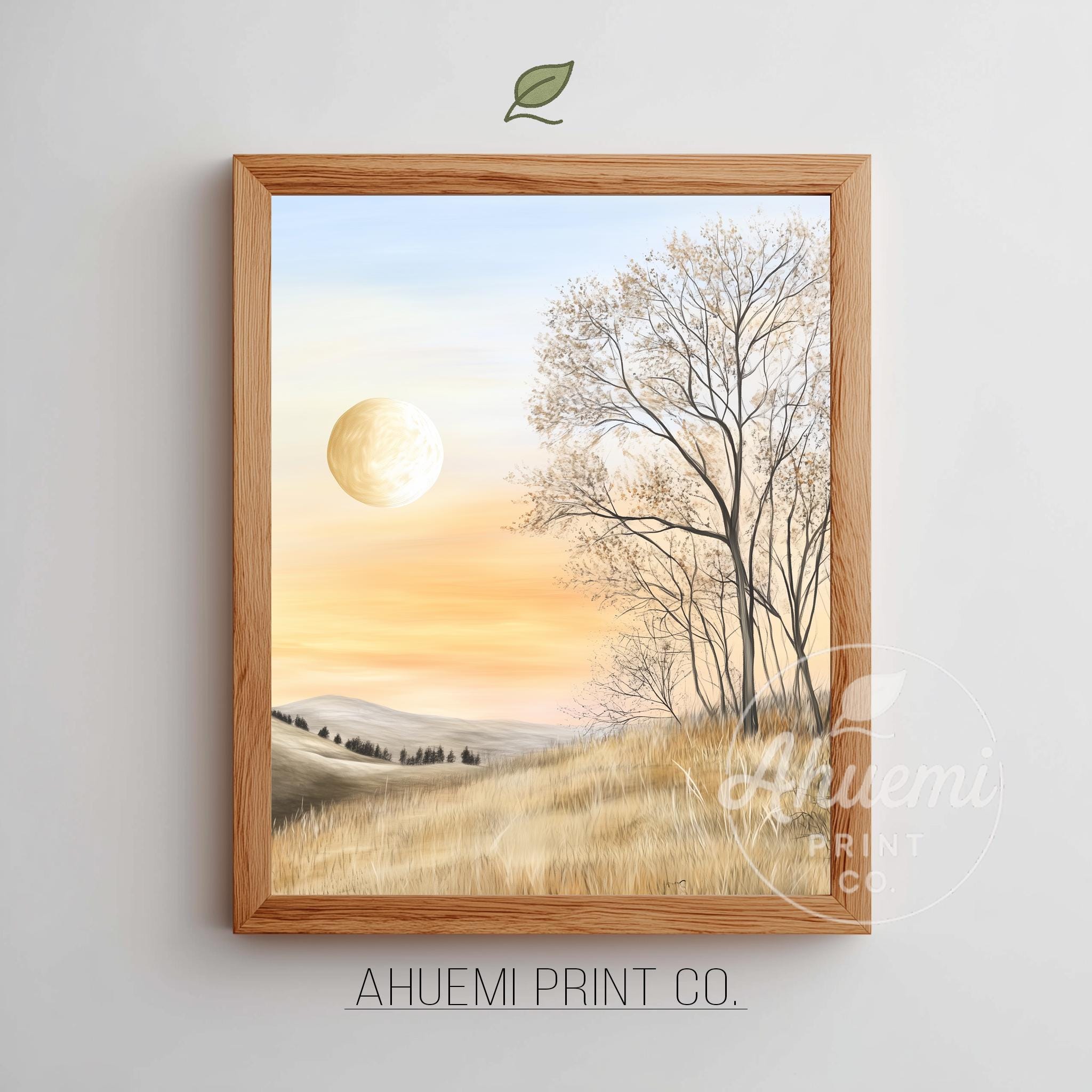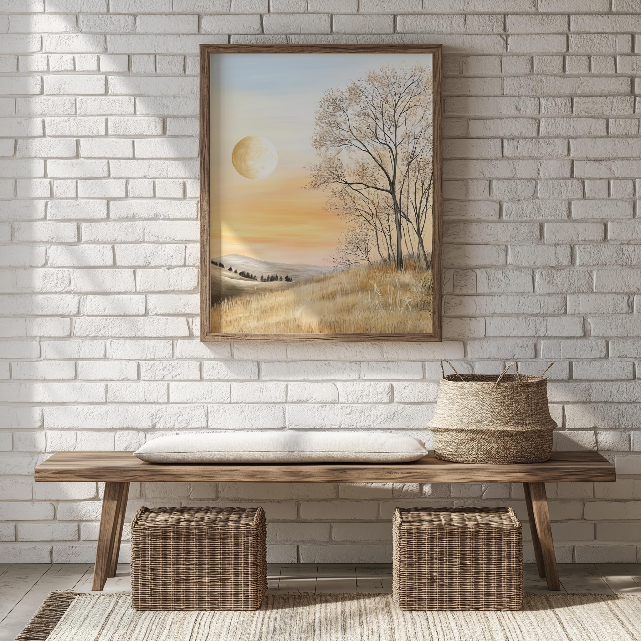 Immerse yourself in the charm with this rustic painting ofa tranquil autumn moonrise over a serene farmhouse landscape. An instantly downloadable print, it's perfect for elevating your decor with budget friendly charm. This gives you the flexibility to customize the size, frame, and material according to your personal taste and space, ensuring a perfect fit for your walls.