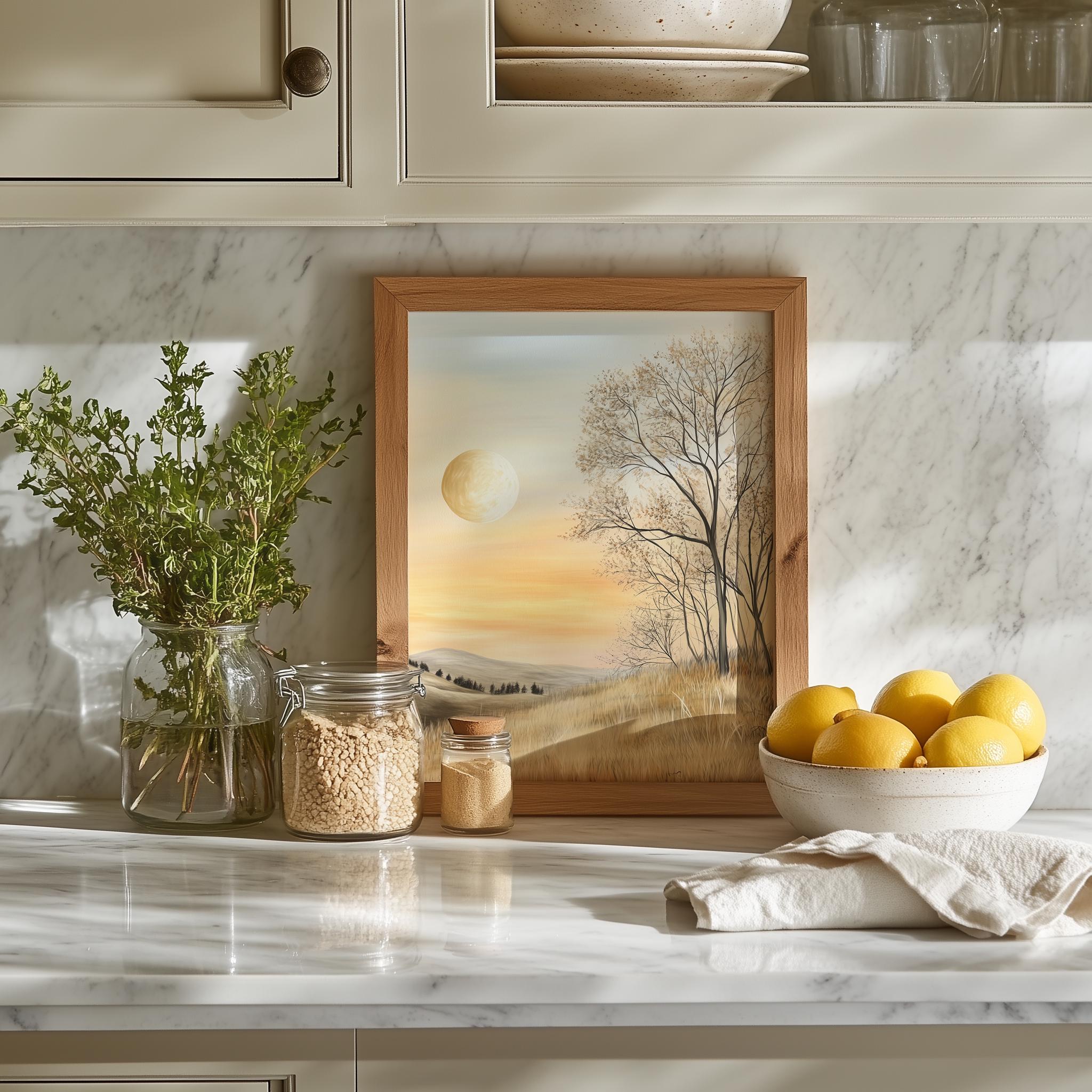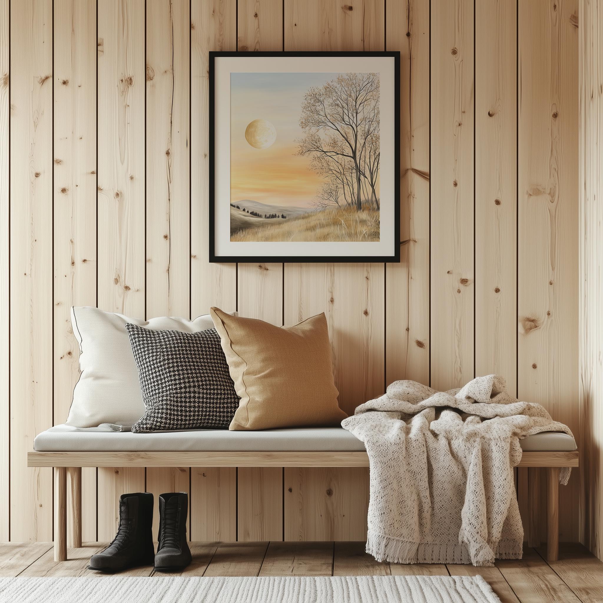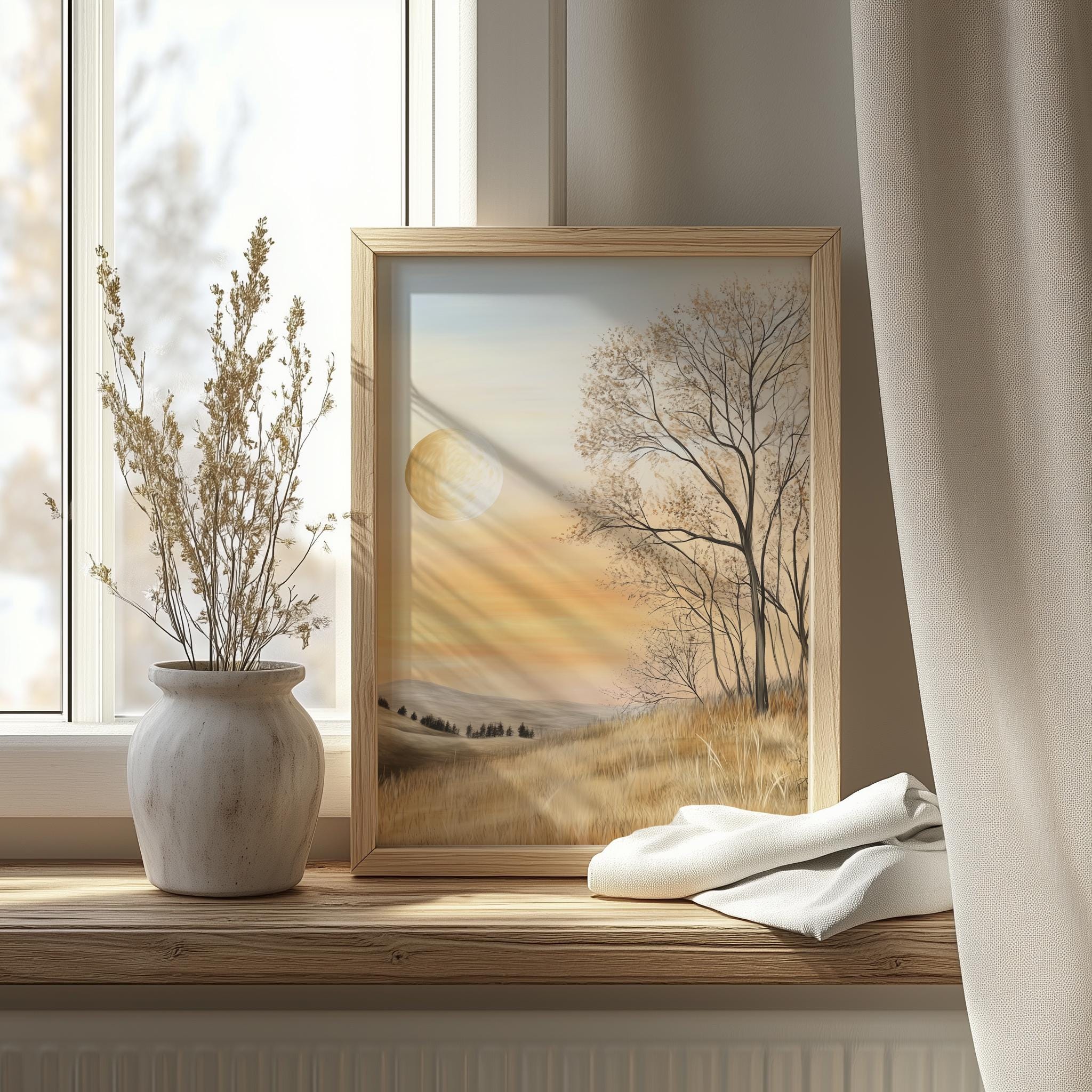 Immerse yourself in the charm with this rustic painting ofa tranquil autumn moonrise over a serene farmhouse landscape. An instantly downloadable print, it's perfect for elevating your decor with budget friendly charm. This gives you the flexibility to customize the size, frame, and material according to your personal taste and space, ensuring a perfect fit for your walls.