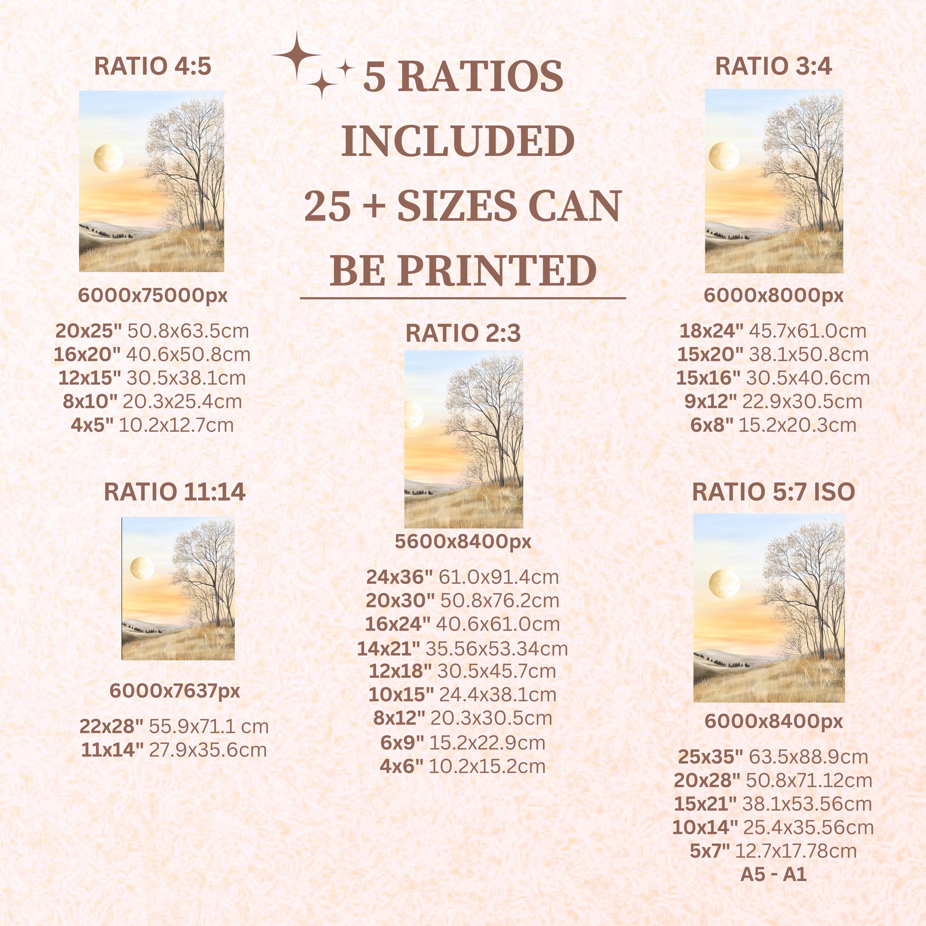 Each artwork includes 5 aspect ratios with 25+ print sizes. Most standard frames are covered. One custom resize per purchase available—message before ordering.