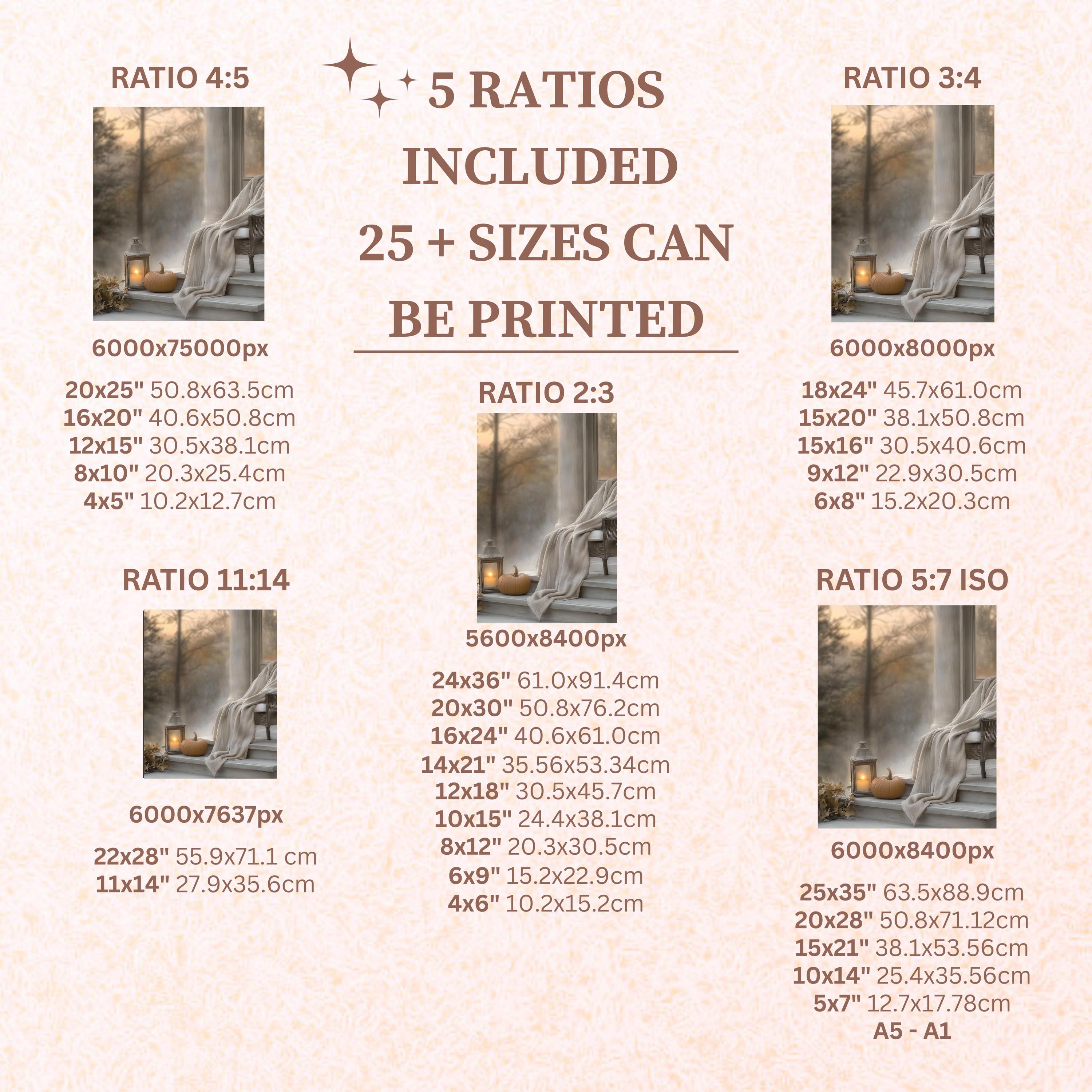 Each artwork includes 5 aspect ratios with 25+ print sizes. Most standard frames are covered. One custom resize per purchase available—message before ordering.