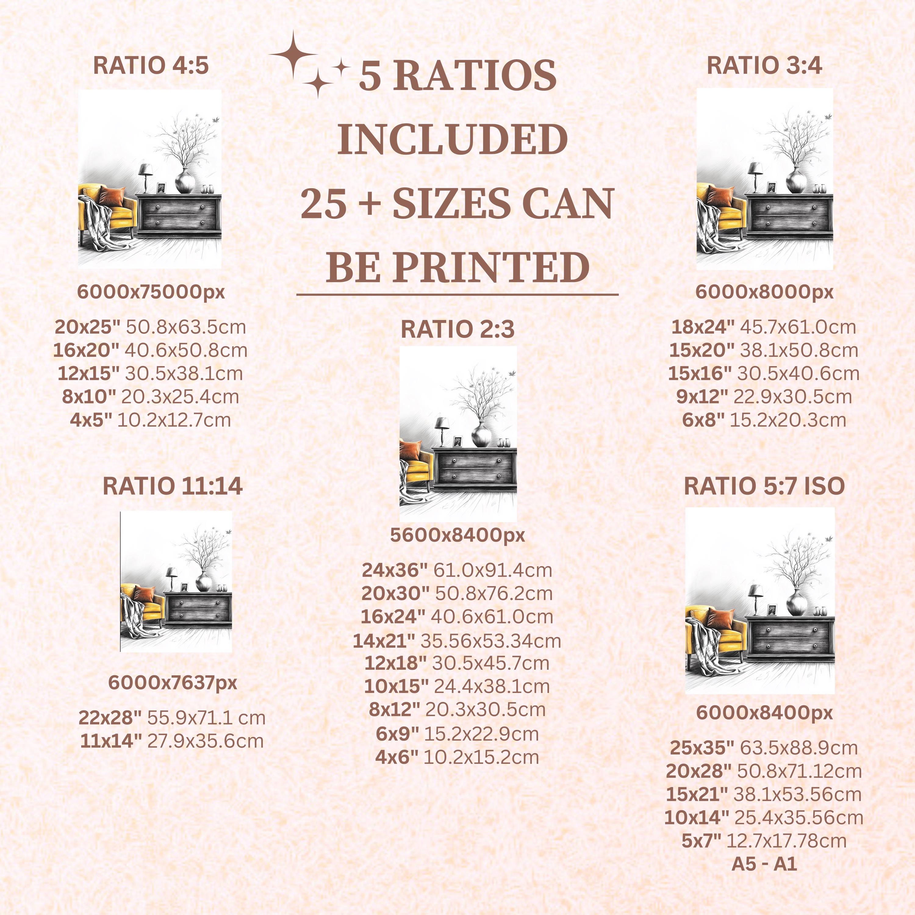Each artwork includes 5 aspect ratios with 25+ print sizes. Most standard frames are covered. One custom resize per purchase available—message before ordering.
