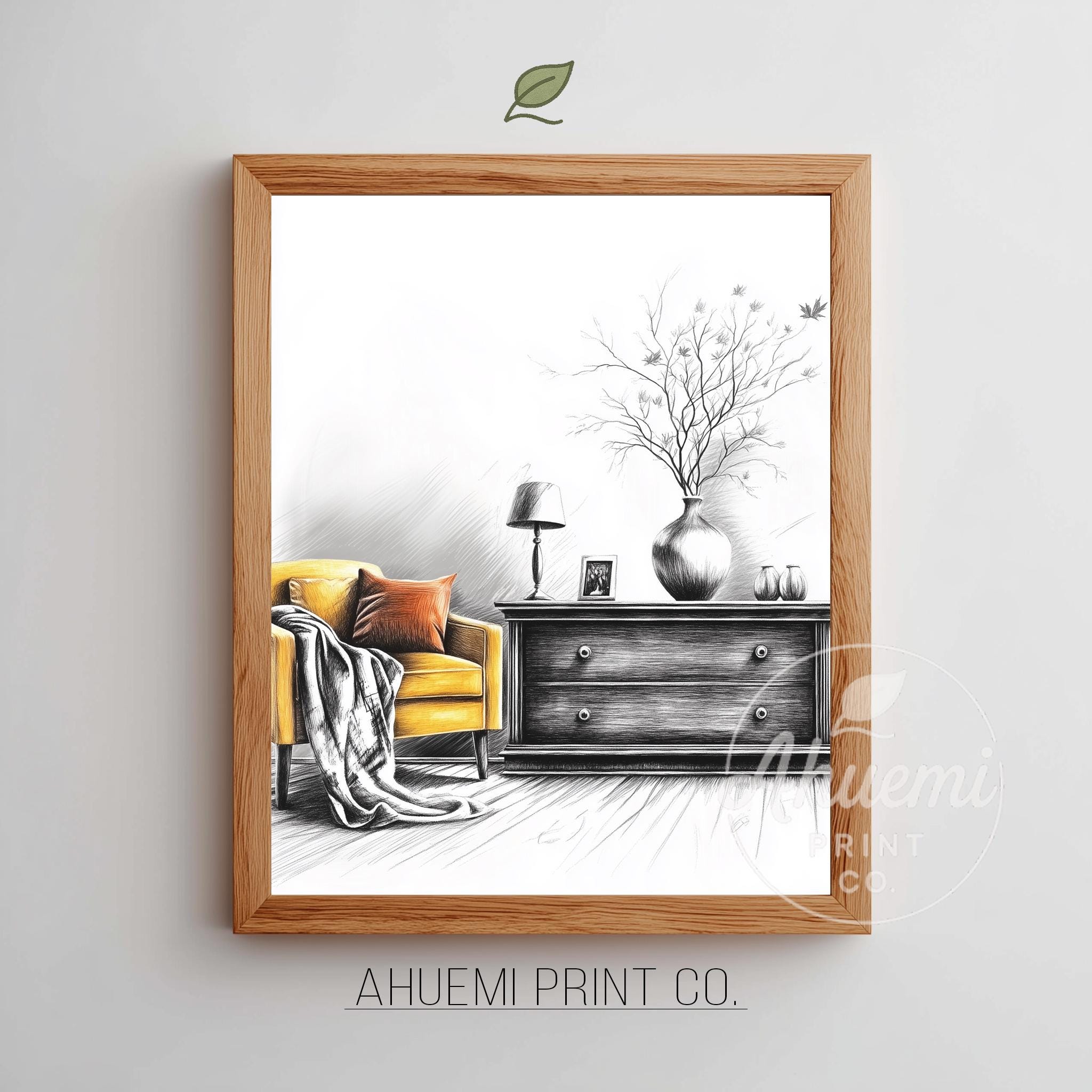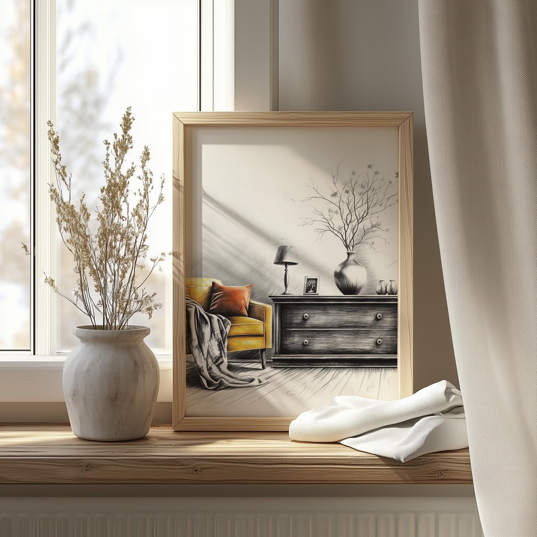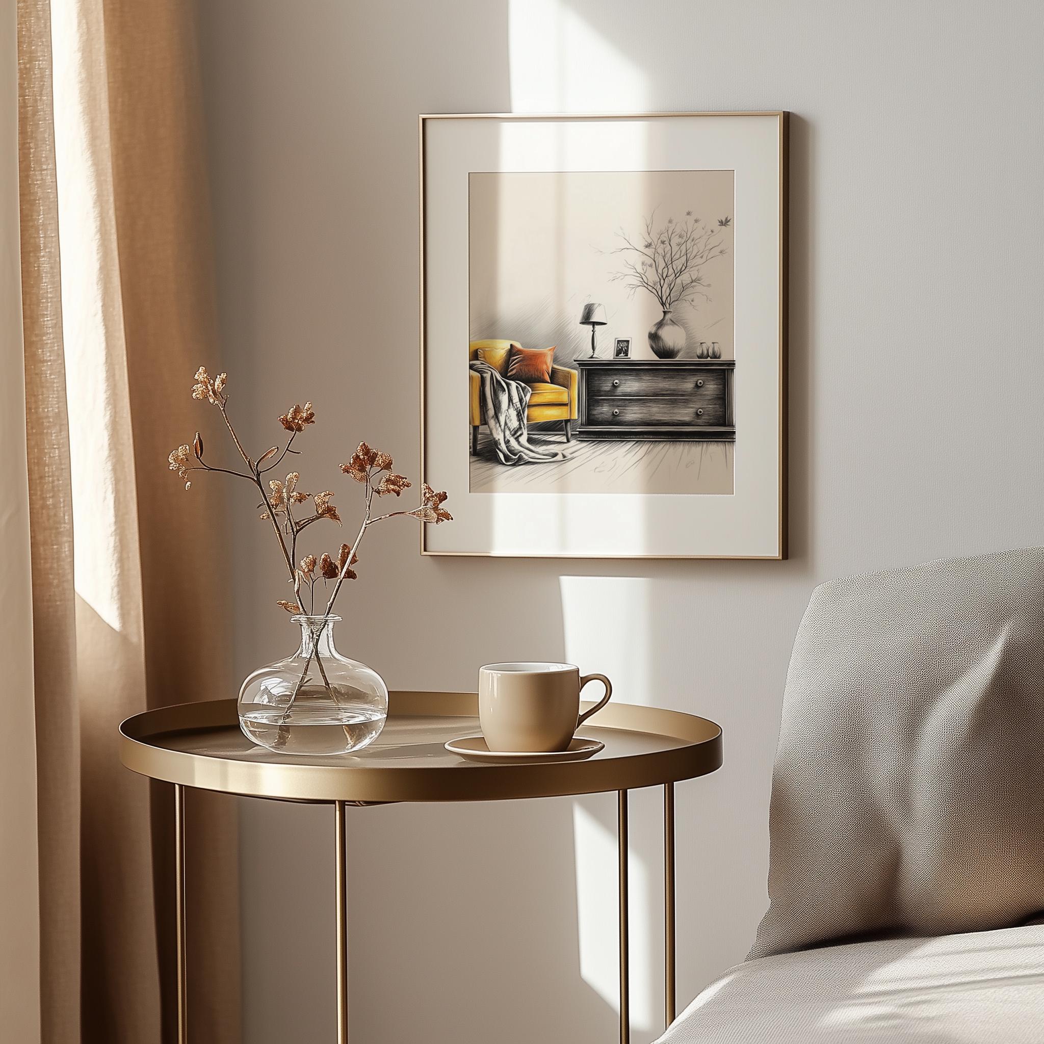 Immerse yourself in the charm with this rustic painting ofa cozy autumn interior featuring a vintage yellow armchair surrounded by warm hues and inviting textures. An instantly downloadable print, it's perfect for elevating your decor with budget friendly charm. This gives you the flexibility to customize the size, frame, and material according to your personal taste and space, ensuring a perfect fit for your walls.