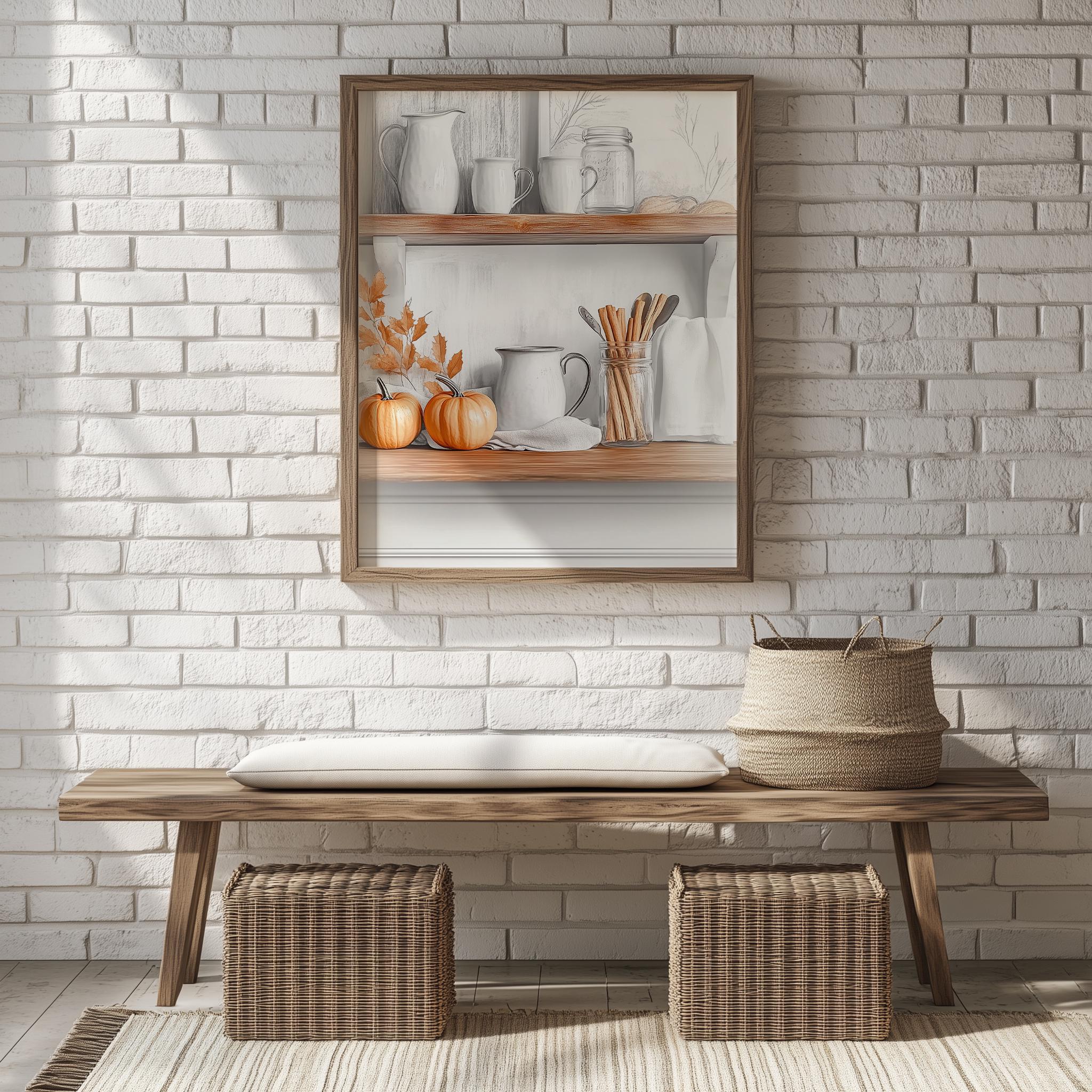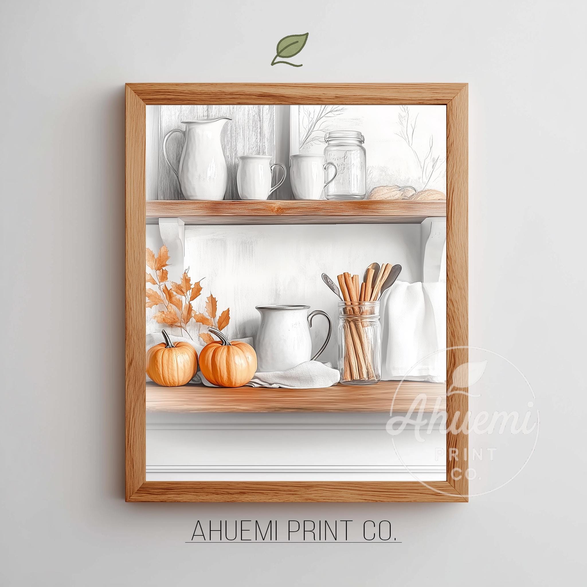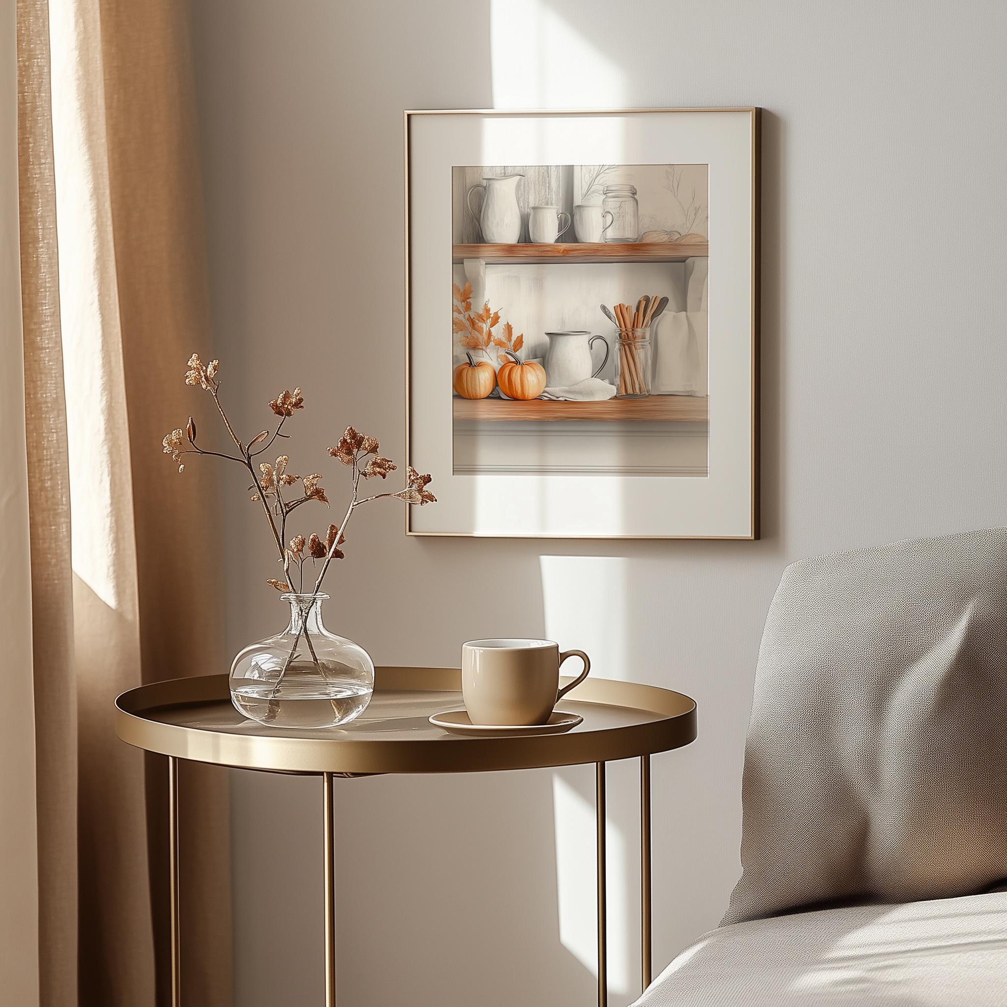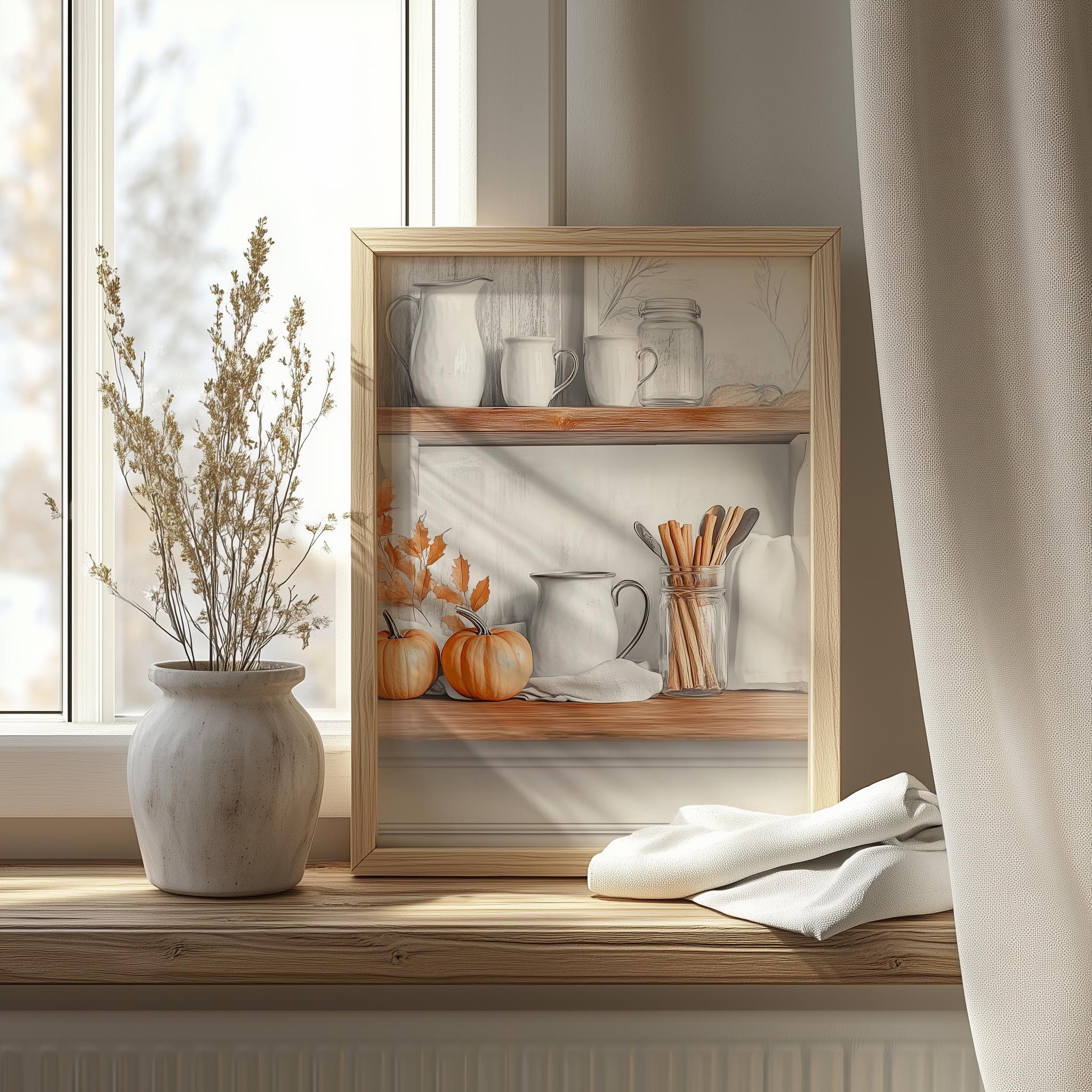 Immerse yourself in the charm with this rustic painting ofa cozy autumn kitchen scene, featuring neutral ceramic mugs arranged with seasonal foliage and rustic decor. An instantly downloadable print, it's perfect for elevating your decor with budget friendly charm. This gives you the flexibility to customize the size, frame, and material according to your personal taste and space, ensuring a perfect fit for your walls.
