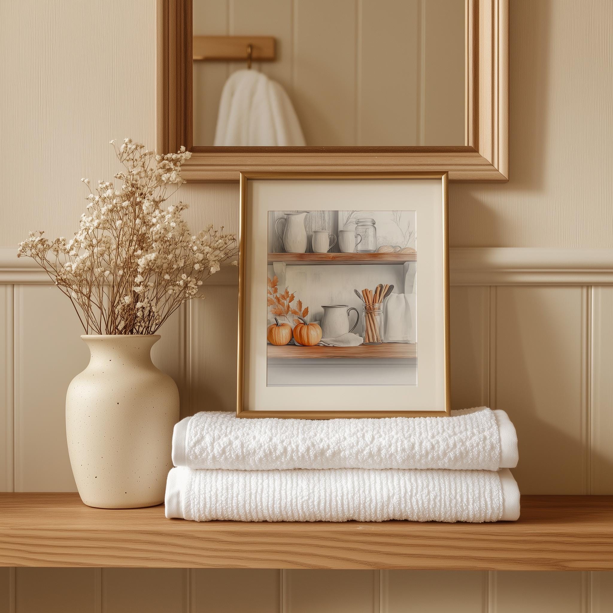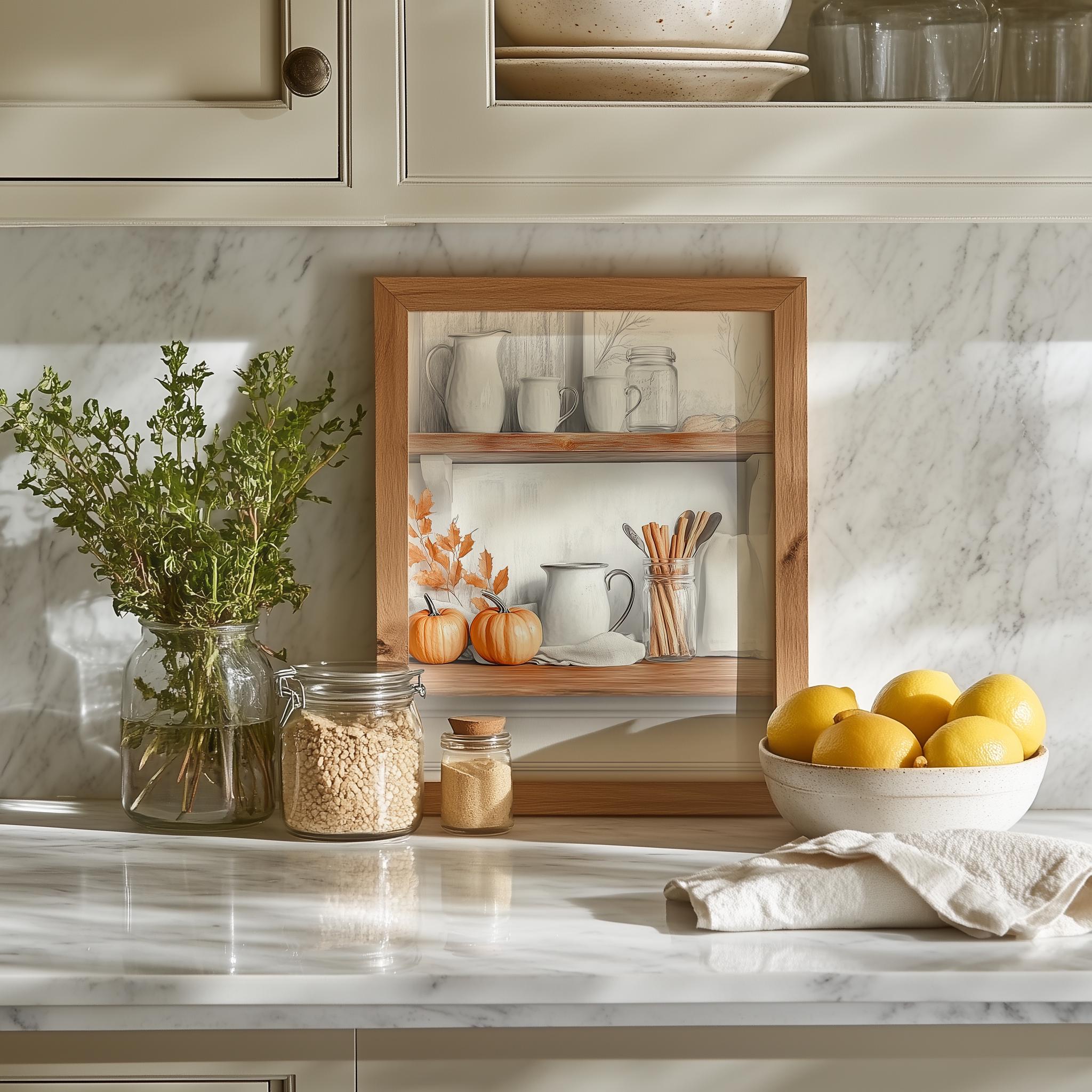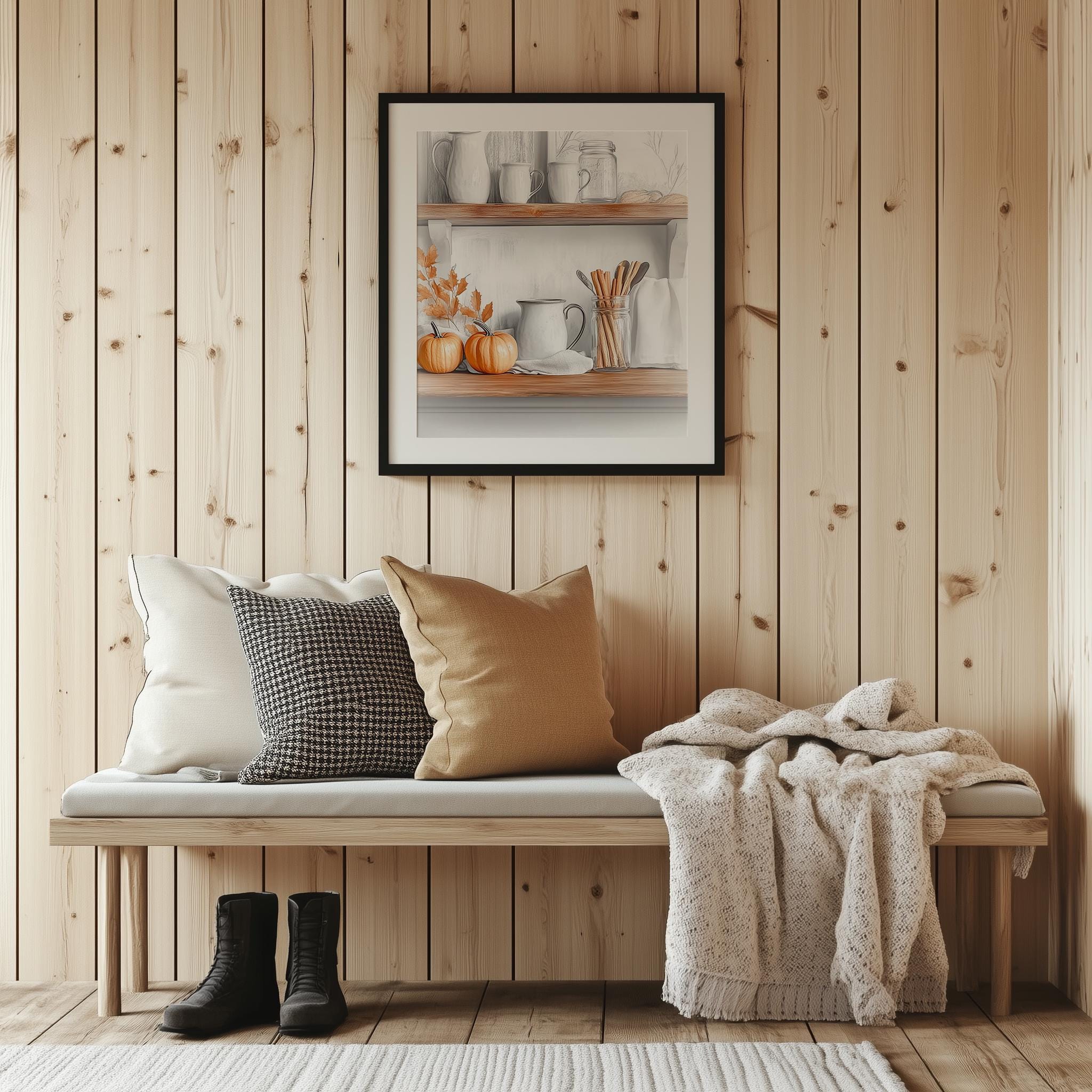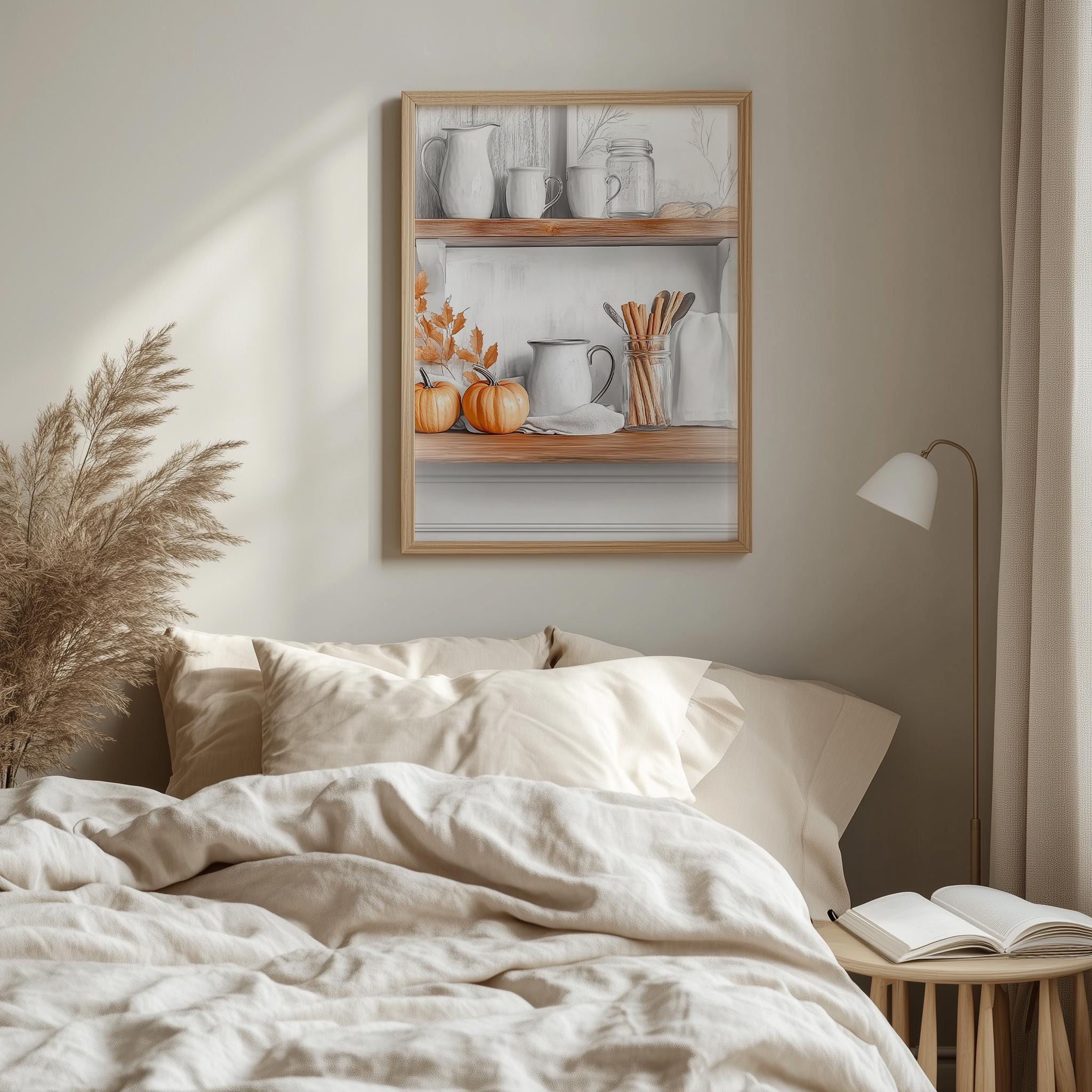 Immerse yourself in the charm with this rustic painting ofa cozy autumn kitchen scene, featuring neutral ceramic mugs arranged with seasonal foliage and rustic decor. An instantly downloadable print, it's perfect for elevating your decor with budget friendly charm. This gives you the flexibility to customize the size, frame, and material according to your personal taste and space, ensuring a perfect fit for your walls.