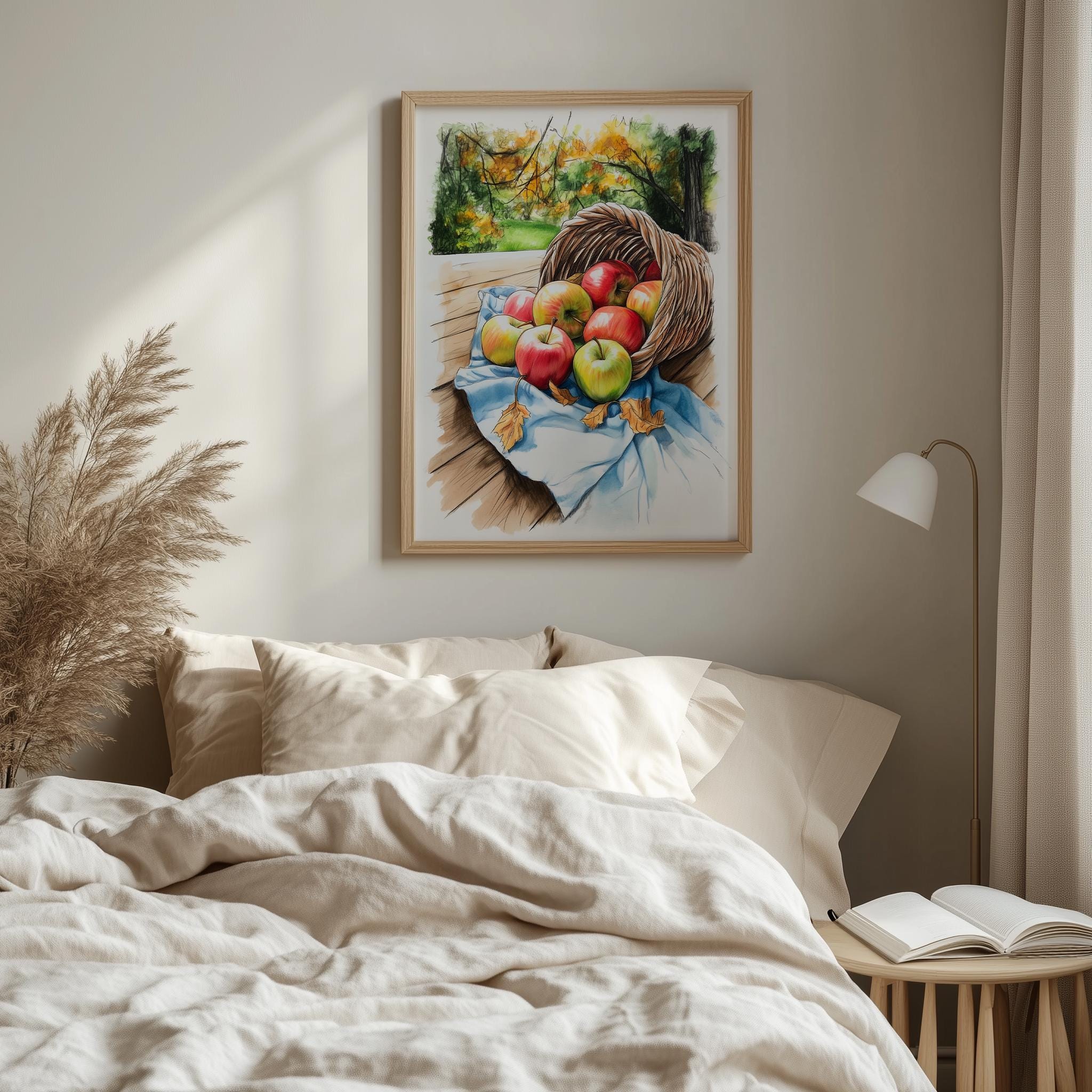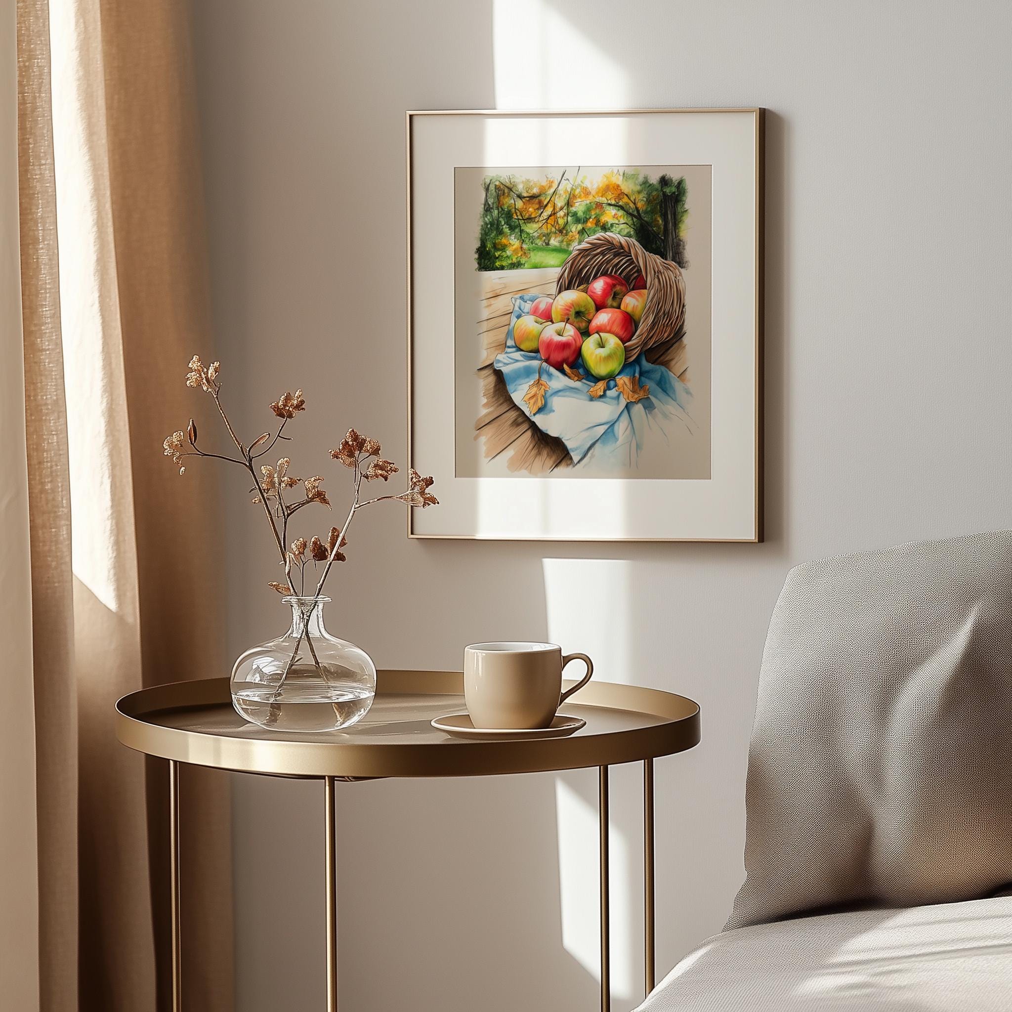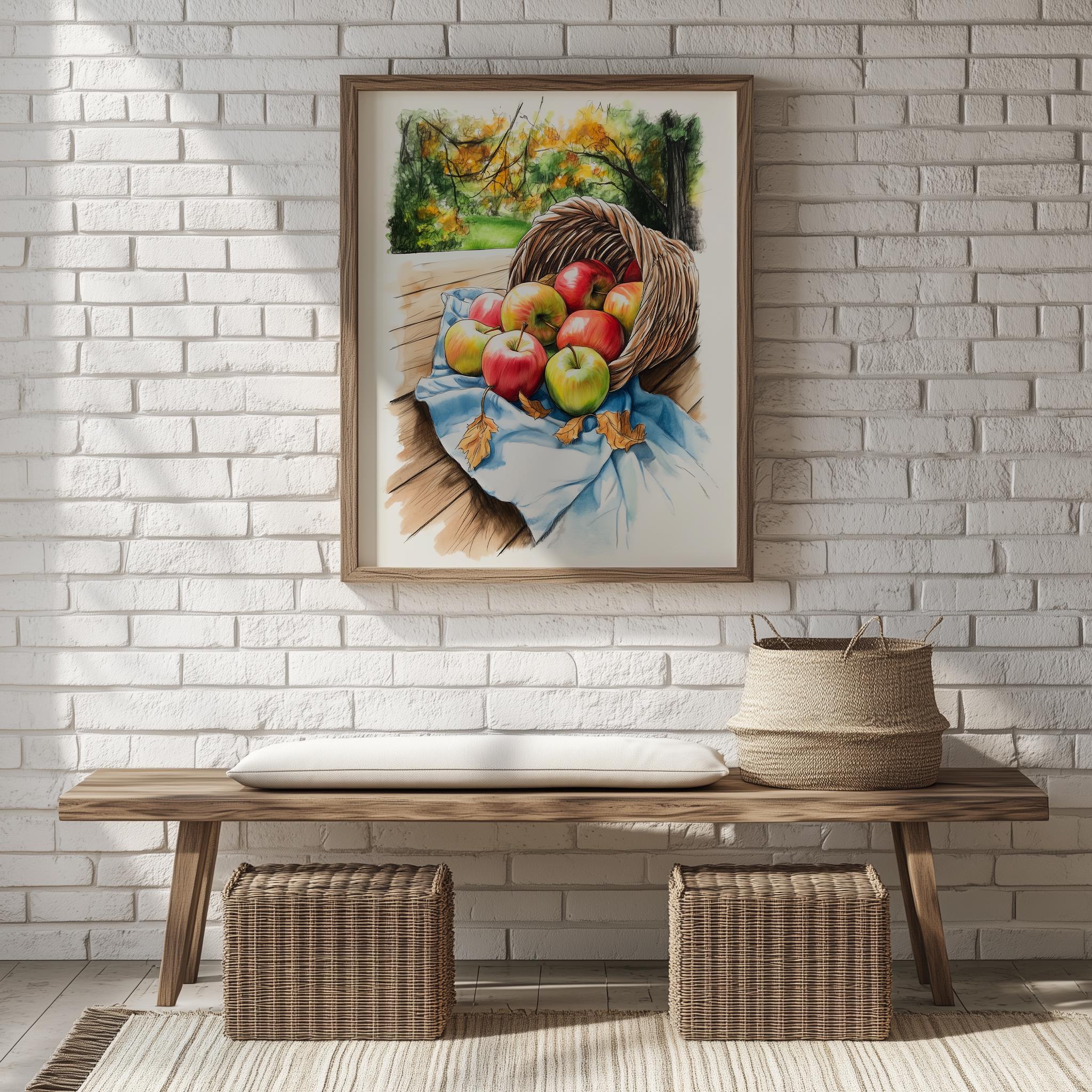 Immerse yourself in the charm with this rustic painting ofa basket of vibrant red apples nestled among autumn leaves. An instantly downloadable print, it's perfect for elevating your decor with budget friendly charm. This gives you the flexibility to customize the size, frame, and material according to your personal taste and space, ensuring a perfect fit for your walls.
