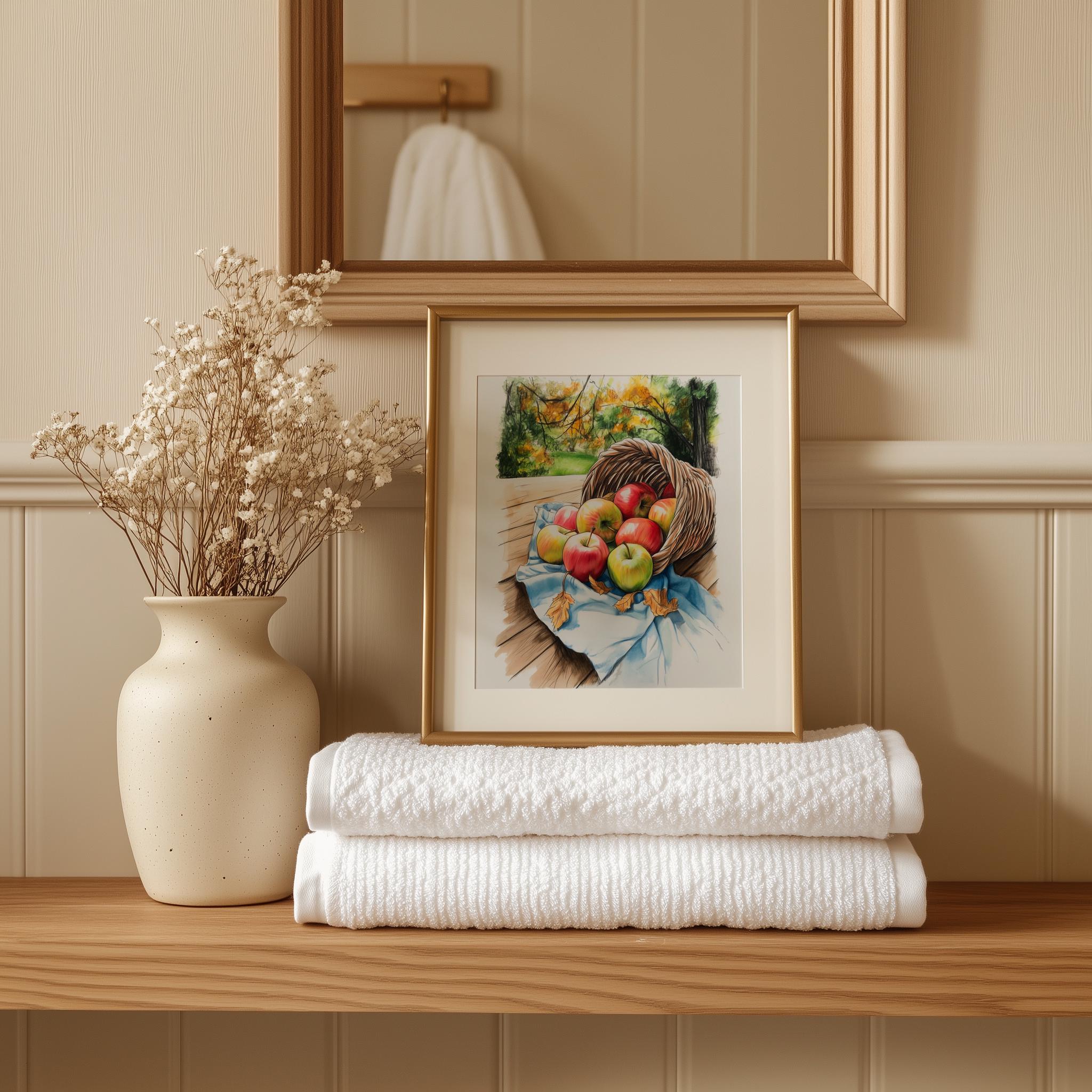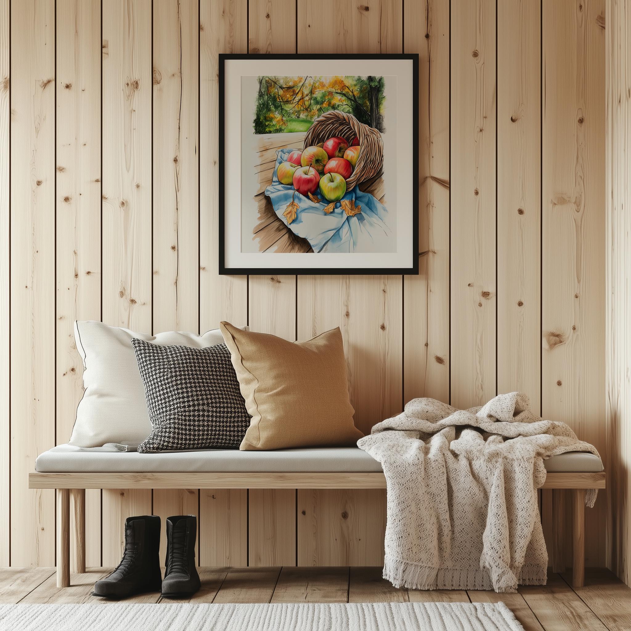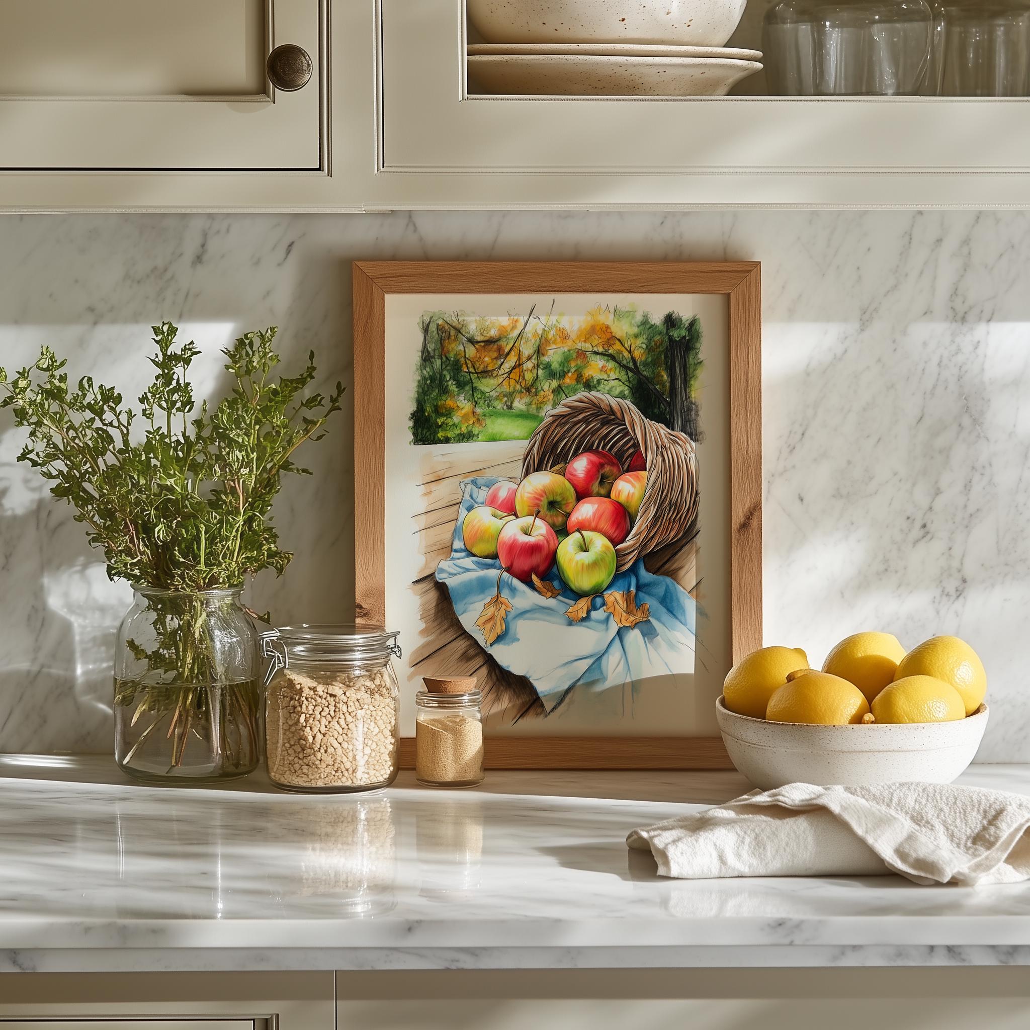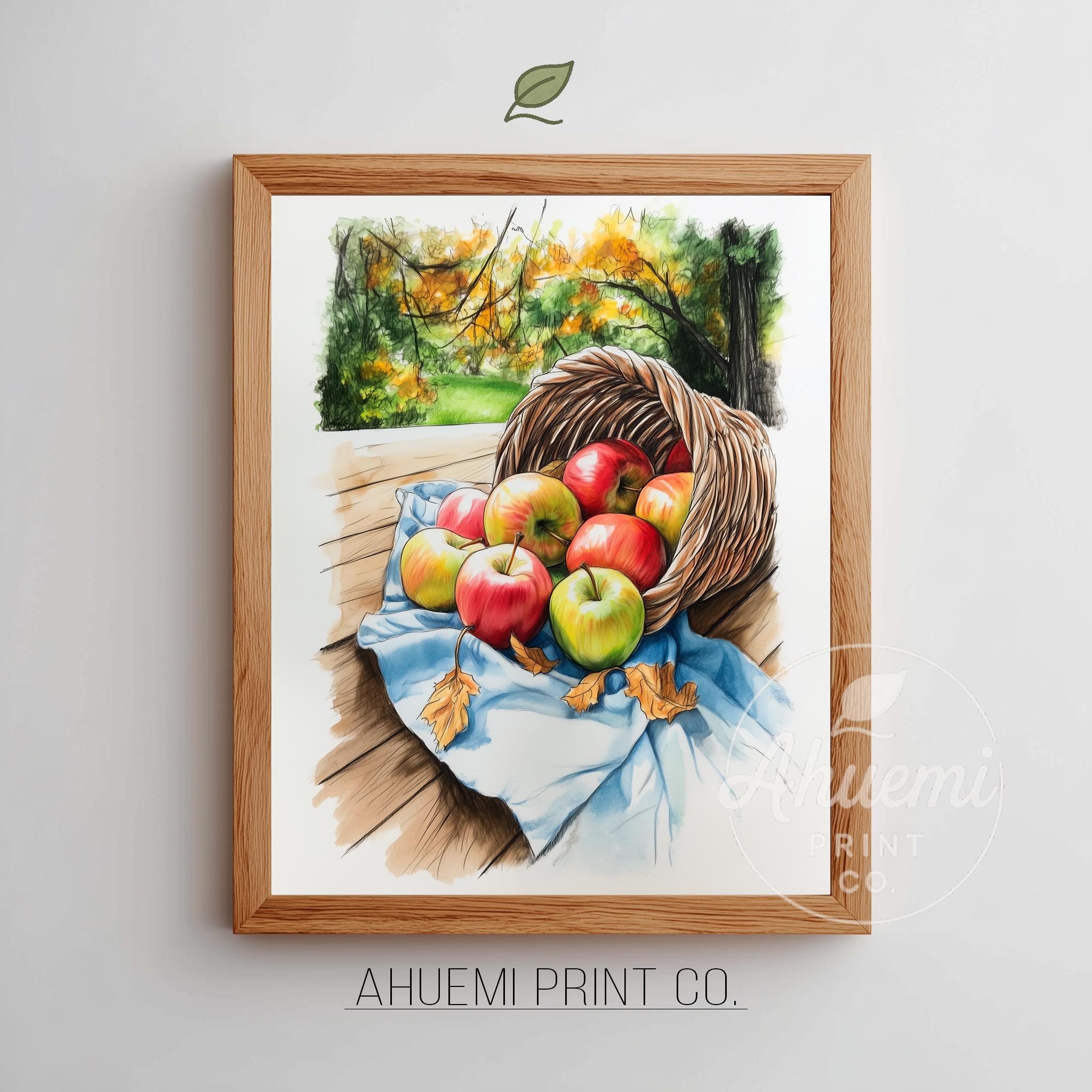 Immerse yourself in the charm with this rustic painting ofa basket of vibrant red apples nestled among autumn leaves. An instantly downloadable print, it's perfect for elevating your decor with budget friendly charm. This gives you the flexibility to customize the size, frame, and material according to your personal taste and space, ensuring a perfect fit for your walls.