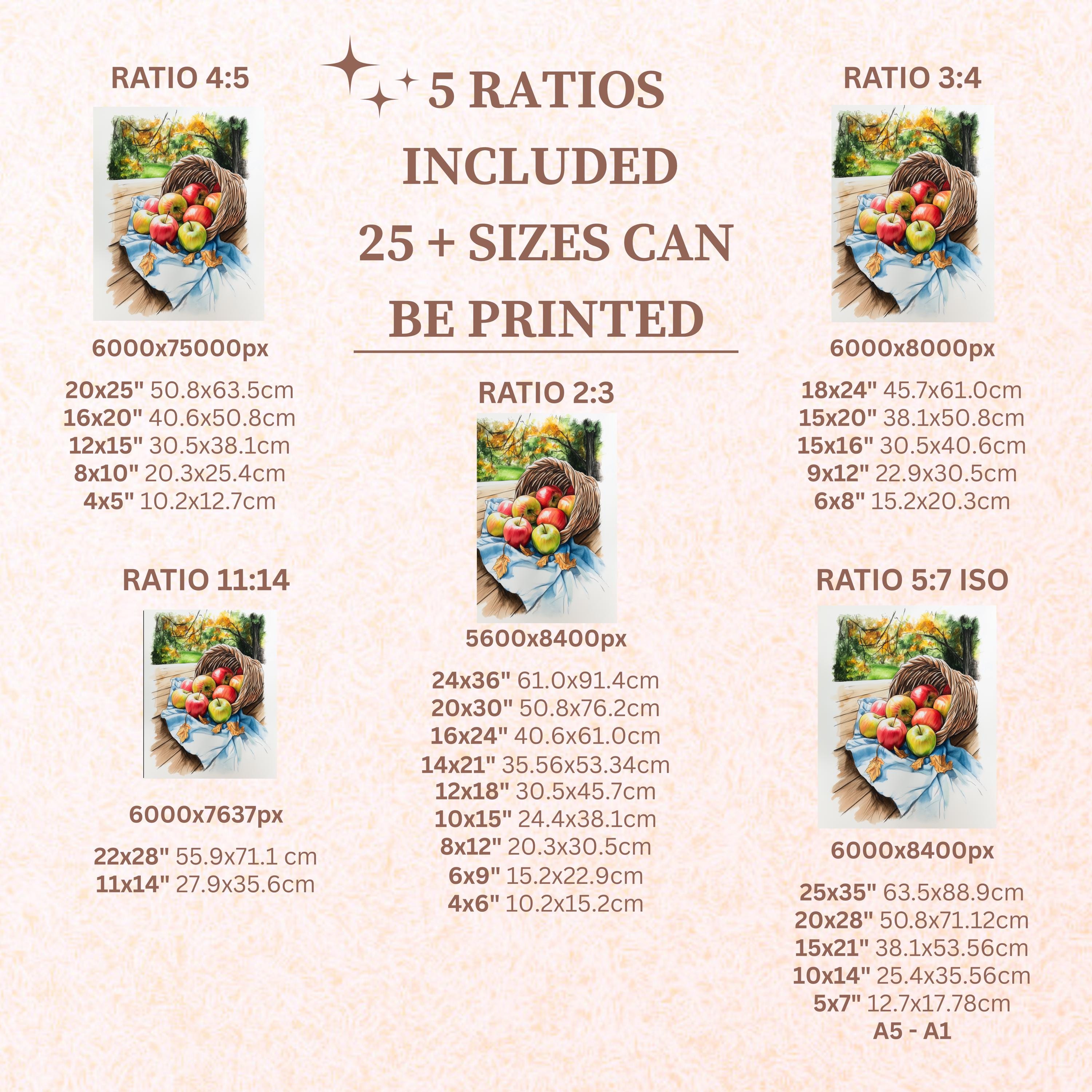 Each artwork includes 5 aspect ratios with 25+ print sizes. Most standard frames are covered. One custom resize per purchase available—message before ordering.