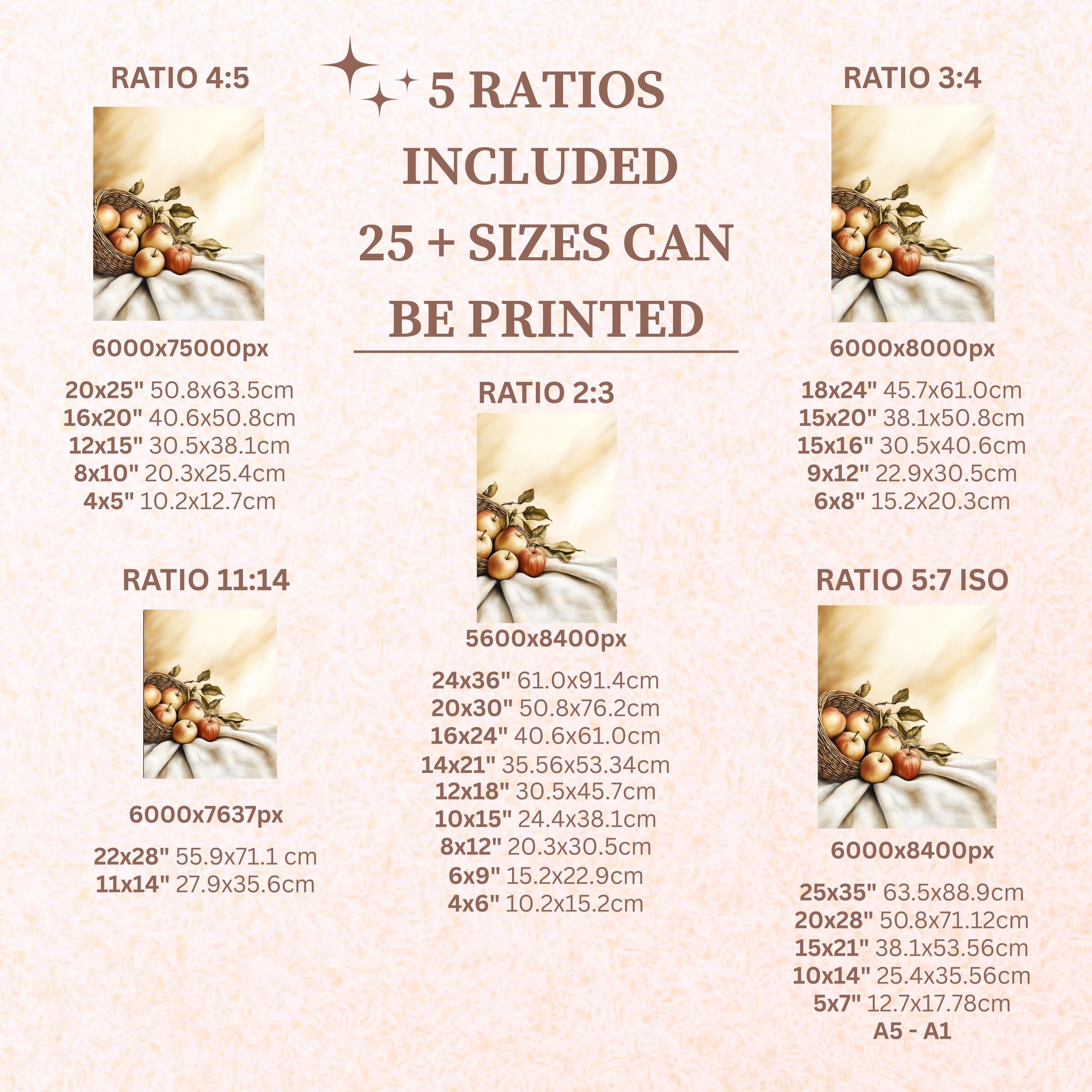 Each artwork includes 5 aspect ratios with 25+ print sizes. Most standard frames are covered. One custom resize per purchase available—message before ordering.
