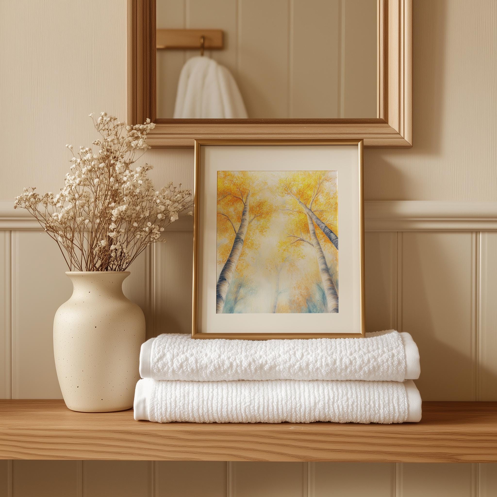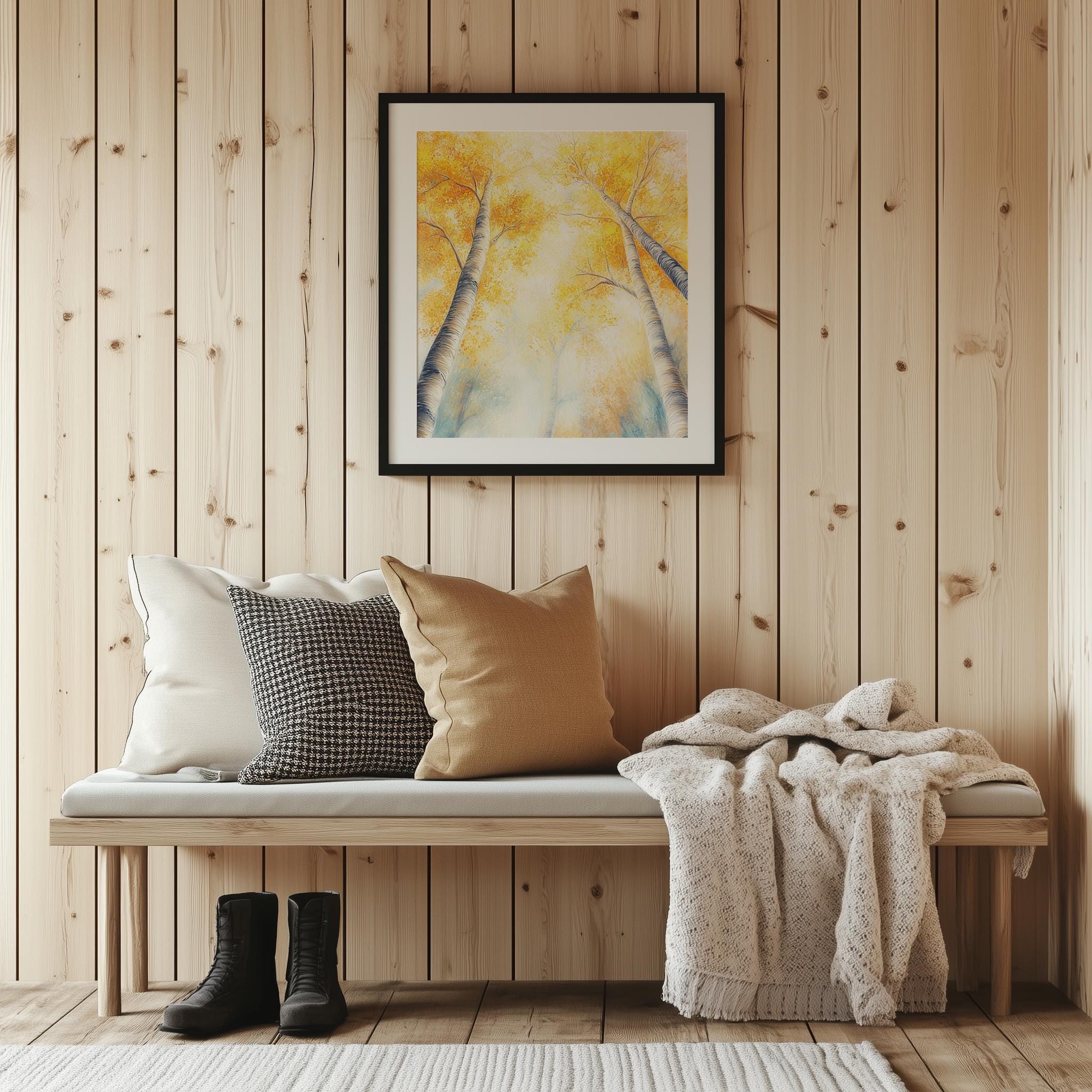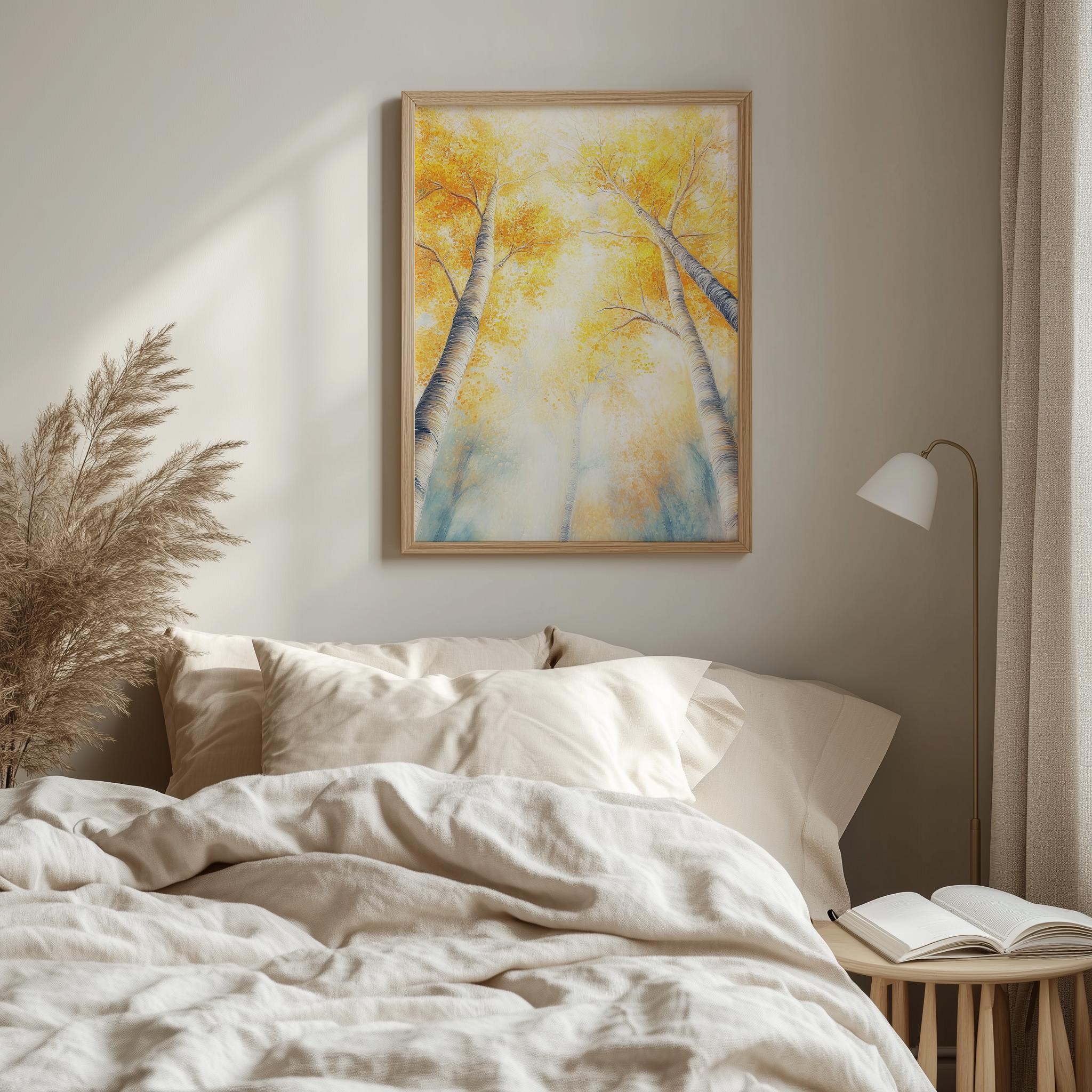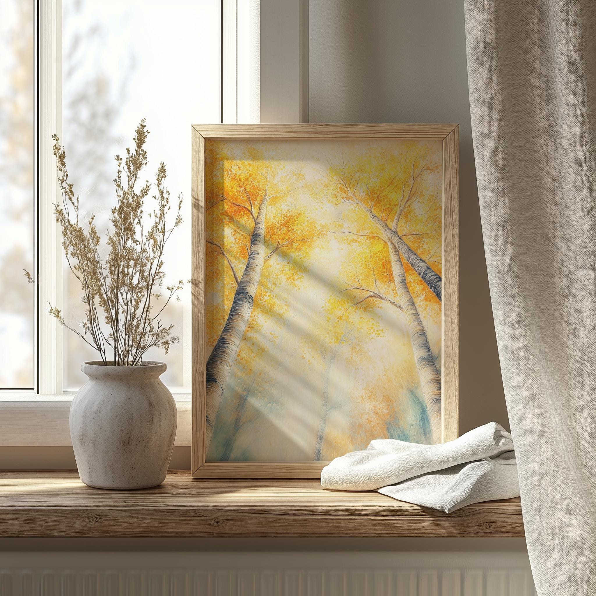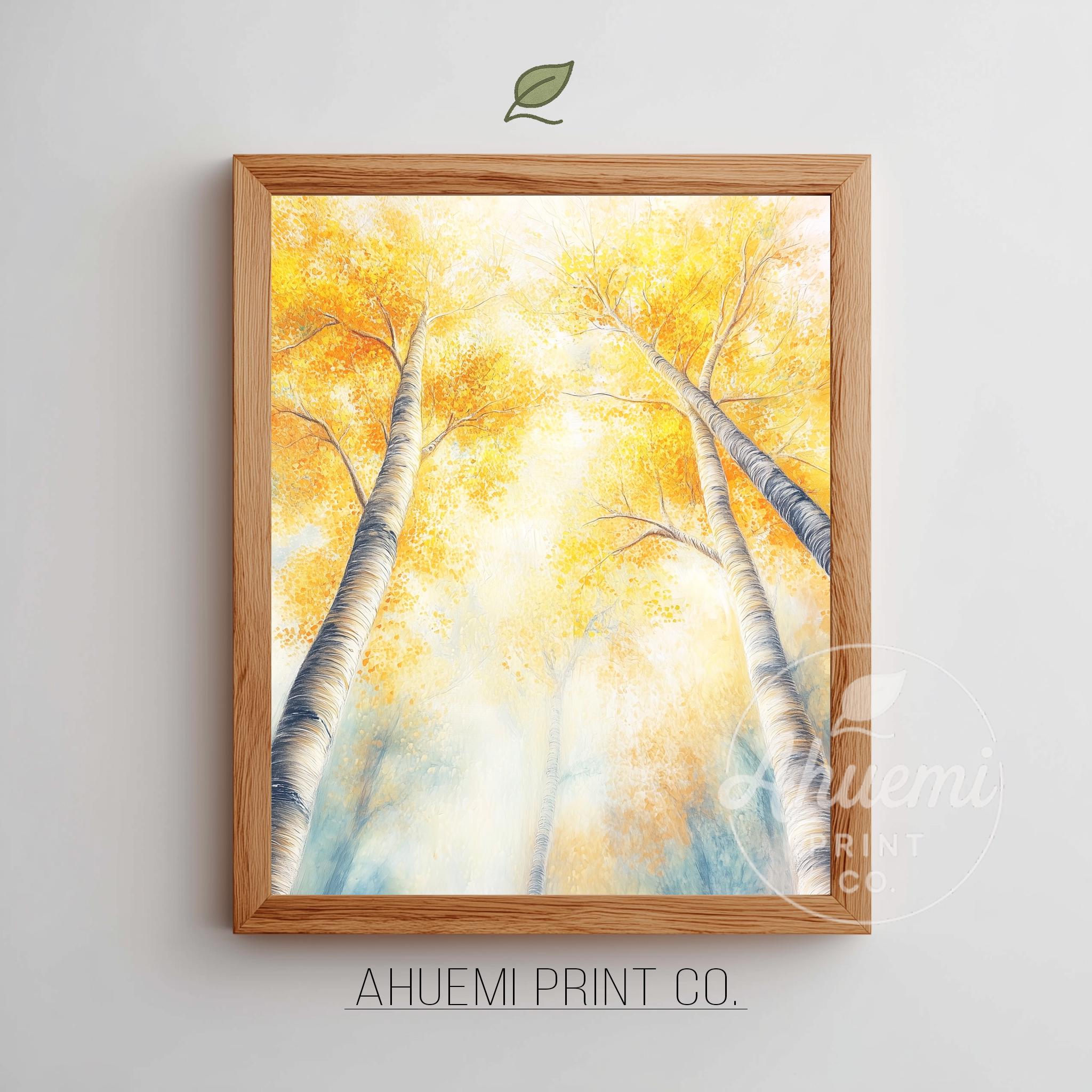 Immerse yourself in the charm with this rustic painting ofa majestic autumn tree canopy, where golden leaves gracefully dance in the gentle breeze. An instantly downloadable print, it's perfect for elevating your decor with budget friendly charm. This gives you the flexibility to customize the size, frame, and material according to your personal taste and space, ensuring a perfect fit for your walls.