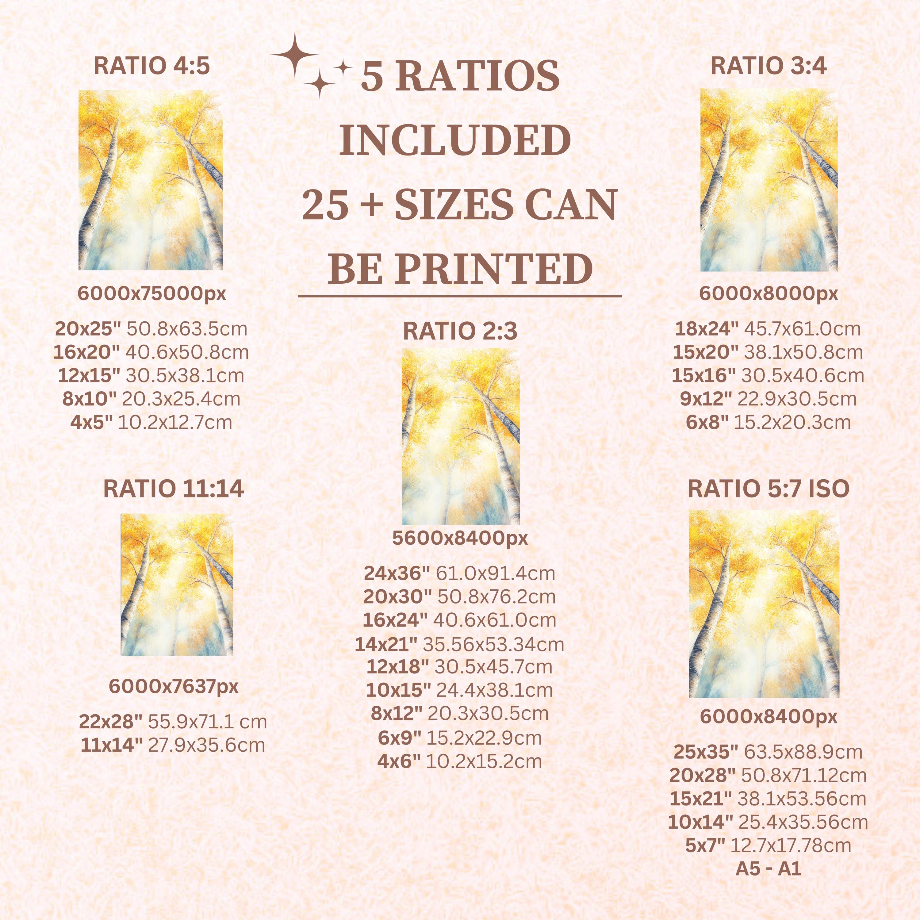 Each artwork includes 5 aspect ratios with 25+ print sizes. Most standard frames are covered. One custom resize per purchase available—message before ordering.