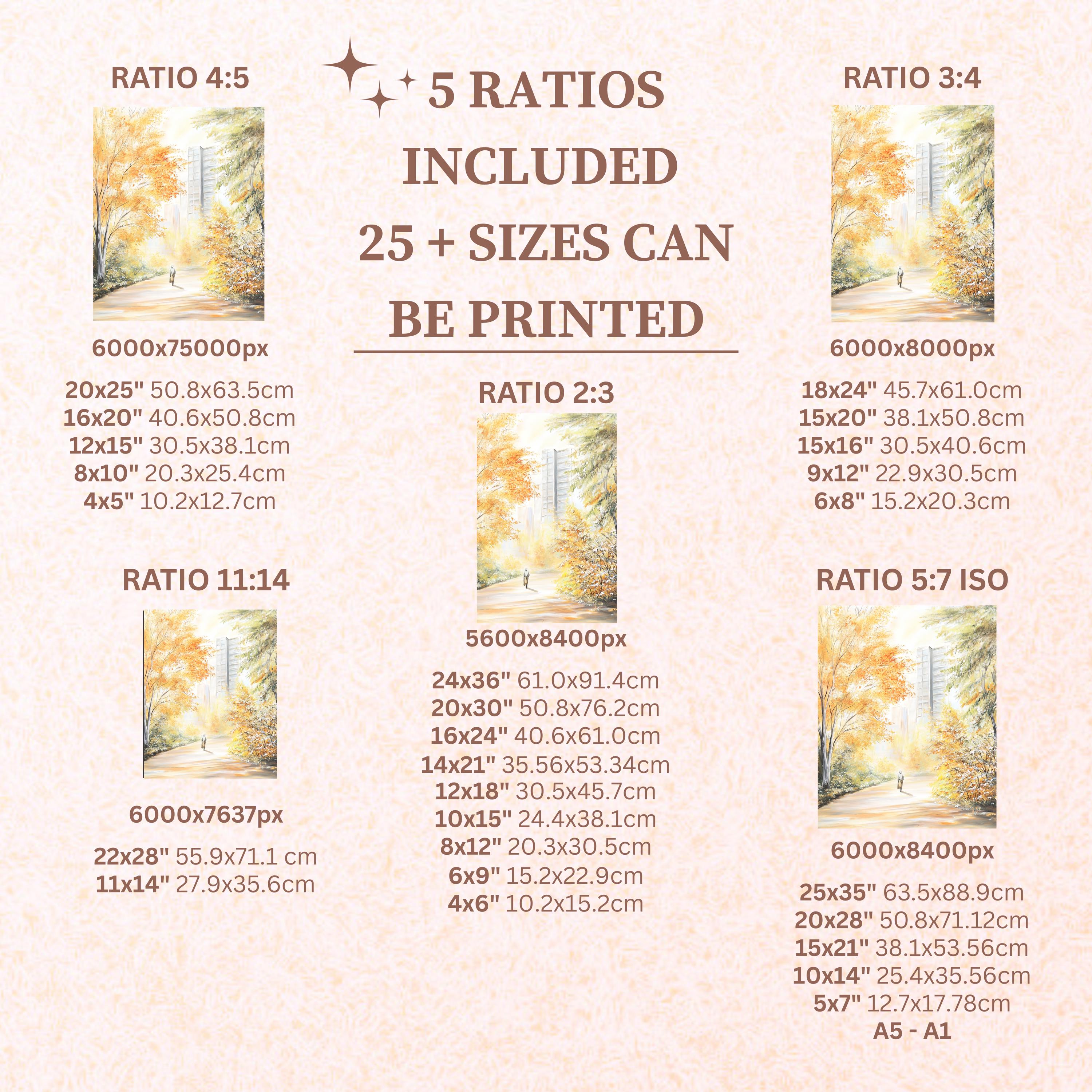 Each artwork includes 5 aspect ratios with 25+ print sizes. Most standard frames are covered. One custom resize per purchase available—message before ordering.