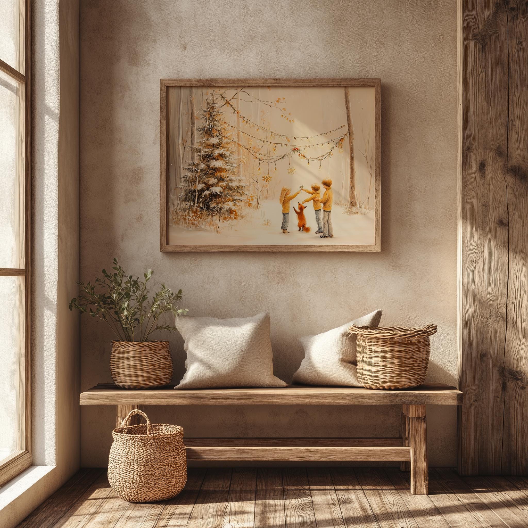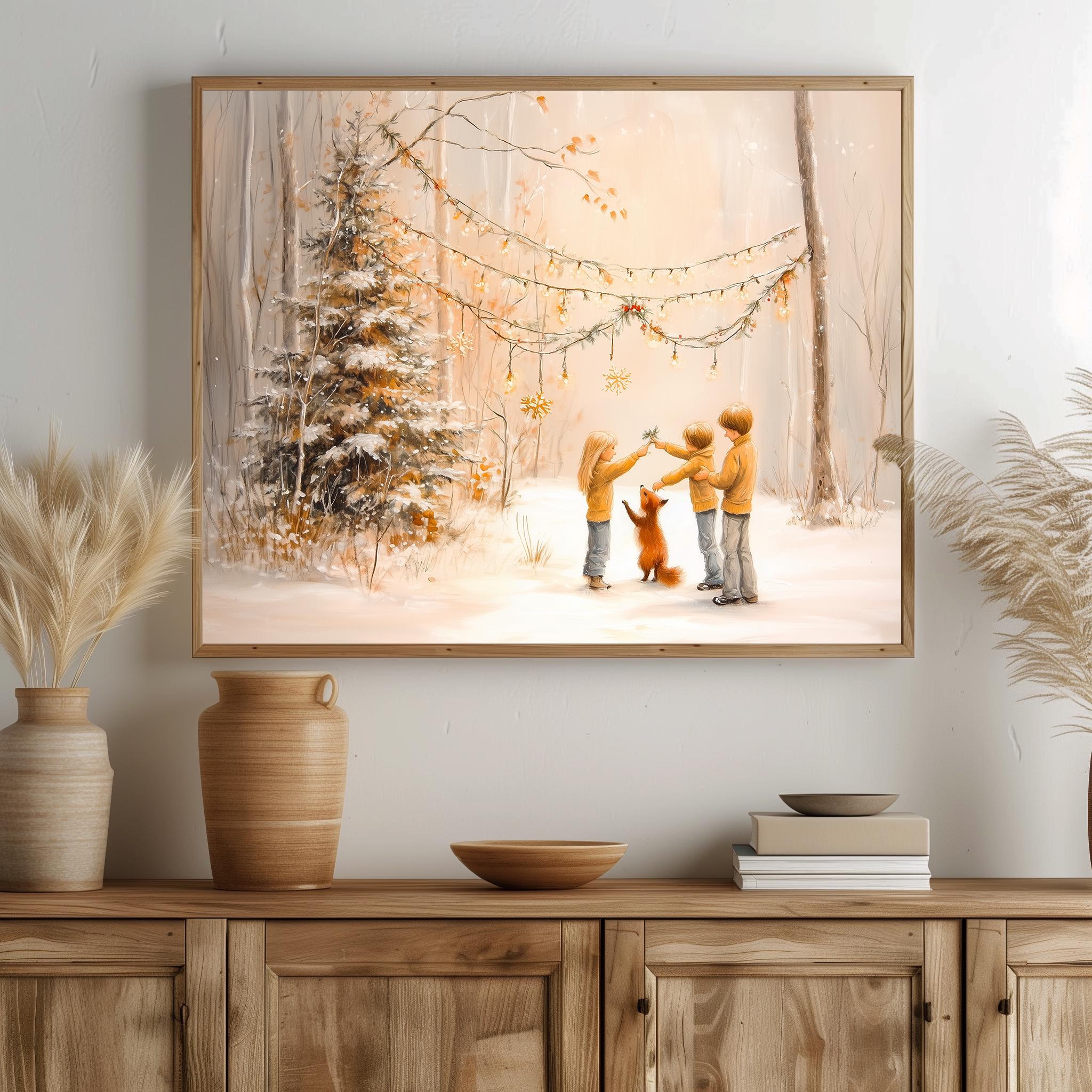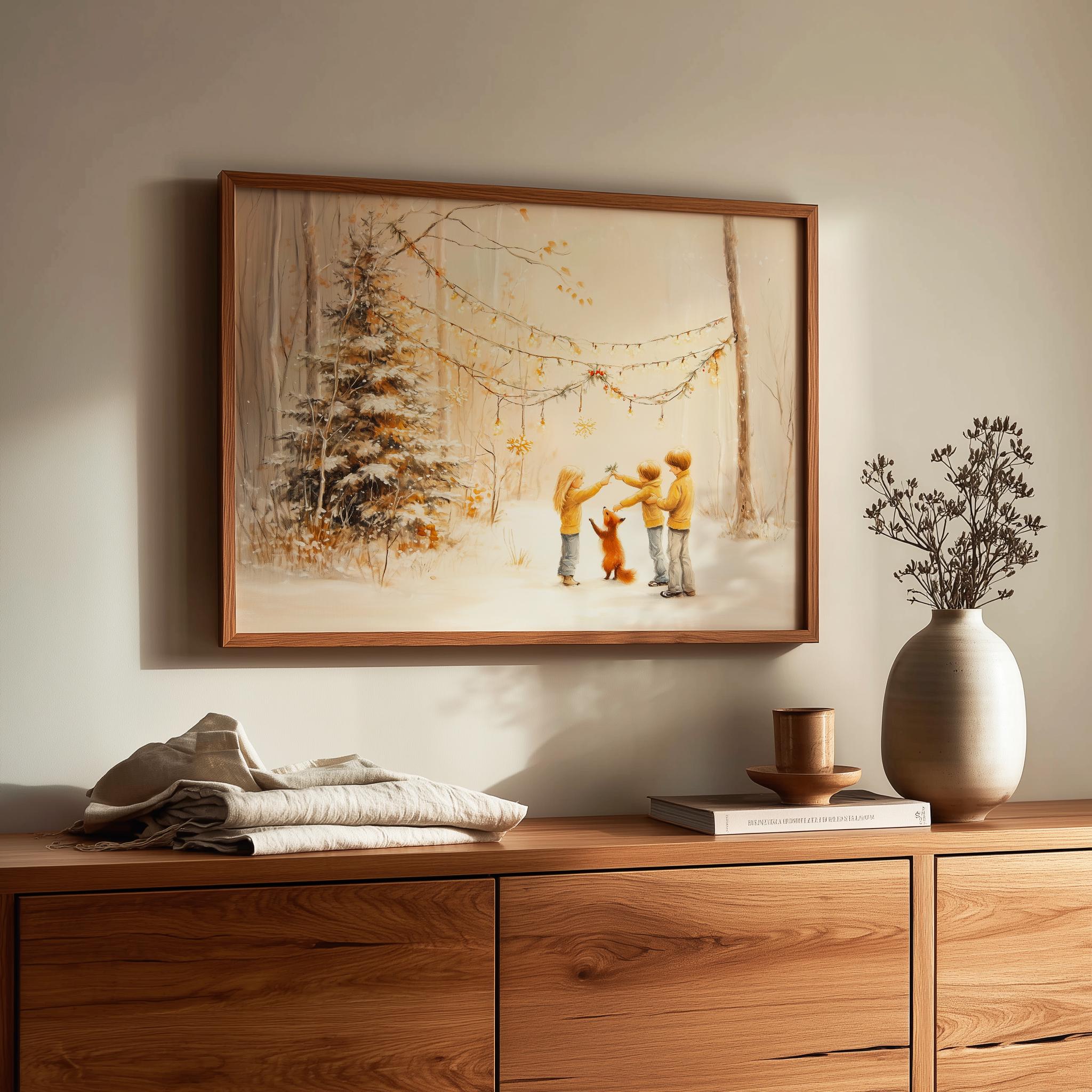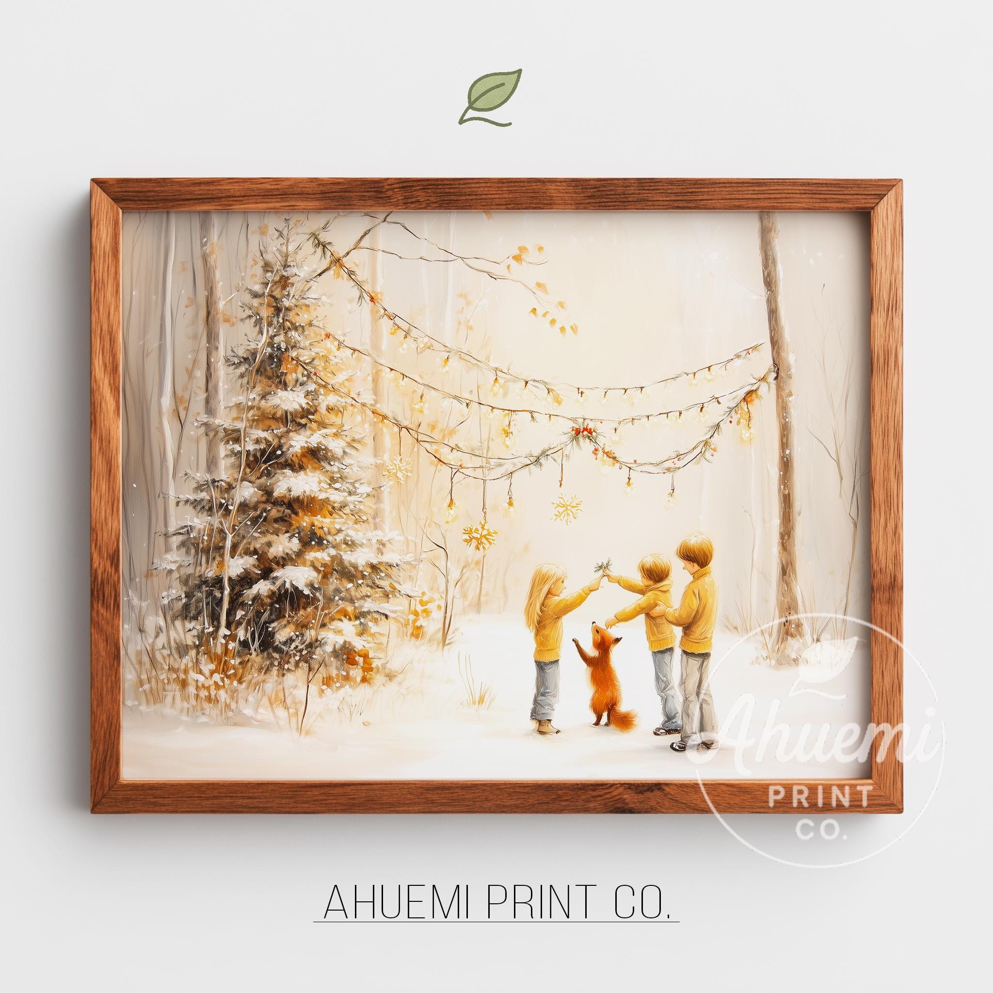Immerse yourself in the charm with this rustic painting of children joyfully stringing popcorn garlands amidst a cozy winter scene. An instantly downloadable print, it's perfect for elevating your decor with budget-friendly charm. This gives you the flexibility to customize the size, frame, and material according to your personal taste and space, ensuring a perfect fit for your walls.