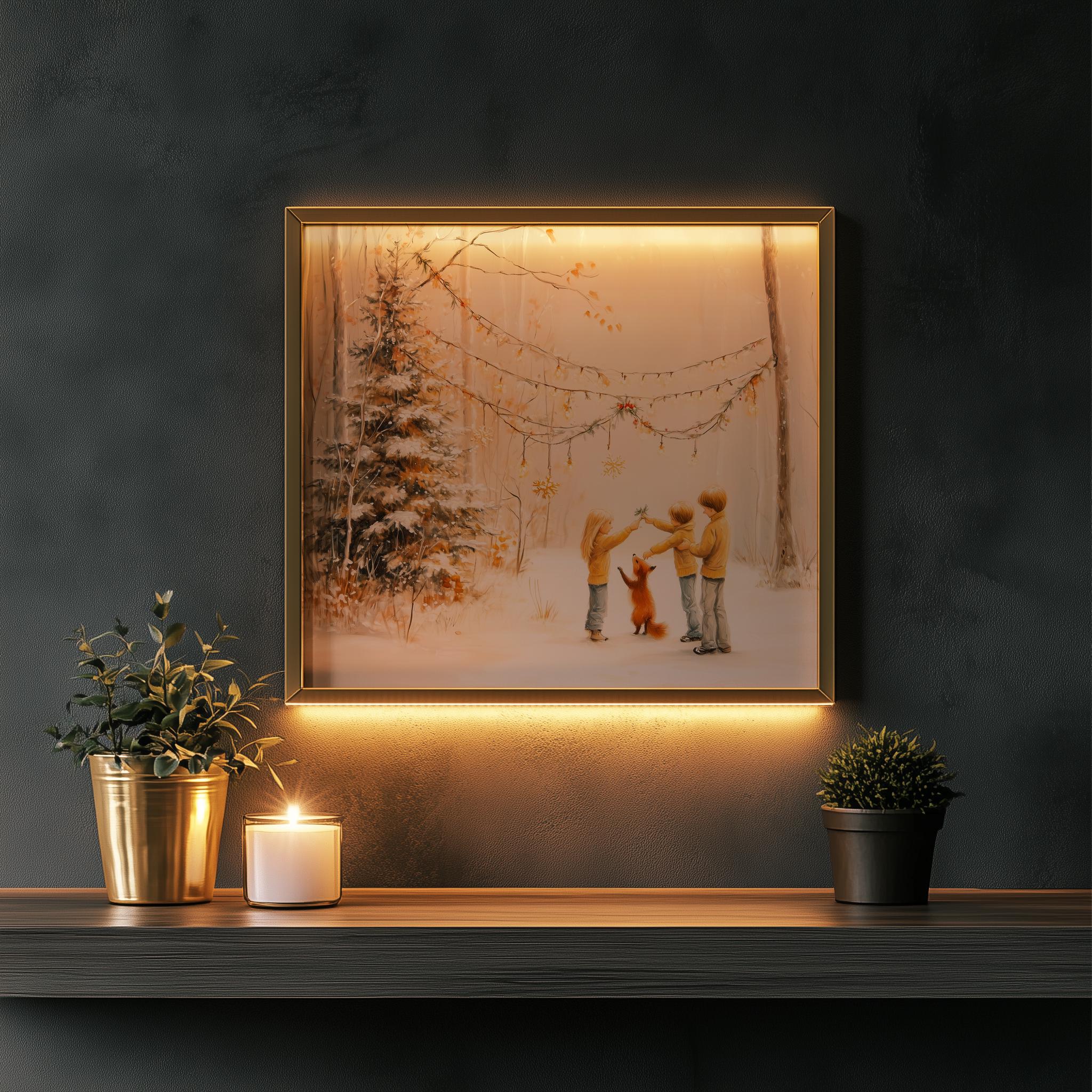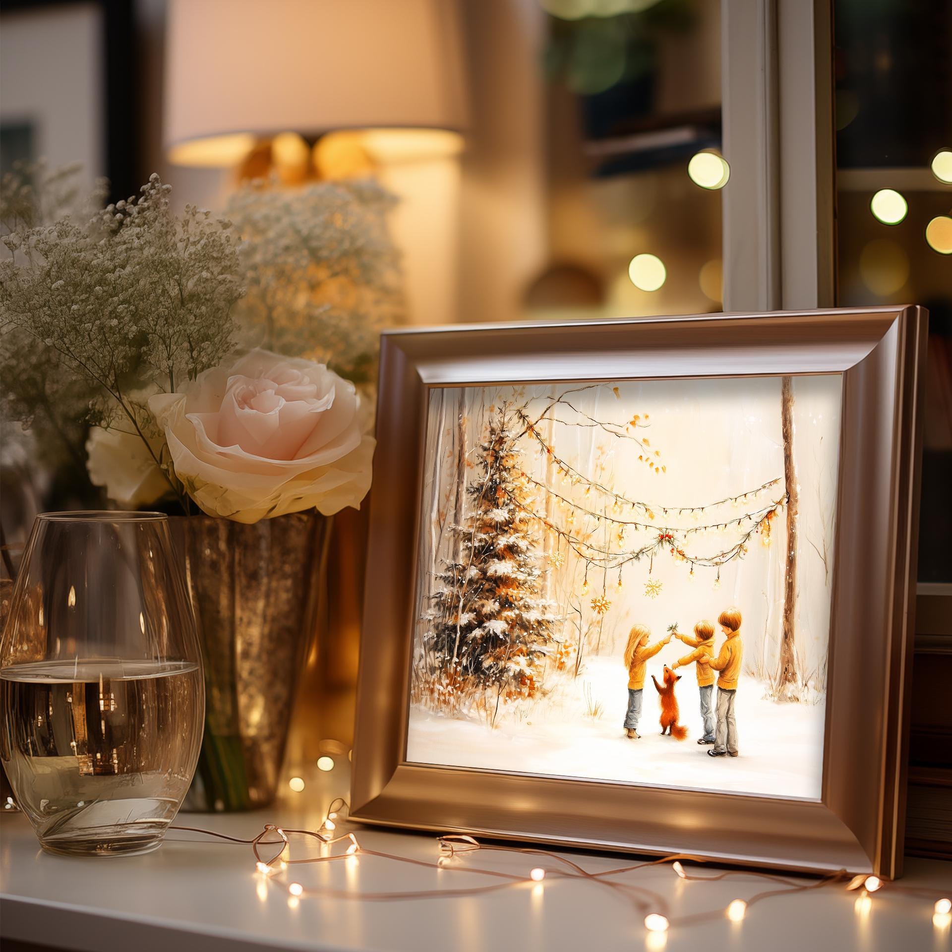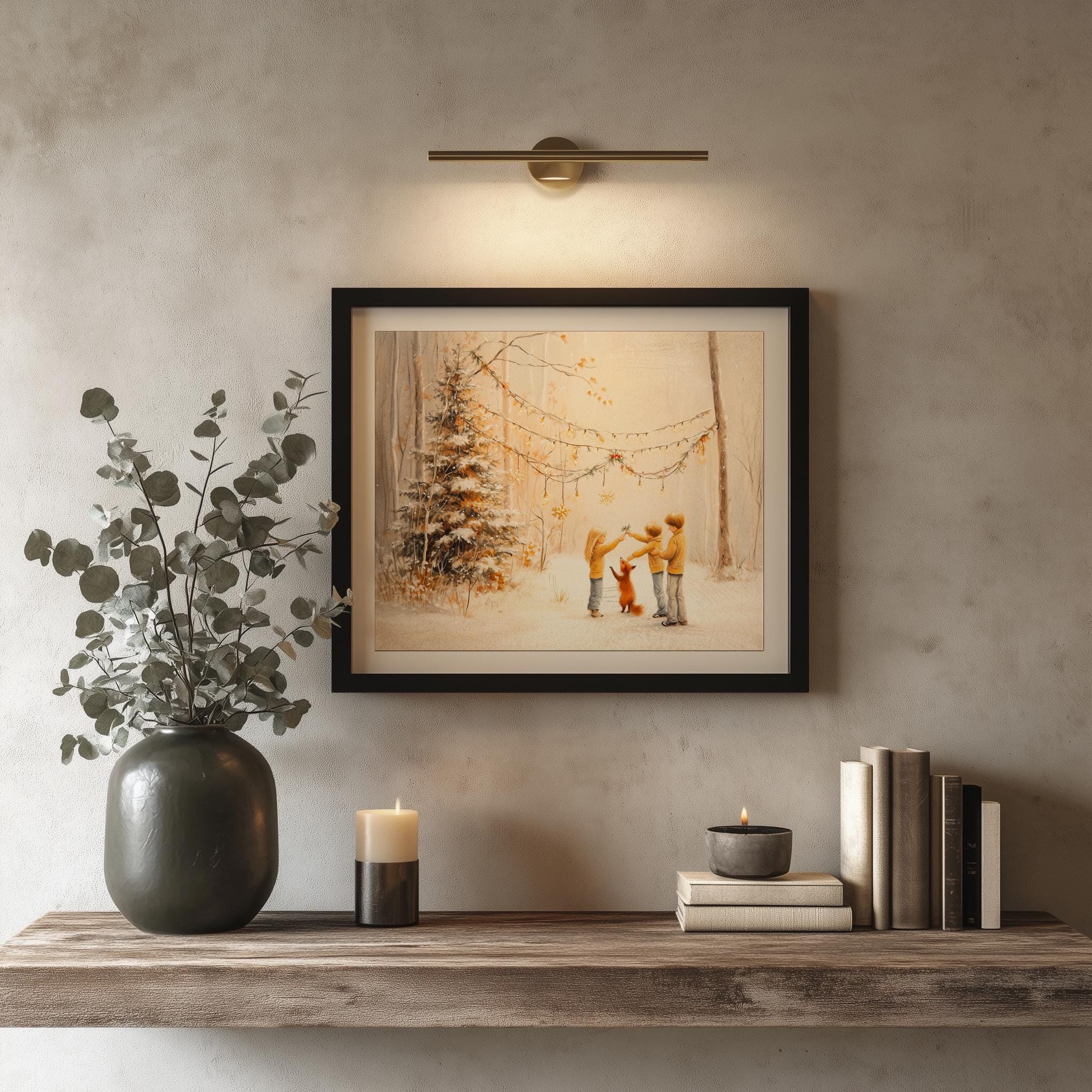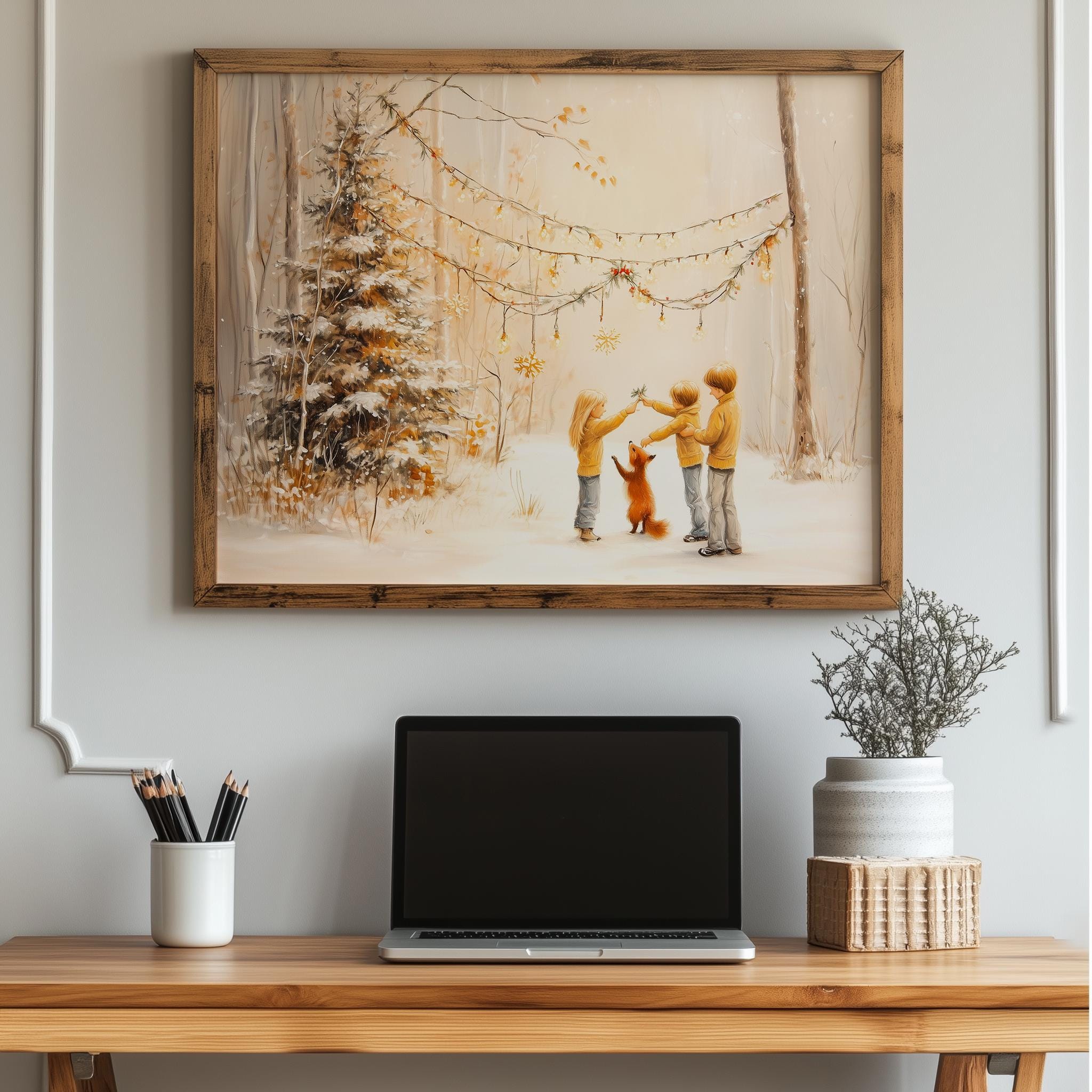 Immerse yourself in the charm with this rustic painting of children joyfully stringing popcorn garlands amidst a cozy winter scene. An instantly downloadable print, it's perfect for elevating your decor with budget-friendly charm. This gives you the flexibility to customize the size, frame, and material according to your personal taste and space, ensuring a perfect fit for your walls.
